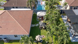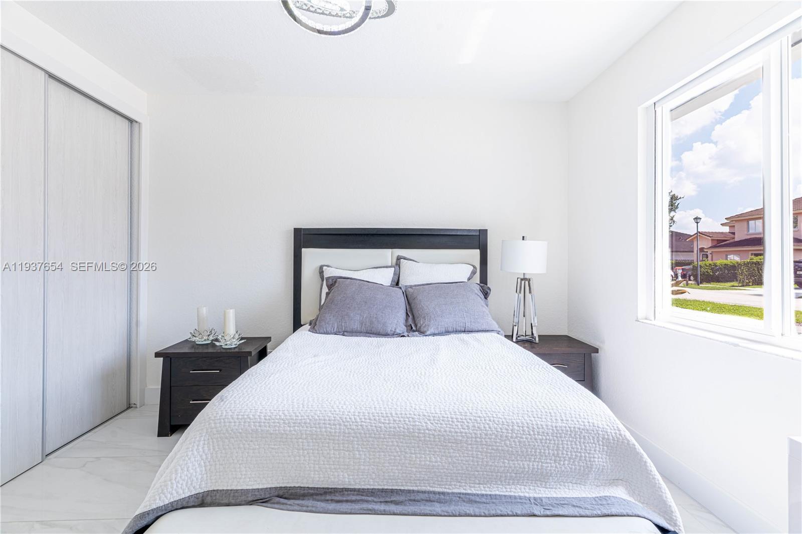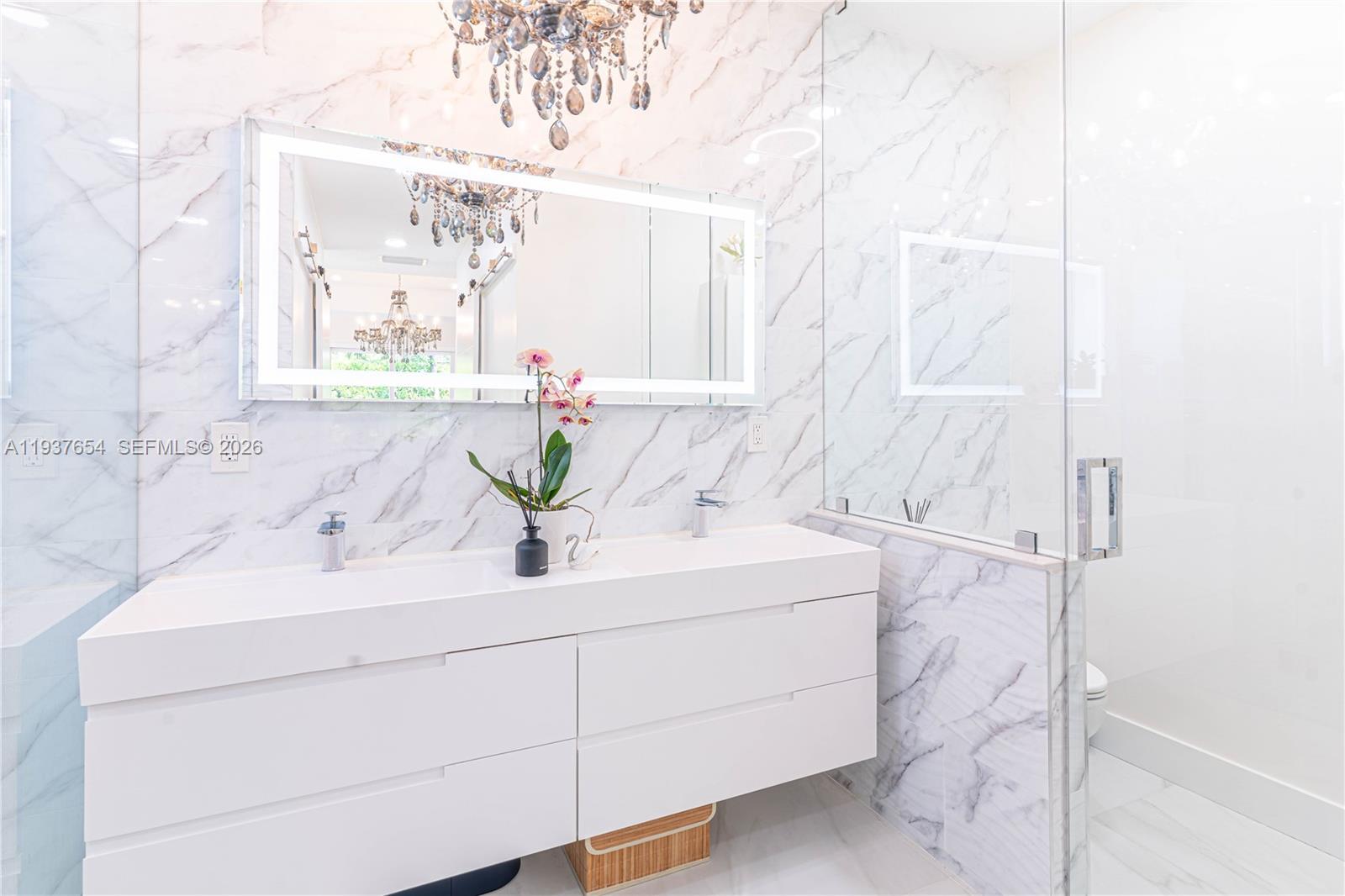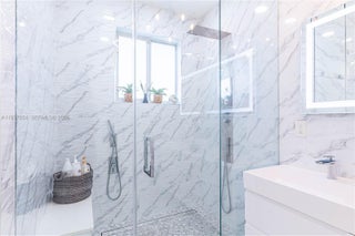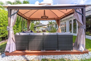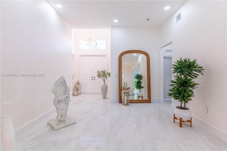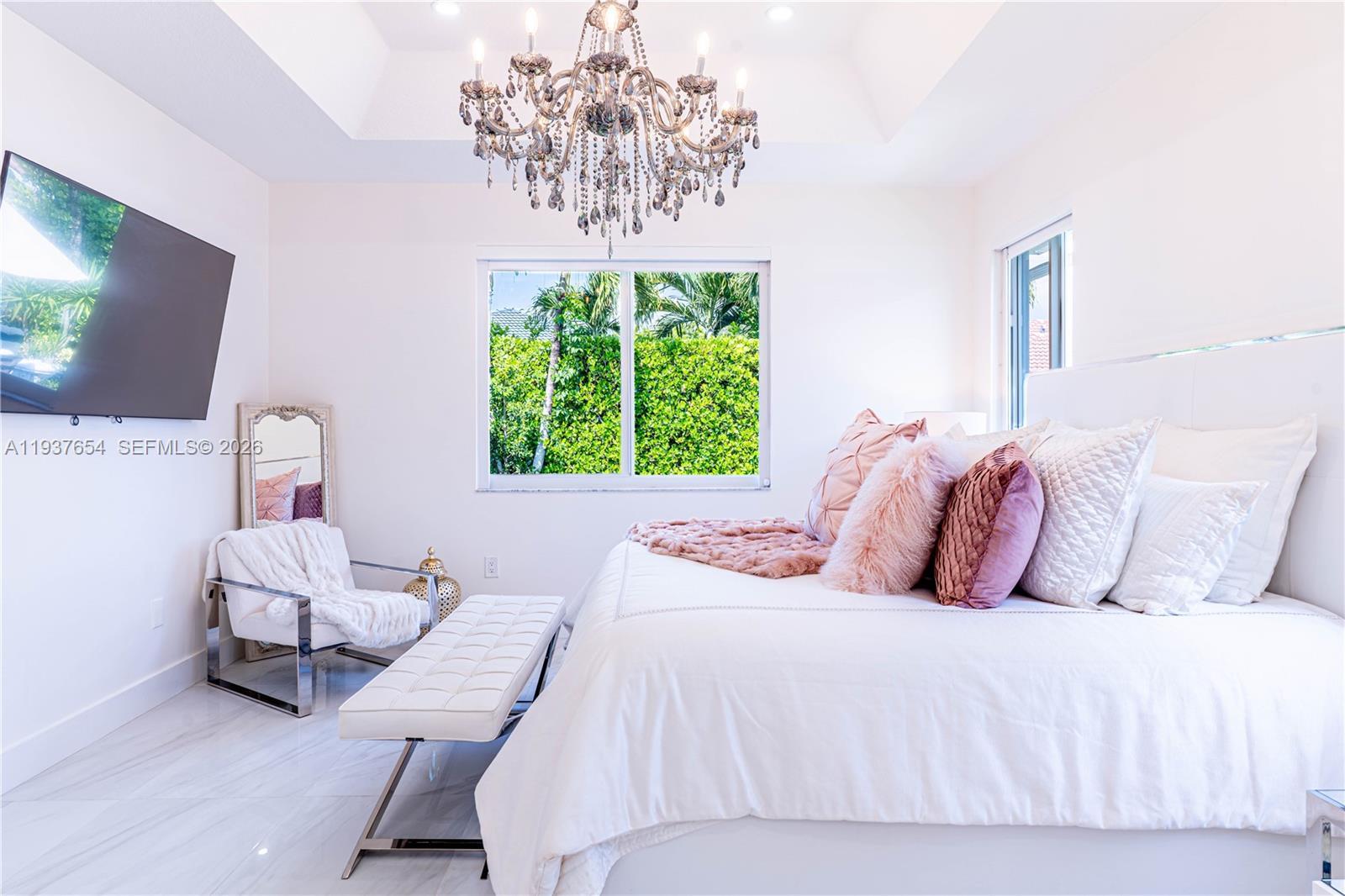 Elegantly renovated 3-bedroom, 3-bathroom home featuring an open concept design and impact windows and doors throughout. The spacious living area offers tray ceilings, porcelain flooring, and french doors that open to a private patio with a covered seating area. The gourmet kitchen showcases waterfall quartz countertops, modern cabinetry, stainless steel appliances, and a large island, perfect for entertaining. Outdoors, enjoy a fully equipped summer kitchen and ample space to build a pool. Additional highlights include a new 5-ton central A/C, custom electric blinds, built-out closets, and much more. Move-in ready, this home blends modern elegance with comfort and seamless indoor-outdoor living in a highly desirable location. (Chandeliers are not included in the sale.)
