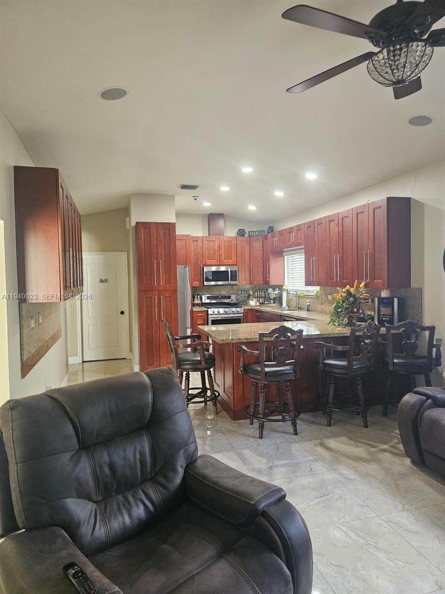 This stunning home has been extensively upgraded with high-end finishes throughout! Features include brand new tile flooring, a complete privacy fence, and a freshly resurfaced pool perfect for entertaining. Enjoy peace of mind with full-impact windows, doors, and sliding doors, a whole-house generator, and a newer A/C system. The kitchen and bathrooms have been beautifully remodeled, complemented by new stainless steel appliances. Truly move-in ready—every detail has been thoughtfully updated for modern comfort and style! Embrace South Florida living at its finest with a side yard designed to fit a 30 foot boat and an additional garden area flourishing with guava, mango, and palm trees, the ideal balance of convenience and natural beauty.