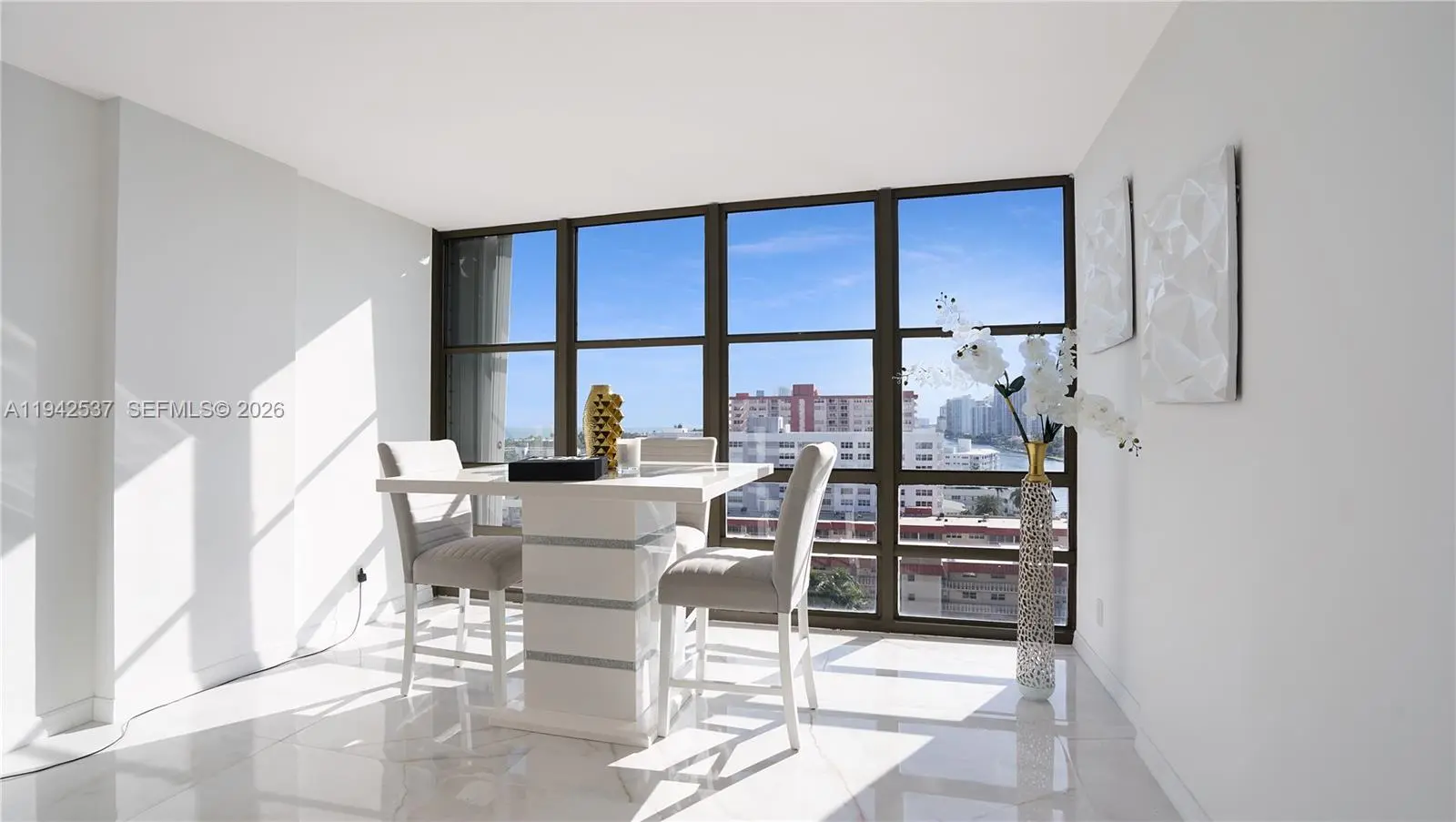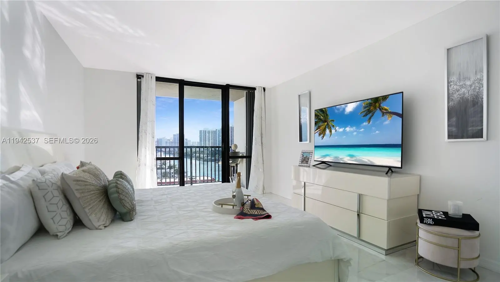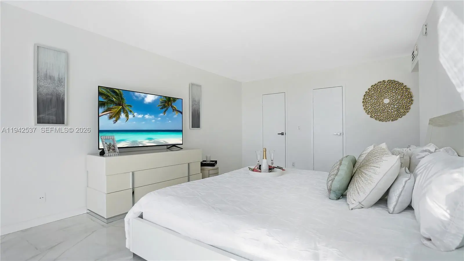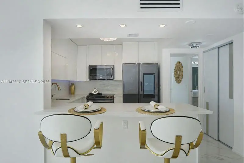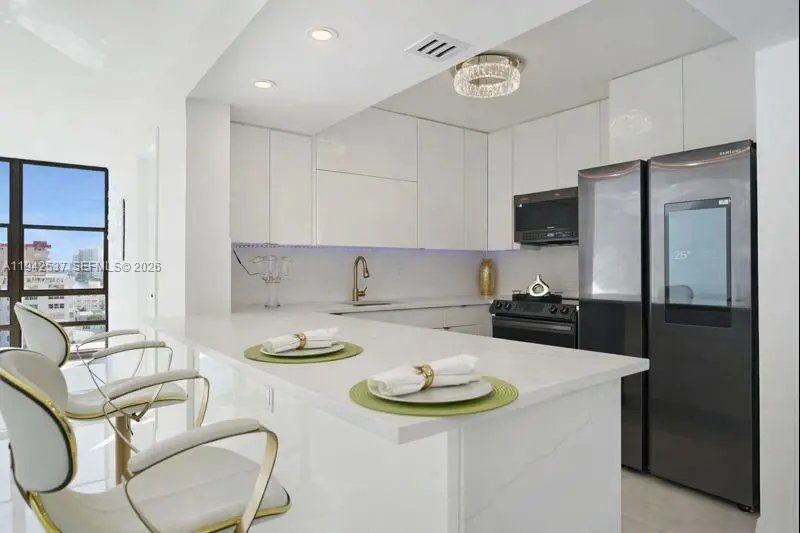MODERN COASTAL LUXURY WITH OCEAN & INTRACOASTAL VIEWS! DIRECT BEACH ACCESS! Luxury ocean & Intracoastal view condo in a boutique-style building. Fully renovated 2BD/2BA residence featuring a bright, open layout with floor-to-ceiling windows and spa-like water views. Massive primary bedroom with huge custom-built walk-in closet, custom cabinetry, and private balcony. Finished with 36” Italian tile throughout, new closet doors, and abundant storage. Chef’s kitchen offers European-style cabinetry, quartz countertops & full backsplash, under-cabinet multi-color LED lighting, and high-end smart Samsung appliances, including touchscreen refrigerator with app-controlled features. Spa-inspired bathrooms include soaking tub, multi-jetted rain shower, illuminated vanities, and modern fixtures. Furnished with upscale modern furniture and designer accents throughout.Resort-style amenities include 24-hour security, heated pool, tennis courts, fitness center, billiard room, and renovated lobby. Building has completed 40 and 50-year certification, is freshly painted, and offers NO special assessments. One of the lowest oceanfront associations at $600/m, offering exceptional value for luxury coastal living.