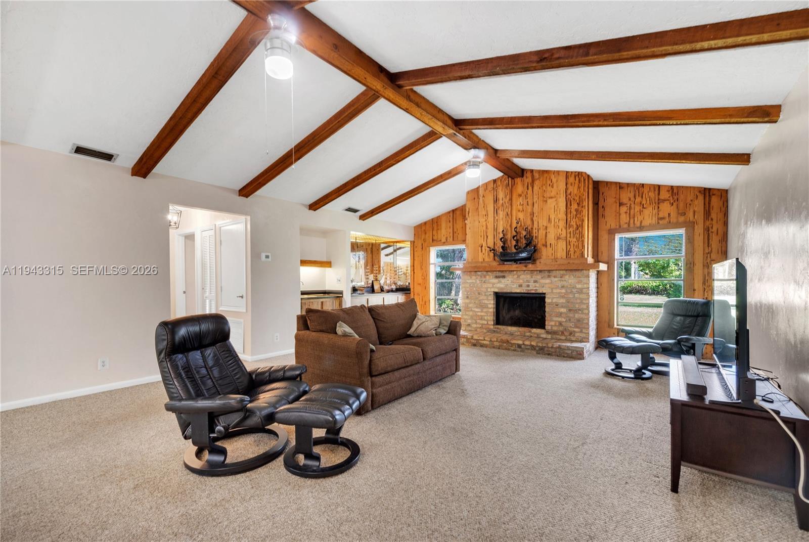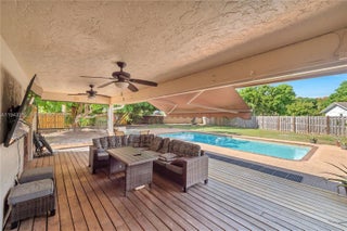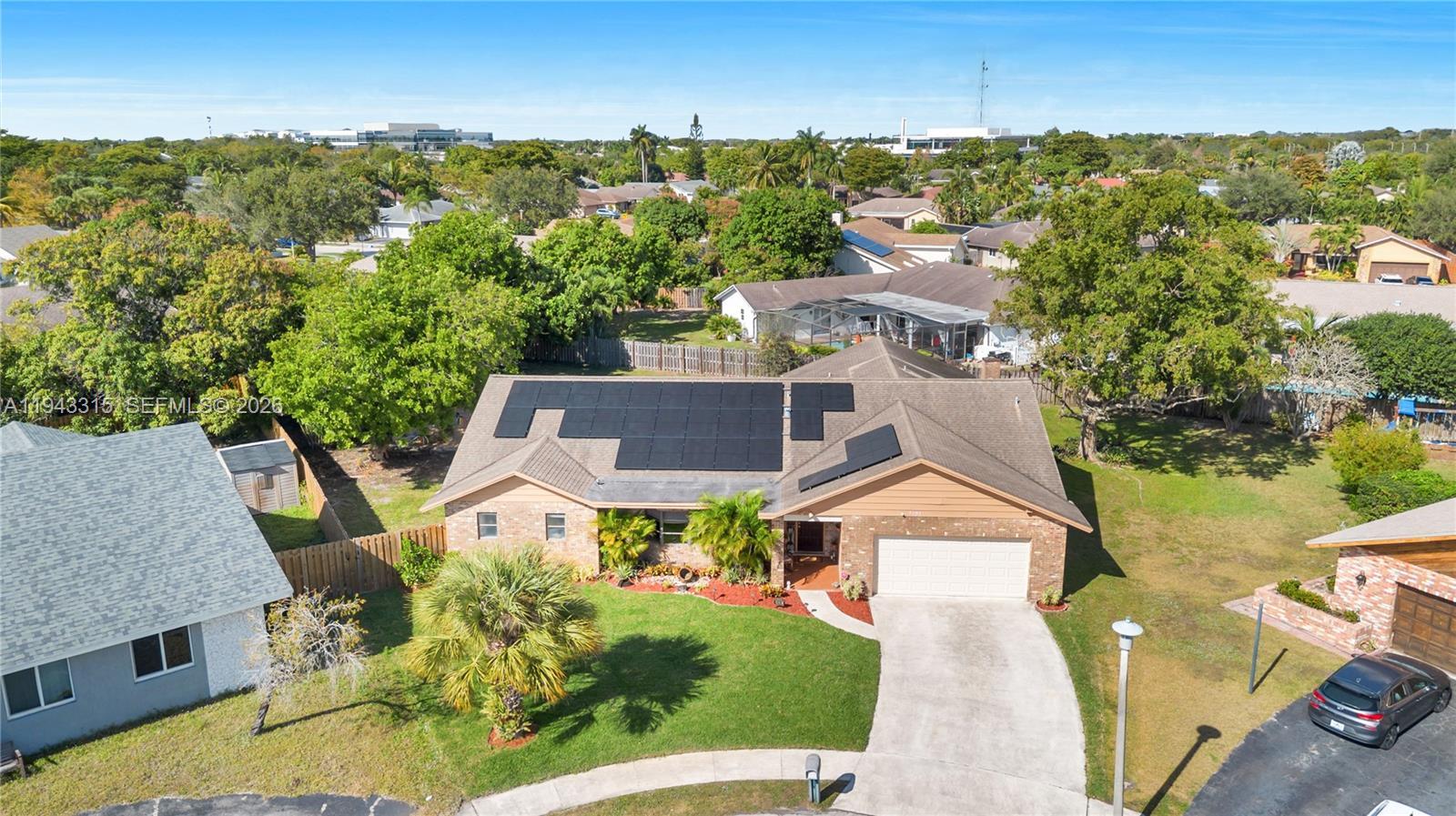 Discover this spacious 3BR, 2.5BA home in sought-after Marcano Estates, Plantation! Offering 2,801 sq ft of living space on an oversized 16,560 sq ft lot at the end of a quiet cul-de-sac. Inside, enjoy an open floor plan with soaring volume ceilings that create an airy, elegant feel, an oversized family room with fireplace, a large sunken living room, and a split-bedroom layout for privacy. The primary suite is a true retreat, opening through French doors to a large deck with serene views of the sparkling pool and lush backyard. Step outside to your private oasis, complete with an oversized pool—perfect for sunny Florida days and entertaining family and friends. Additional highlights include dual A/C units (both newer: 2019 & 2021), solar panels for significant energy savings (likely just a nominal connection fee), freshly painted interior/exterior, refurbished sprinkler system, new landscaping, new blinds, and a 2-car garage with updated walls and floor. No HOA! A perfect opportunity to renovate and customize in a peaceful neighborhood close to parks, schools, shopping, and major highways.