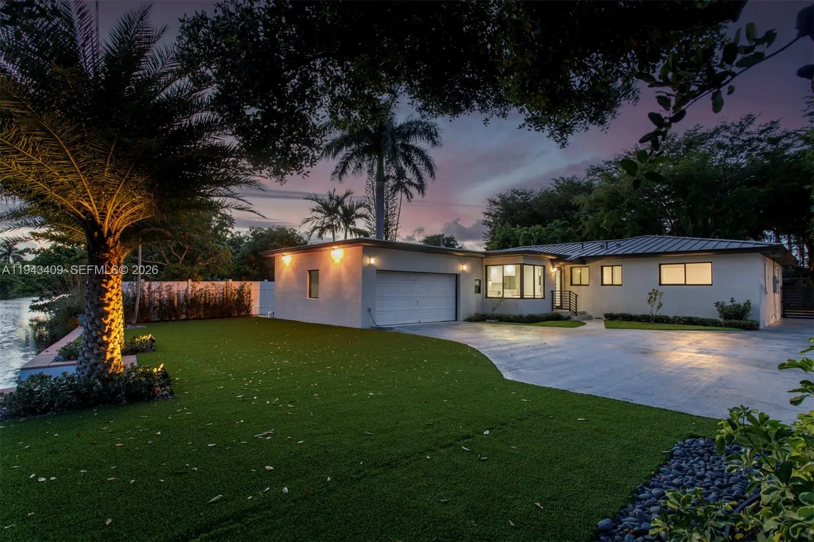 Elegant Riverfront Oasis, meticulously detailed redesigned 3-bed/2.5-bath, plus separated space for possible in-law suite with water view. Grand open living area with lighting enhancements, New gleaming porcelain flooring. Bright waterfall styled kitchen island, sleek state of the art stainless steel appliances. Residence spans 2,544 total square feet, including versatile 2-car garage featuring kitchenette, A/C & water closet. New Cat 5 metal roof, impact windows & doors for peace of mind, The property also boasts elegant waterfront yard lighting & new irrigation system. Abundant parking, with circular driveway connecting to side & rear driveways, space for boat/RV. So much more to mention! Schedule your private viewing today and prepare to be captivated by this extraordinary offering.