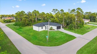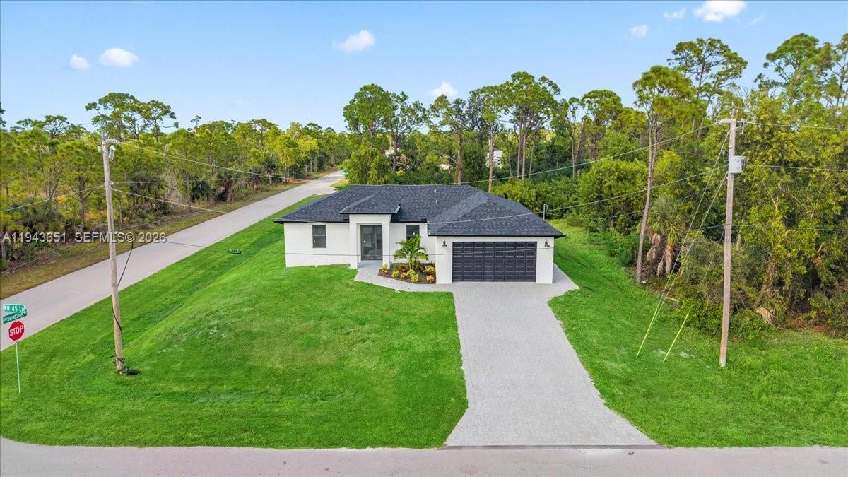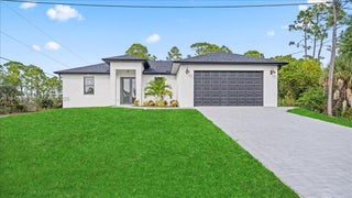 Uncover the allure of the Moon model, a modern new construction set on a desirable corner lot in Cape Coral, Florida. This thoughtfully designed home offers 3 beds, 2 baths, and 1,387 square feet of clean, functional living space that blends contemporary style with everyday comfort. The corner lot enhances curb appeal, privacy, & natural light throughout the home. Inside, large-format tile flooring, high ceilings, and an open-concept layout create a bright, airy atmosphere. The kitchen serves as the heart of the home, featuring white cabinetry, quartz countertops, statement lighting, and a spacious island that flows seamlessly into the living & dining areas, ideal for entertaining or daily living. The primary suite provides a private retreat with walk-in closets and a modern bathroom showcasing dual vanities, sleek finishes, & a glass-enclosed shower. Secondary bedrooms are well-sized and flexible, perfect for guests, a flex space for additional living needs. Step outside to the 227-square-foot covered lanai, perfect for morning coffee, evening relaxation, or weekend gatherings. Garage is finished with durable epoxy flooring, and hurricane impact windows and doors offer added peace of mind. Home delivers modern design, low-maintenance living, & the added value of a corner lot in a growing Cape Coral location. Luxury, comfort, & smart design come together effortlessly