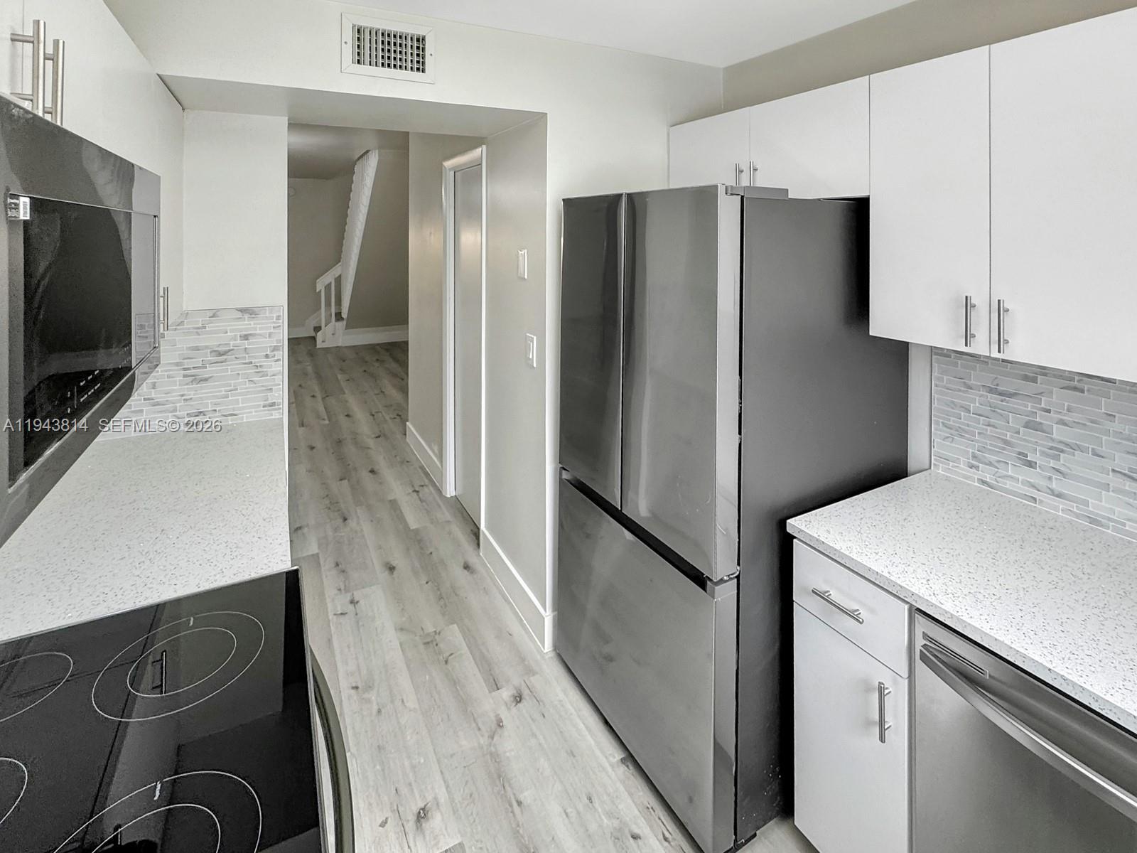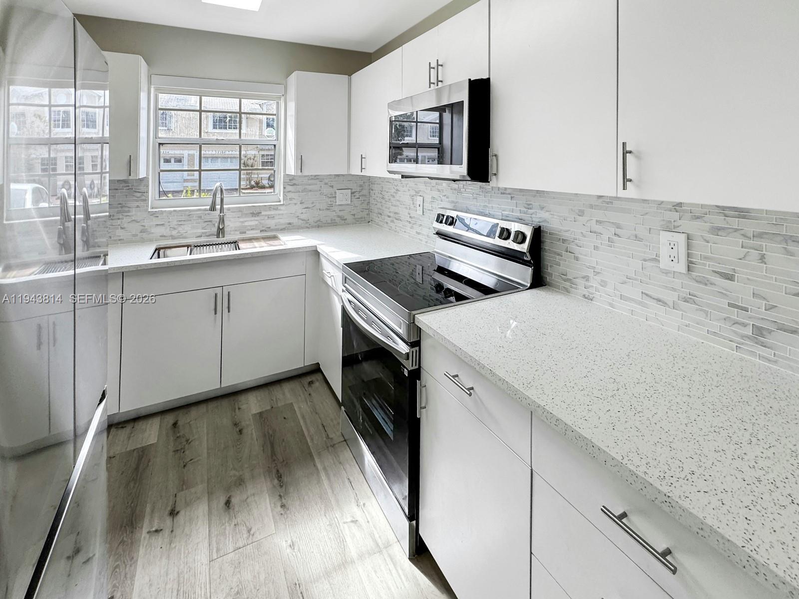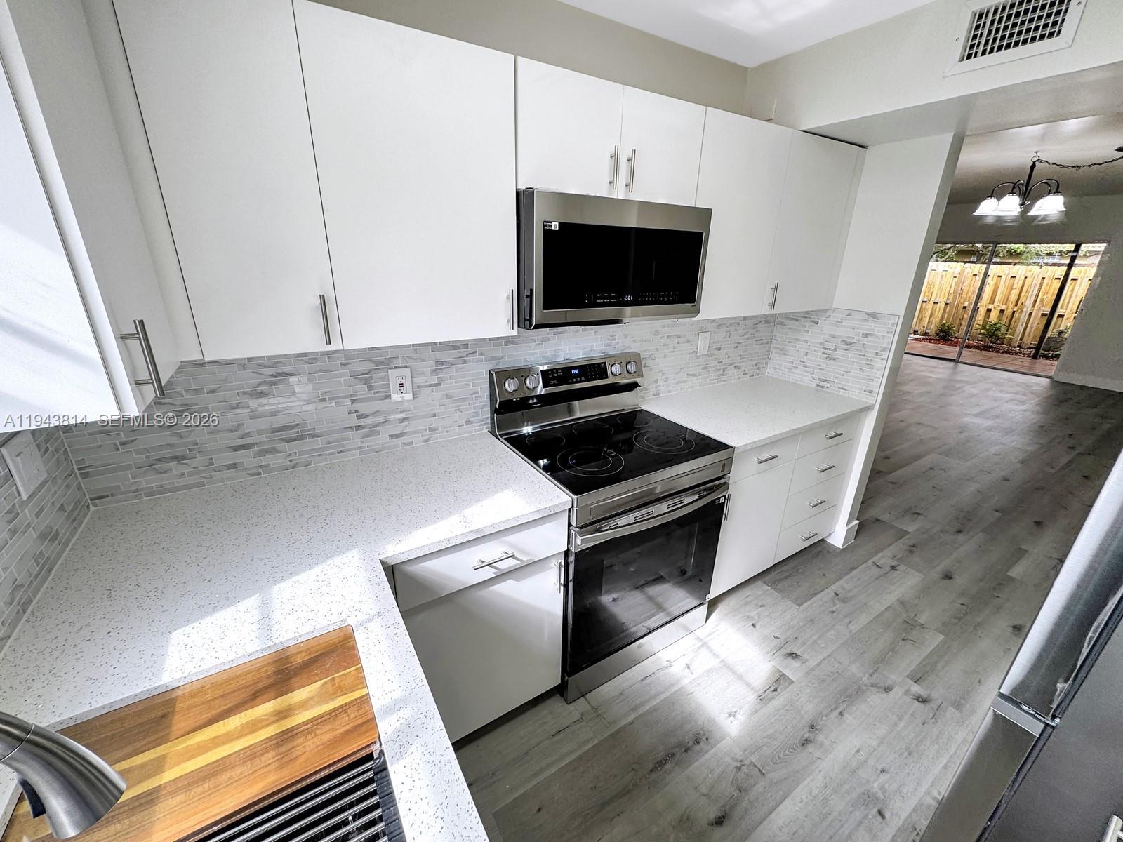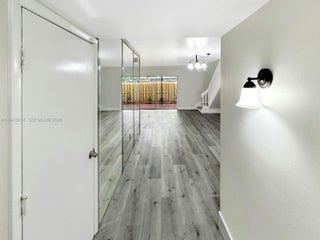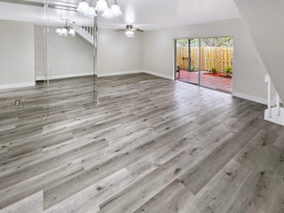 This light and bright townhouse is located in the Flamingo Gardens community of Cooper City. The home offers 3 bedrooms, 2.5 bathrooms, and a 1 car garage with additional driveway parking. Interior features include gray wood style laminate flooring throughout the home, creating a clean and modern feel. The updated kitchen is finished with white cabinetry, stainless steel appliances, and white and gray speckled countertops that coordinate with the tiled backsplash. Living and dining areas are well proportioned and filled with natural light. The home features a large private patio that is fully fenced, providing a comfortable outdoor space for relaxing or entertaining. Parking includes space for two vehicles in the driveway, a one car garage, and guest parking within the community. Zoned for Cooper City schools close to restaurants, shopping and parks. No HOA approval, No leasing permitted.