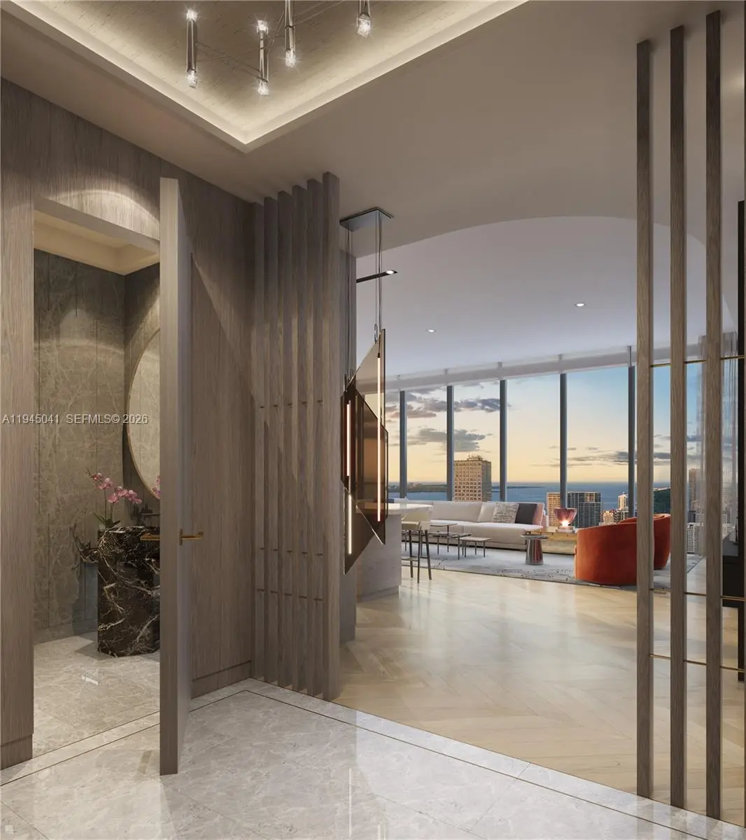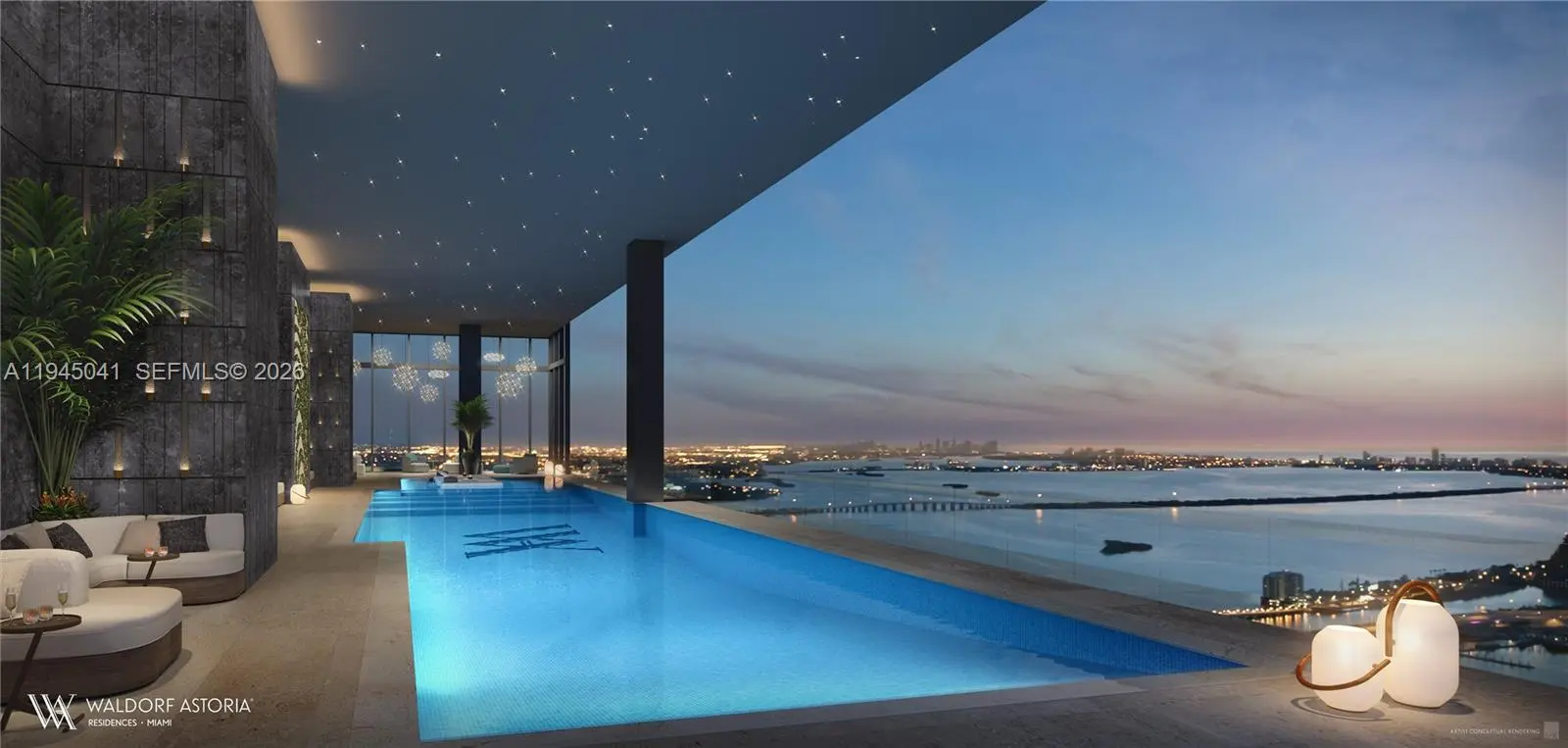 Welcome to the Waldorf Astoria Residences Miami, the city’s first super-luxury residential tower, offering an unparalleled lifestyle in the heart of Downtown Miami. Residence 5901, located on high floors (Levels 50–59), features a spacious 3-bedroom, 3.5-bath residence with den, offering 2,659 SF of interior living space plus a 163 SF private balcony, totaling 2,822 SF. This elegant home is accessed via a private elevator foyer and showcases an expansive open-concept living and dining area with floor-to-ceiling windows capturing stunning panoramic views of Biscayne Bay and the Miami skyline. The thoughtfully designed layout includes a generous primary suite with spa-inspired bath, well-appointed secondary bedrooms with en-suite baths, a den ideal for a home office or media room, a powder room, and a dedicated laundry area. Residents enjoy the legendary Waldorf Astoria lifestyle, including world-class concierge services, luxury amenities, and hotel-style offerings, all moments from Brickell, Miami Beach, fine dining, and cultural destinations.