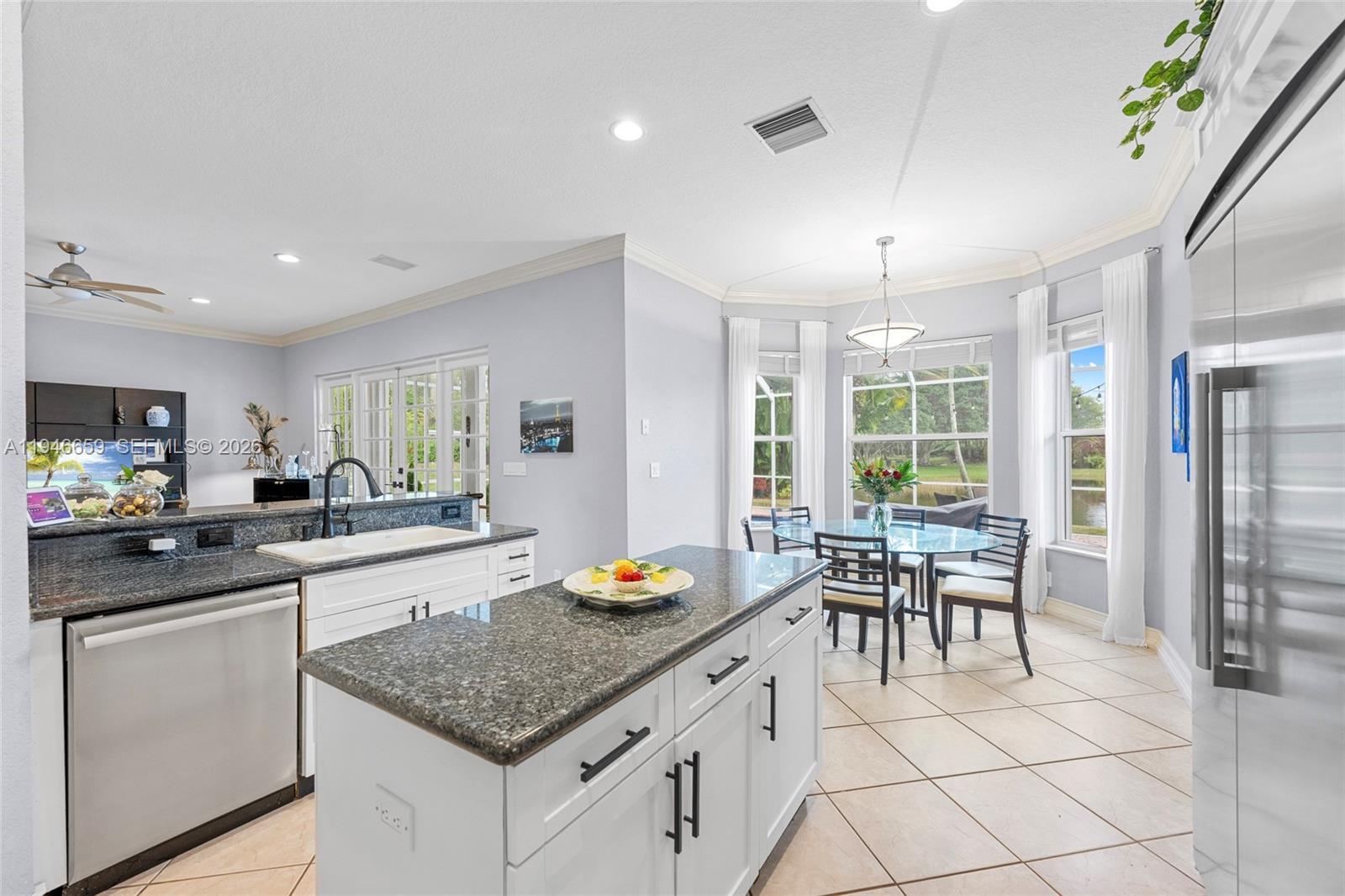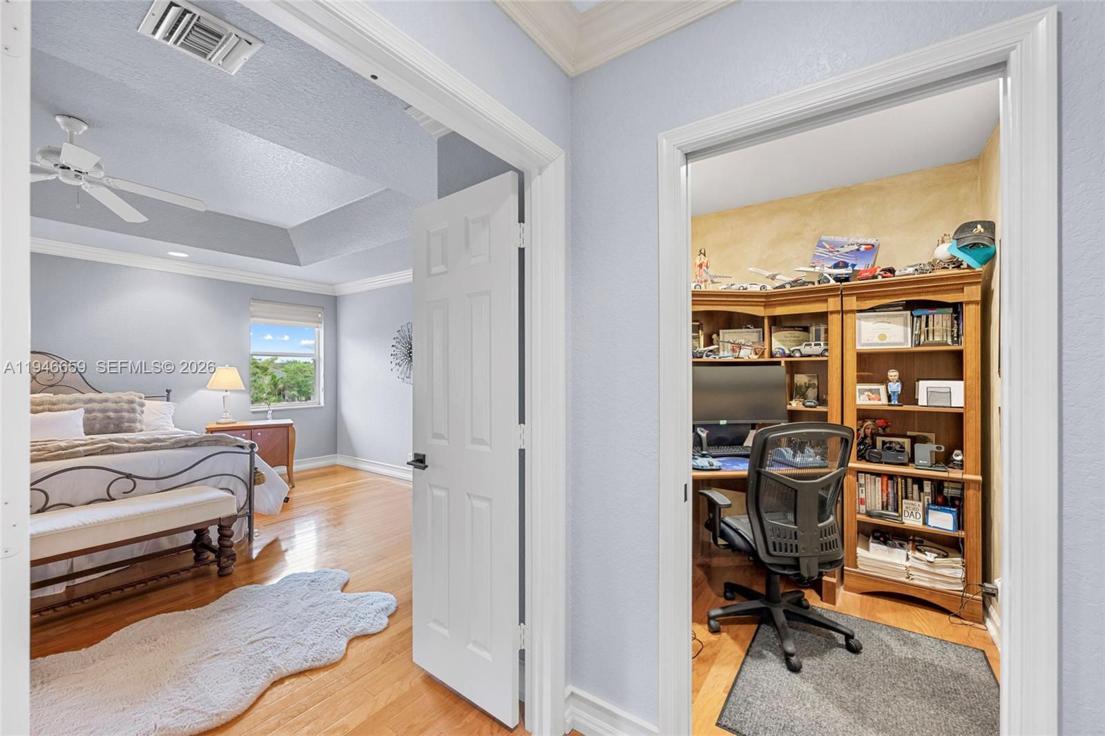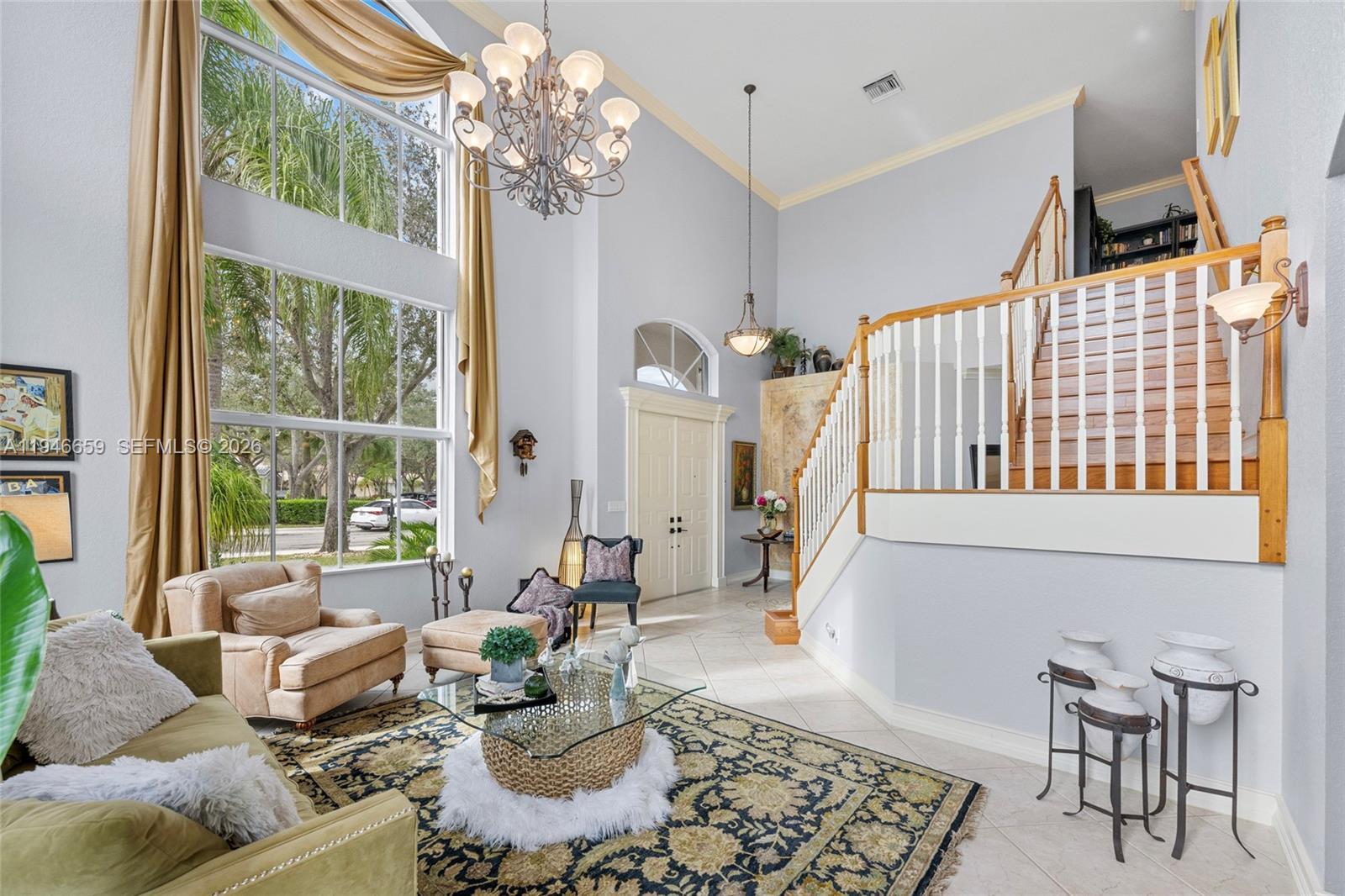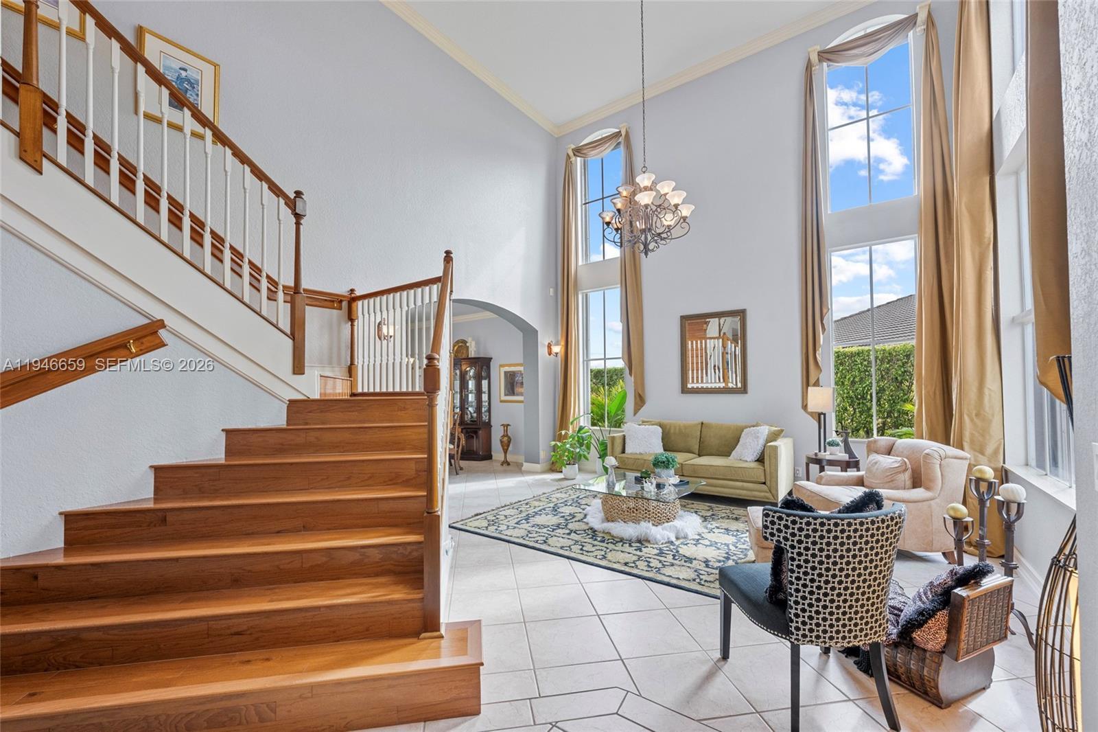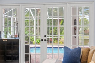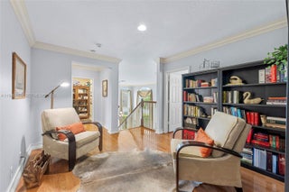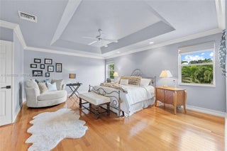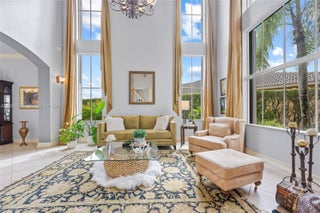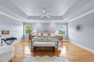 Remarkable home on a quiet cul-de-sac in exclusive Lake Ridge One enclave of 19 homes. This spacious two-story residence sits on a 15,000 sq ft lot with private water views and updated outdoor setting. Built in 1998, the home features 2025 roof with gutters, accordion hurricane protection (panels only on patio doors), and freshly painted exterior (2024). The screened patio, updated 2025, opens to a heated pool with paver deck and Diamond Brite finish (2023)—ideal for entertaining. Inside are five bedrooms + office and loft, four baths renovated with upscale fixtures and quartz countertops, and three-car garage. A first-floor bedroom with renovated cabana bath adds flexibility. The living room offers two-story ceilings, crown moldings, and stone floors on the main level, with wood flooring throughout bedrooms, loft, and staircase. The kitchen features white shaker cabinetry, center island, granite countertops, and stainless appliances including Thermador refrigerator, wall oven, convection microwave, downdraft vented cooktop, wine cooler and custom kitchen pantry. All closets are built out, and the laundry room includes newer cabinetry, countertops, and LG washer and dryer. Additional highlights include 2 A/C systems approx. 5 years old, water softener/filter, central vacuum, surround sound, Ring security, water heater (2 years old), and ADT alarm. The primary bath offers vessel tub, Moen smart shower, porcelain floors, and decorator lighting and window treatments.