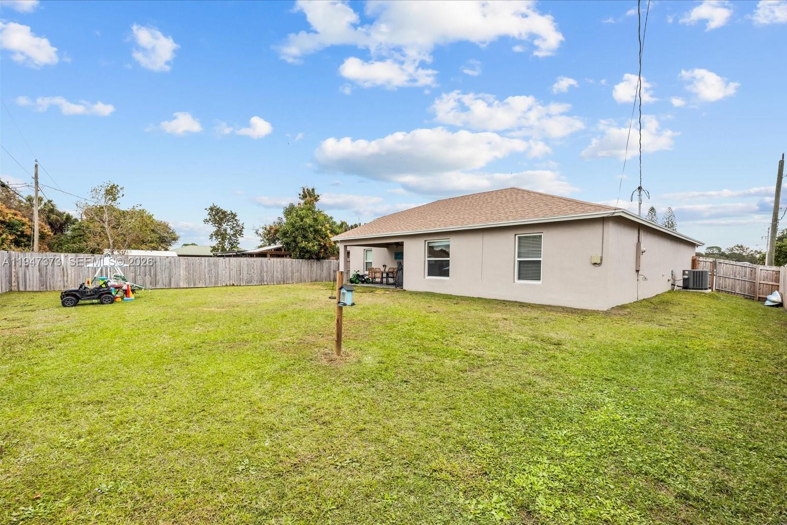 Exceptionally maintained 2023 built single family home offering modern comfort, space, and functionality with no association restrictions. Located in the continuously growing city of Port St. Lucie, this property is situated on an expansive 10,000 sq ft lot, providing exceptional flexibility and outdoor potential. Featuring 4 bedrooms and 2 bathrooms, the home offers a bright open concept layout ideal for both everyday living and entertaining. The kitchen flows seamlessly into the main living and dining areas, creating an inviting space filled with natural light. The spacious primary suite serves as a private retreat, complete with a large bedroom and his-and-hers closets for ample storage. Additional bedrooms are generously sized and versatile, guests, or a home office. Step outside to a covered back patio, ideal for hosting gatherings or relaxing while overlooking the oversized backyard. With side access and ample space to store a boat or RV, this property is perfect for those who value freedom and flexibility. With modern finishes, thoughtful design, and no HOA limitations, this move-in-ready home offers comfort, convenience, and room to grow in one of South Florida’s most desirable and fast-growing areas.