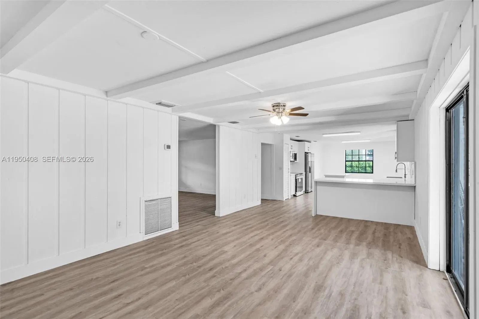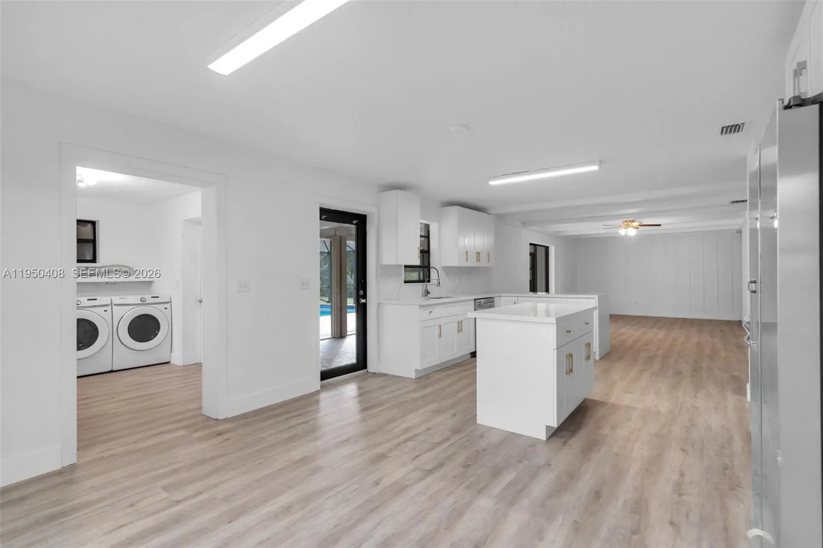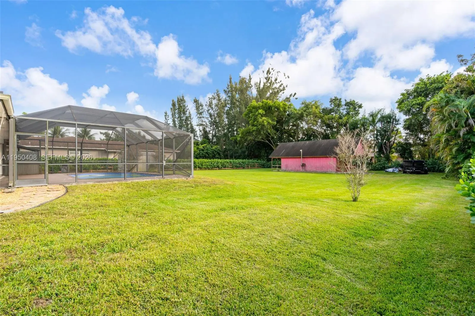 This beautiful 3 Bedroom, 2 Bath ranch-style oasis invites you into bright, open interiors set on lush, expansive grounds. Property is on almost 1 Acre of land. The sunlit living areas feature fresh white walls and luxury vinyl plank, flowing seamlessly into a modern kitchen boasting crisp white cabinetry, quartz countertops, brass finishes, and stainless-steel appliances. Step outside to a screened lanai and sparkling private pool which give you a serene retreat perfect for entertaining or relaxation. A charming outbuilding, ideal as a workshop or anything your imagination can think of, adds incredible potential. With beautifully updated finishes, generous yard space, and indoor-outdoor living that captures a tropical vibe, this home blends comfort and style into one inviting package