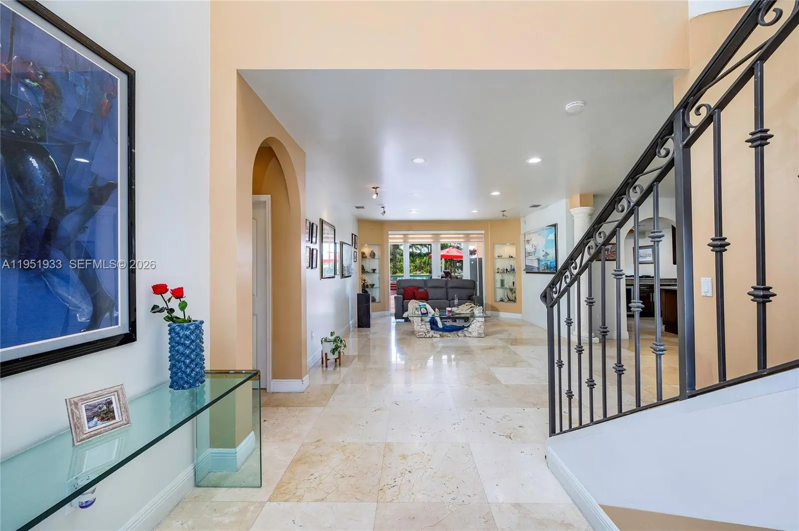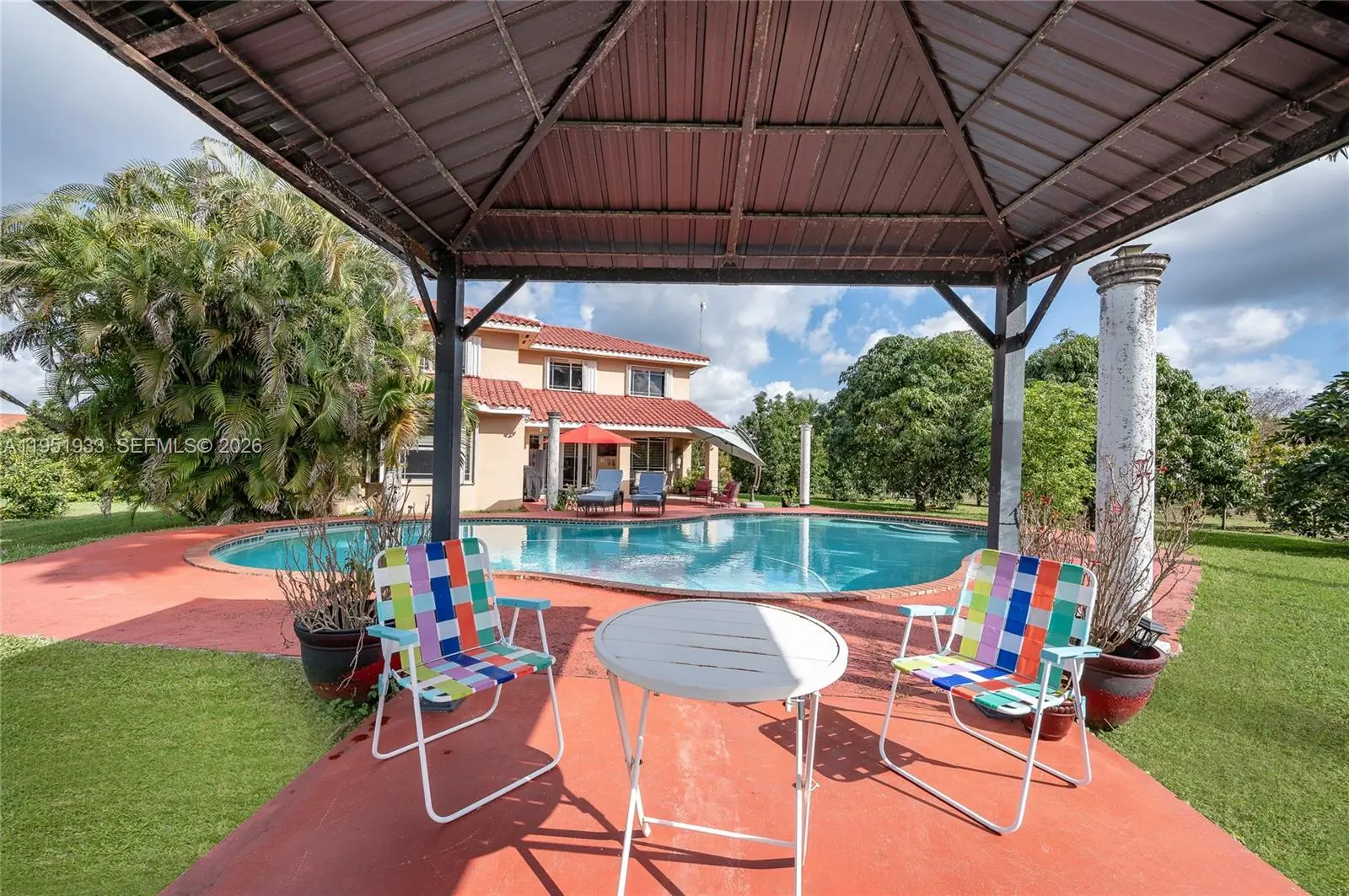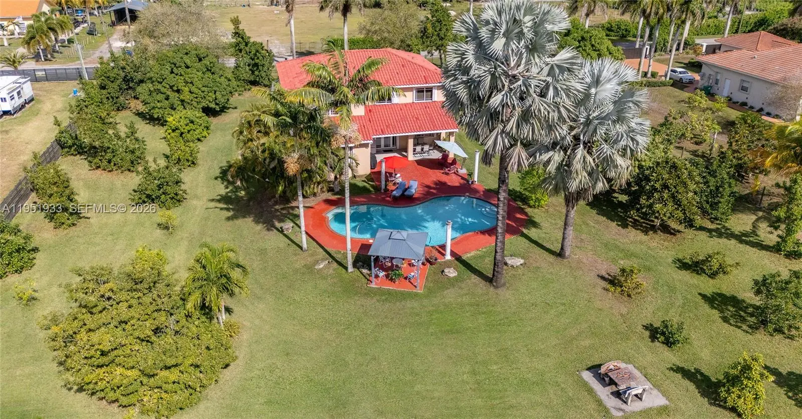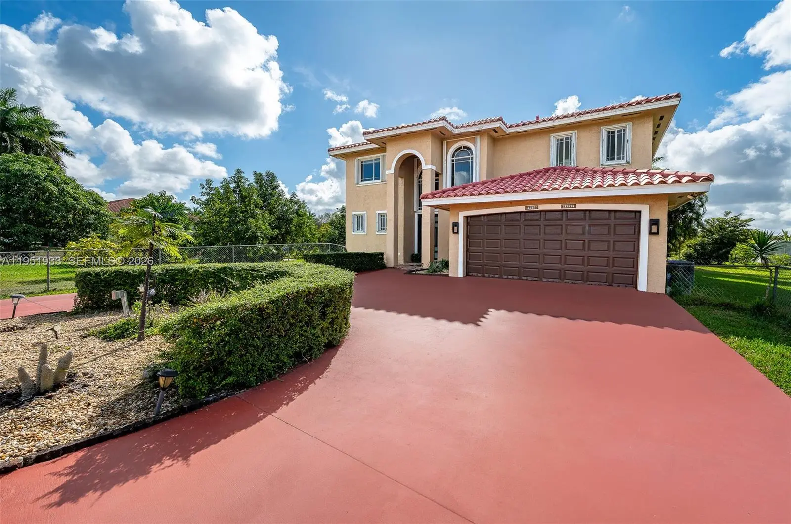 A Home That Welcomes, Inspires, and Comforts. Set on a 1.26-acre parcel in Miami’s Redland area, this distinctive two-story Mediterranean residence offers space, privacy, and a true indoor-outdoor lifestyle. The home features five bedrooms and three and a half bathrooms, with a thoughtful layout that balances open living areas and private retreats. Upon entry, soaring ceilings and generous proportions define the main living spaces, creating a light-filled atmosphere ideal for both everyday living and entertaining. The kitchen anchors the home with ample workspace and flows naturally into the family area, overlooking the pool and outdoor entertaining spaces. The upper level hosts multiple bedrooms, a dedicated laundry area, and a spacious primary suite complete with a large ensuite bath and walk-in closet. A ground-level bedroom provides flexibility for guests, extended family, or a home office. Outdoors, the property transforms into a private retreat featuring a large swimming pool, expansive courtyard, shaded pergola, and a full tennis court—perfect for recreation or hosting gatherings. Mature fruit trees and lush landscaping surround the grounds, offering a tranquil setting rarely found within city limits. This unique estate delivers the freedom of acreage living while remaining conveniently located, making it an exceptional opportunity for those seeking space, privacy, and versatility.