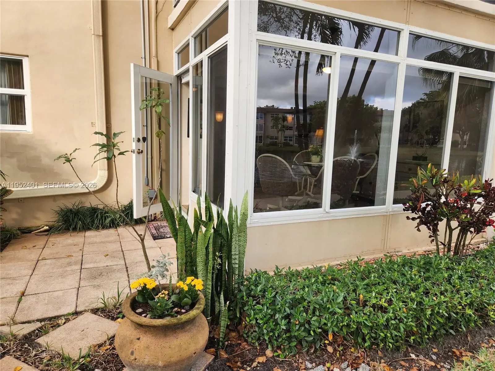 Stunning first-floor condo featuring 2 master bedrooms with a beautiful lake view, located in a quiet corner setting. The corner location adds extra windows, filling the home with natural light. Open kitchen with granite countertops. Enjoy direct access from the Florida room to the walking area, pool, community amenities, and lake. Tile flooring throughout. Upgraded bathroom with spacious walk-in shower and independent entrances for each bedroom.55+ Community .Al furniture and accessories are included in the sale.