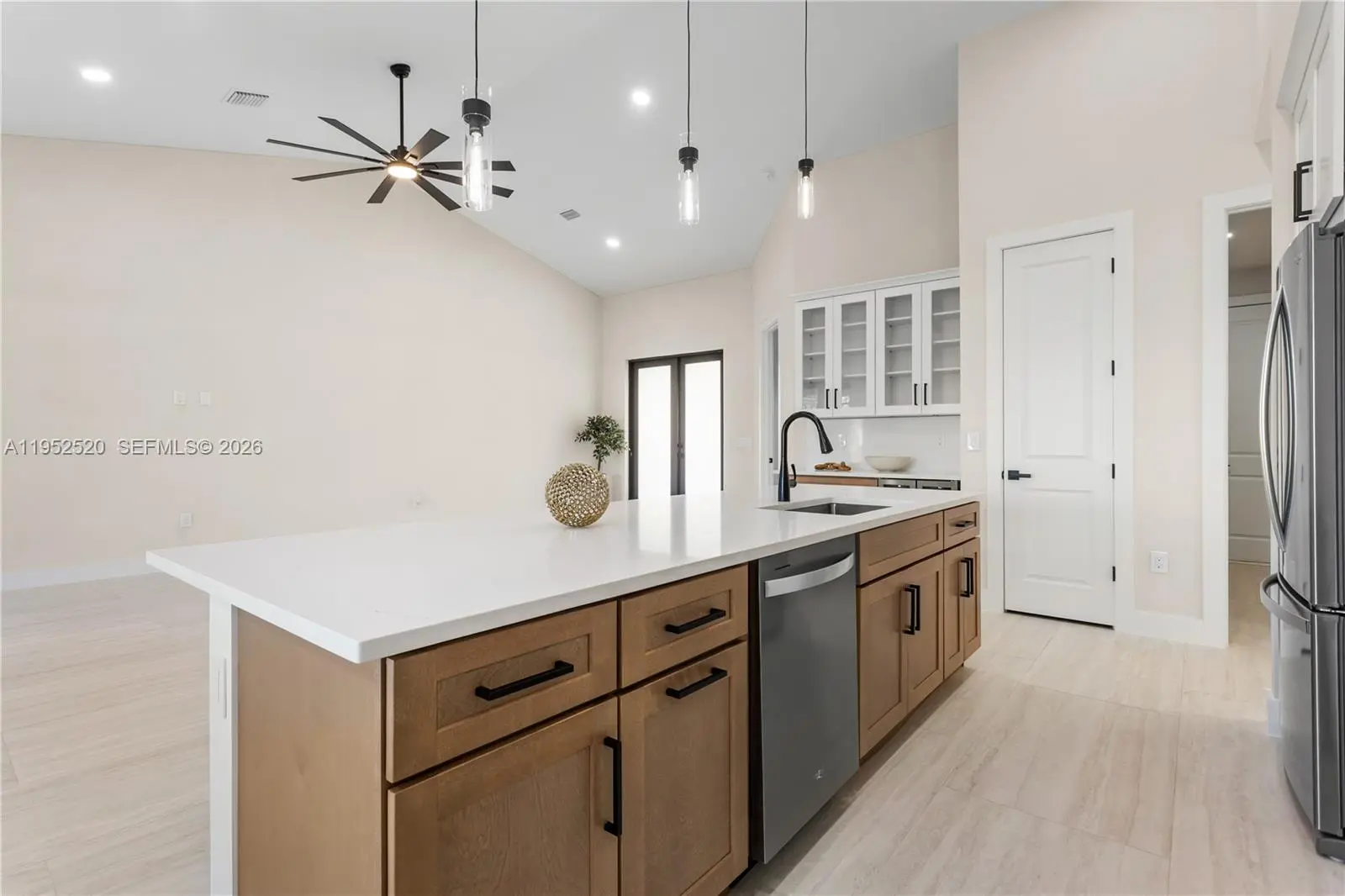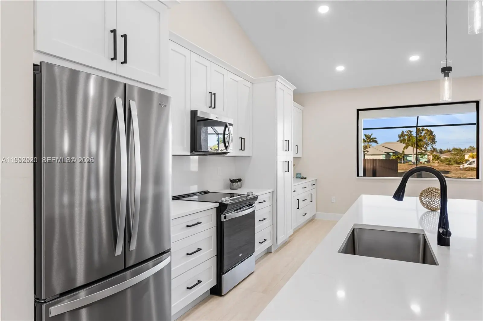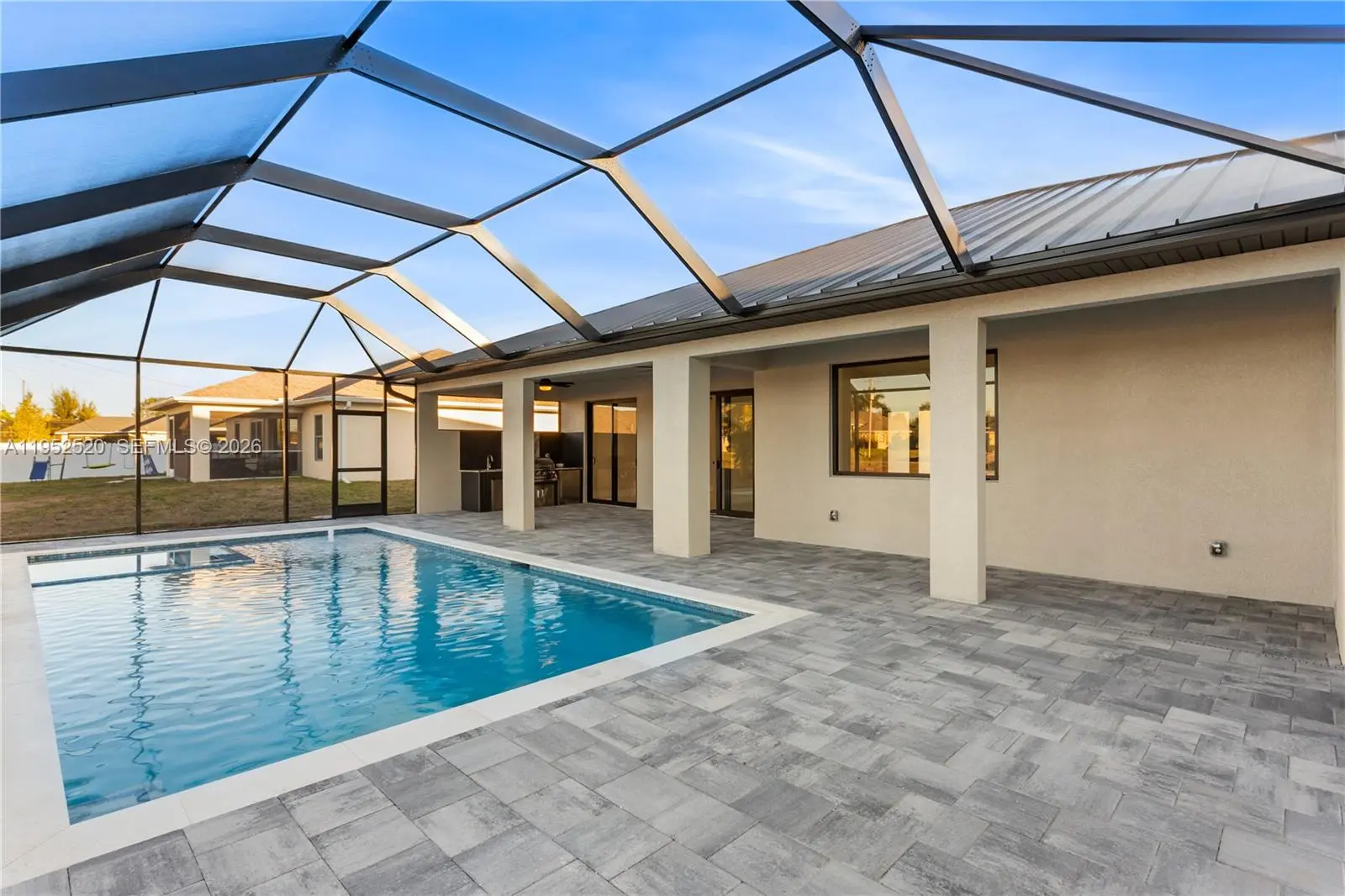 Stop and behold this move-in-ready 2026 new construction home, complete with a 2-10 Home Warranty, located in highly desirable Northern SW Cape Coral. This property offers no flood insurance requirement, a durable metal roof, 3-car garage, and city water and sewer, with estimated homeowners' insurance of just $1,800–$2,400 per year. This luxury home features a screened, heated pool and spa for year-round enjoyment. With 4 bedrooms and 3 full bathrooms, the open layout is ideal for both everyday living and entertaining. Inside, light neutral tile flooring flows throughout the bright, open floor plan. Impact-resistant double doors open to a welcoming living room with 12-foot vaulted ceilings and sliding doors to the lanai. The stunning chef’s kitchen showcases a large quartz island, white shaker cabinetry with warm wood accents, matte-black hardware, stainless steel appliances, and elegant pendant lighting. A built-in butler’s pantry with wine refrigerator adds style and functionality. Spacious primary suite offers lanai access, a custom walk-in closet, and a spa-like bath with a glass walk-in shower, dual quartz vanity. A split layout includes a second primary suite with pool bath and two guest bedrooms. Outside, enjoy the fully equipped outdoor kitchen, paver flooring, and landscaped setting. A laundry room, metal roof, and 3-car garage complete this exceptional home. Schedule your private showing today and experience your piece of paradise.