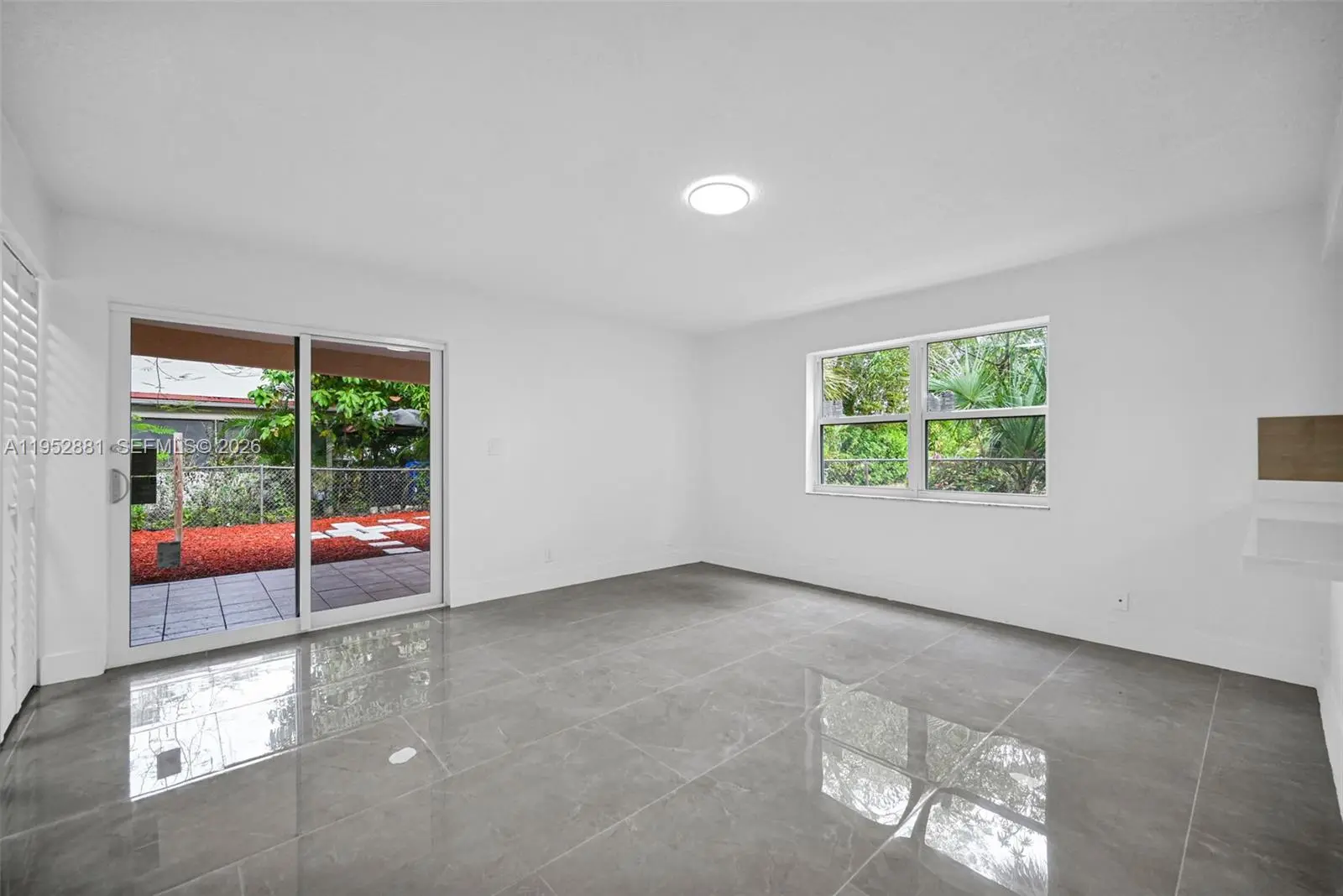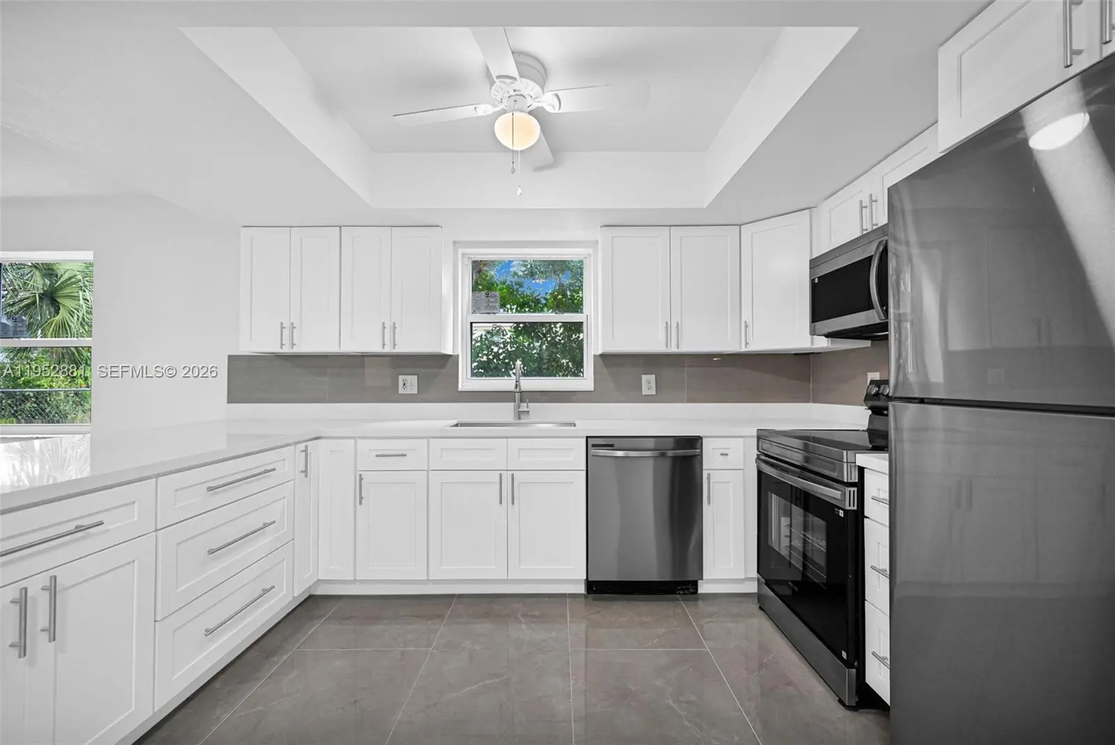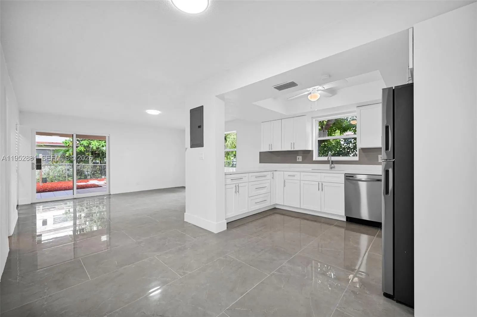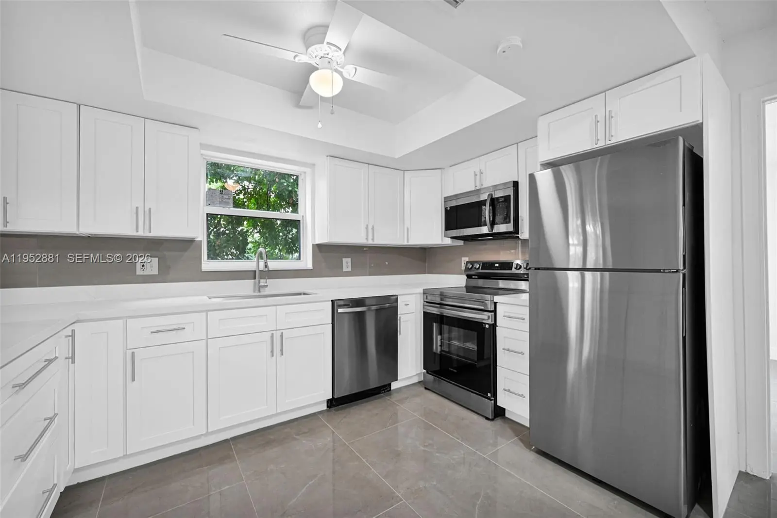 Welcome home to this beautifully remodeled and upgraded 4-bedroom, 2.5-bath residence offering 1,840 total sq ft, tucked away on a quiet cul-de-sac for added privacy. Enjoy peace of mind with hurricane impact windows and sliders (2025), a newer HVAC (2024), and the convenience of an in-unit washer & dryer. The renovated open-concept kitchen features quartz countertops, shaker cabinets, modern finishes, and Samsung appliances including stove, microwave, refrigerator, and dishwasher—perfect for both everyday living and entertaining. Ceramic tile flooring runs throughout the main level for easy maintenance, while laminate wood flooring adds warmth upstairs. The spacious layout includes a large living room, storage room, and dedicated laundry area. One oversized bedroom is located downstairs, ideal for guests, a home office, or multi-generational living. Upstairs, the primary suite offers a generous walk-in closet and a beautifully updated ensuite bath with a frameless glass shower. The second full bathroom includes a tub for added functionality. Step outside to a fenced private backyard with endless potential—create your dream outdoor oasis with space for a patio, play area, garden, and more. Fee simple ownership with NO HOA, making this an excellent opportunity for first-time buyers, homeowners, or investors. Conveniently located near schools, shopping, dining, and major roadways.