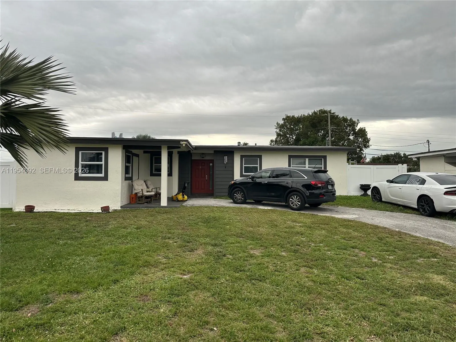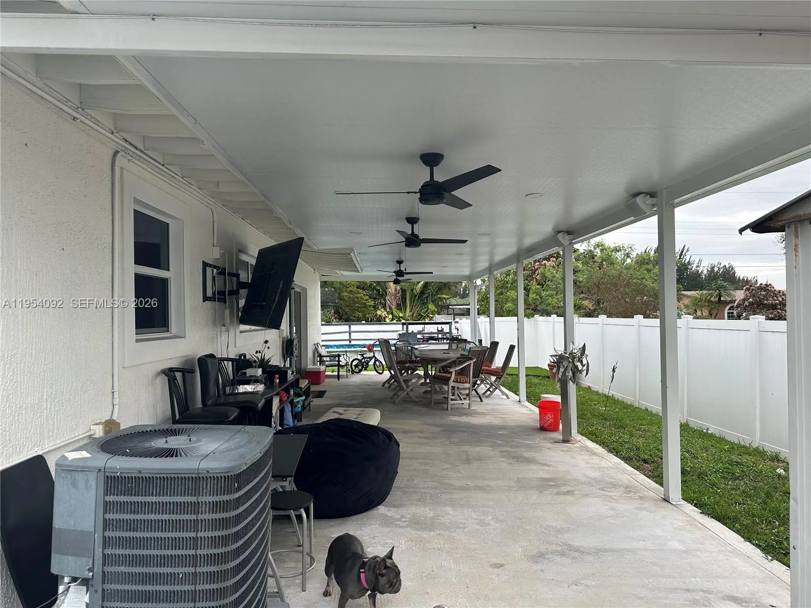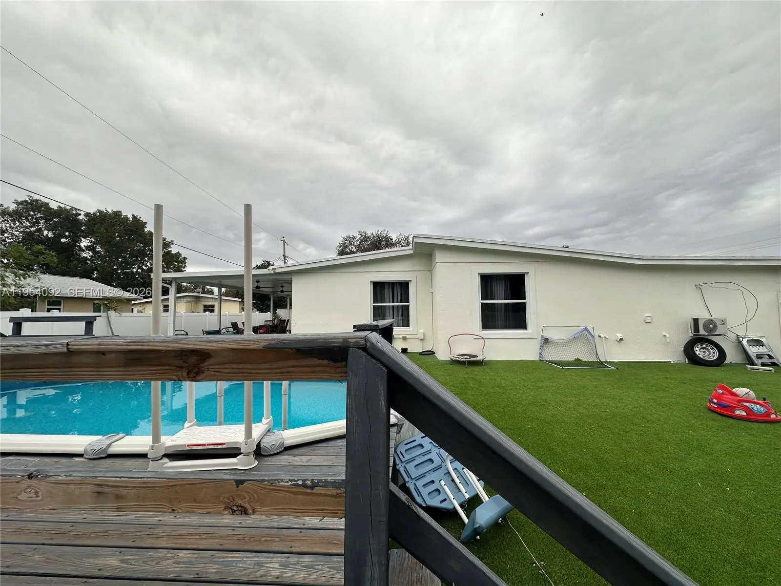 Large corner lot. Lovely kitchen, great for entertaining, connects to living room and to patio with extended roof overhang and on concrete floor, ideal for outdoor socializing. All ''Hurricane Impact" doors and windows. Well maintained 10-year-old roof. Full surround high privacy fence, encloses storage for boat, trailer water toys, etc. Large shed for tools. A 4th room may become a Den, Office or in-law quarters.