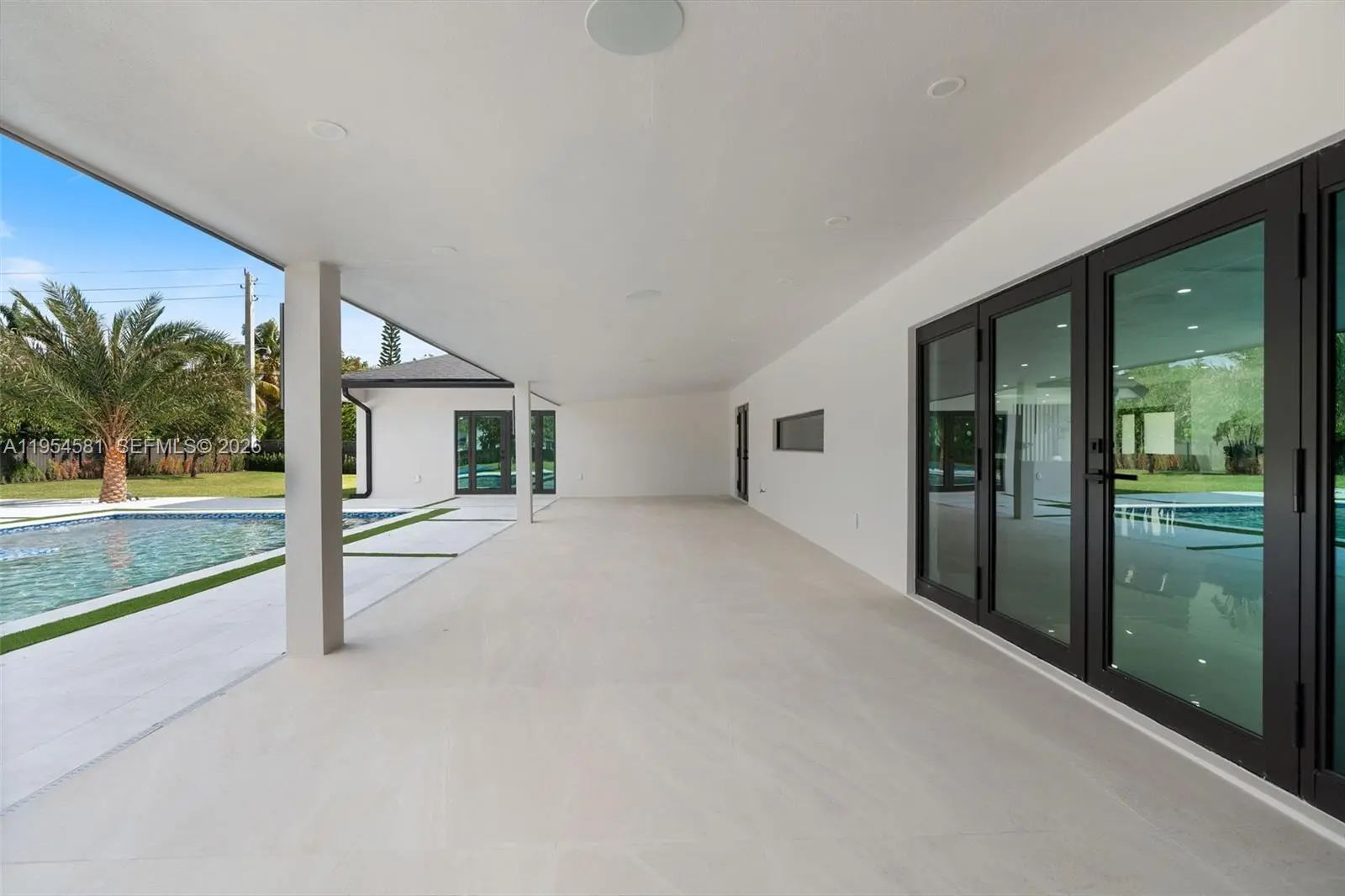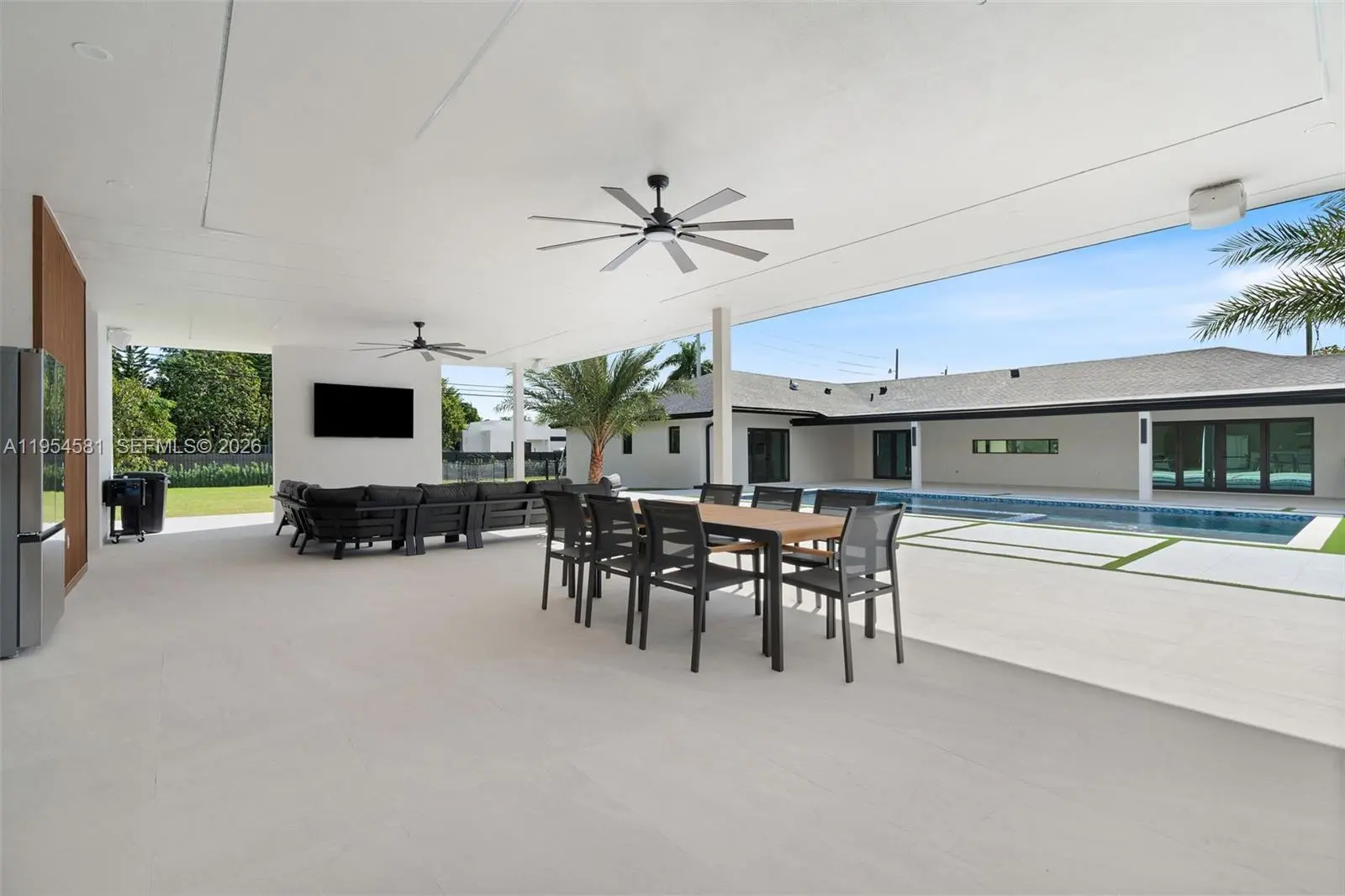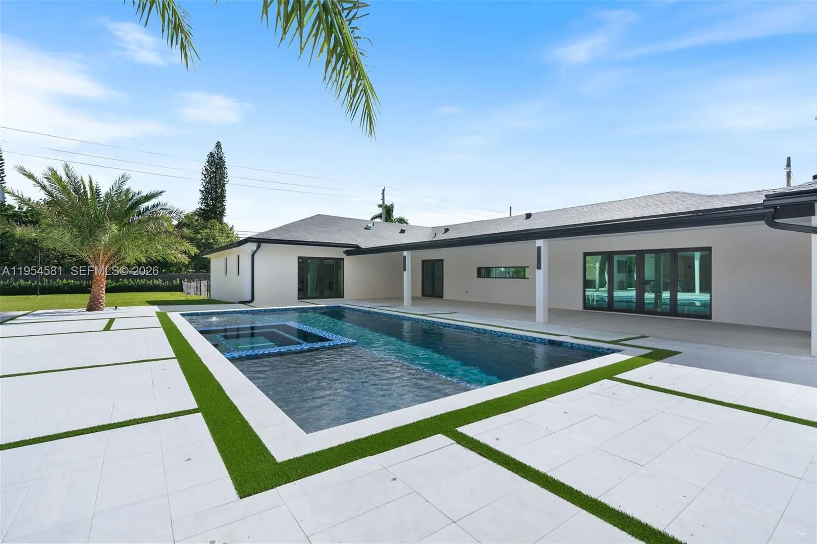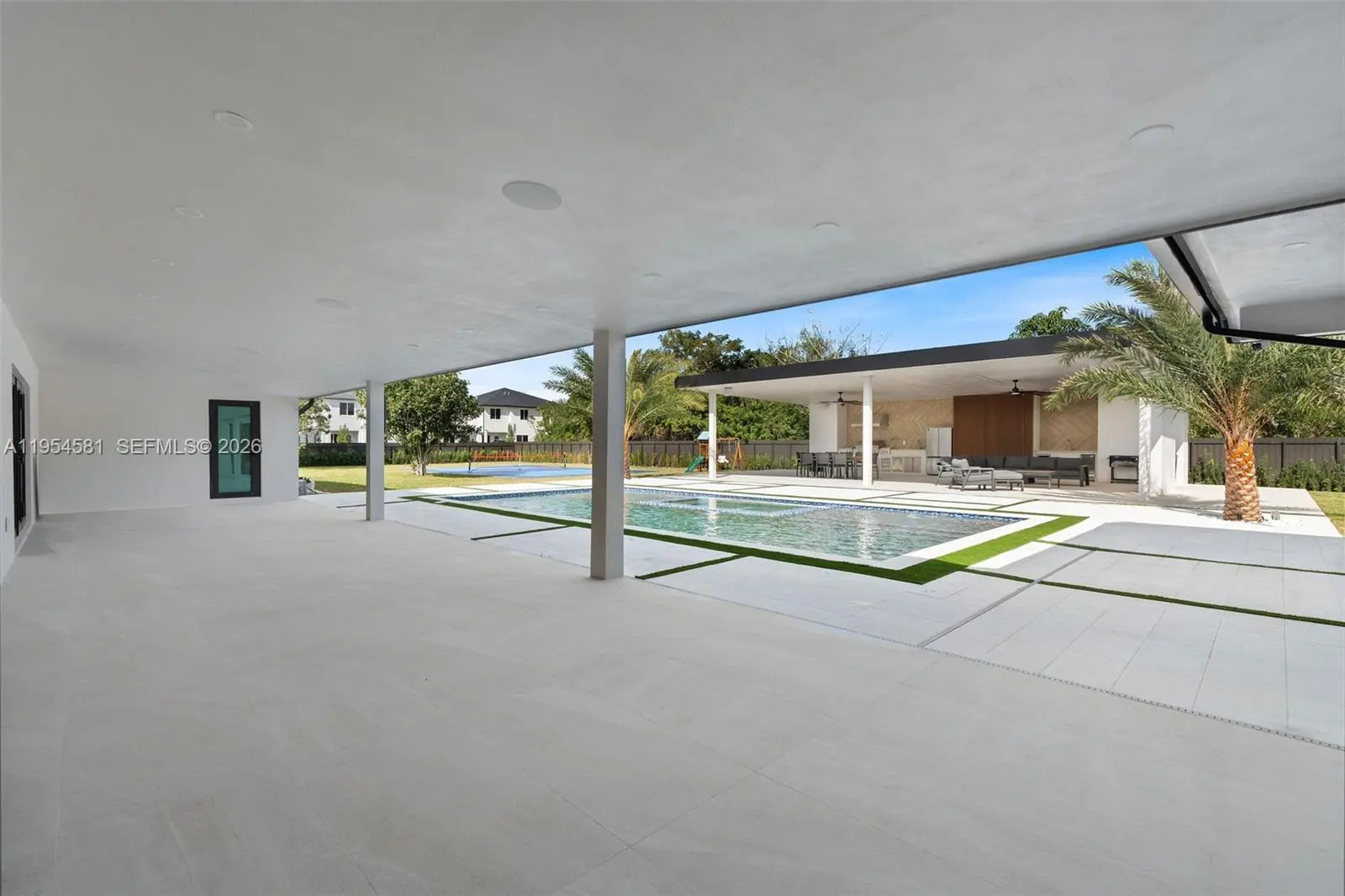 Welcome to an extraordinary residence where contemporary design meets unparalleled outdoor living — a sanctuary reimagined from top to bottom on an expansive corner lot. Fully remodeled with no detail spared, this home offers a rare blend of refined interiors and unmatched outdoor living, setting a new benchmark for luxury in the area. The home makes an immediate impression with all-new Low-E impact windows and doors, enhancing both aesthetics and energy efficiency while flooding the interior with natural light. Inside, expansive living areas are unified by 48×48 Spanish porcelain tile, creating a clean, contemporary canvas throughout. The heart of the home is a designer kitchen and living space finished with Taj Mahal quartzite countertops, offering timeless elegance, durability, and visual warmth. Every space has been thoughtfully reimagined to maximize flow, comfort, and functionality. Designed for elevated entertaining and everyday enjoyment, the property opens to a private outdoor oasis that includes a heated smart pool and jacuzzi with app-controlled functionality, a custom pickleball court with professional lighting, and an exterior cabana equipped with a Summerset BBQ and premium appliances delivering a true resort-style experience at home. Manicured landscaping is supported by a sprinkler system. Additional features include a 2-car garage, integrated whole-home audio system, and a modern camera security system.