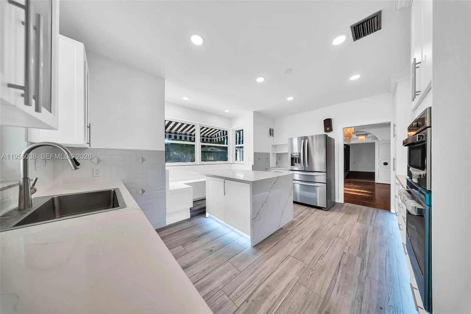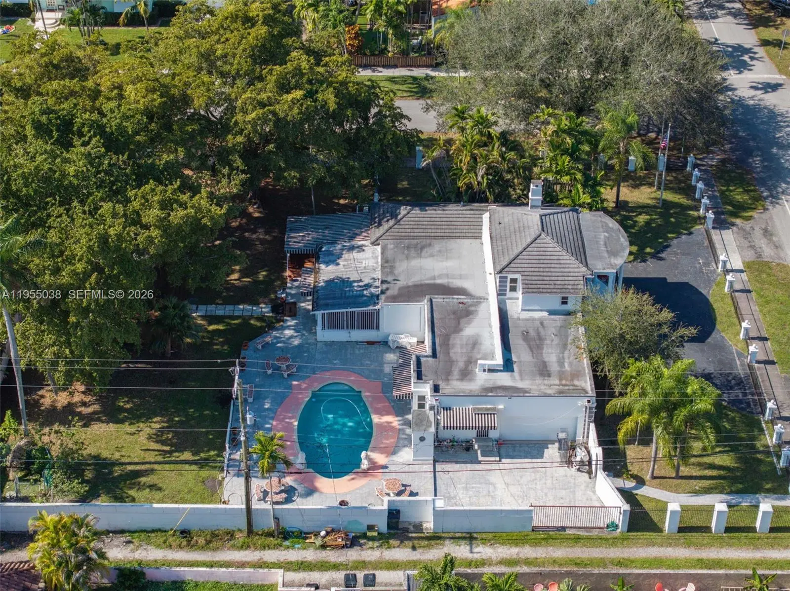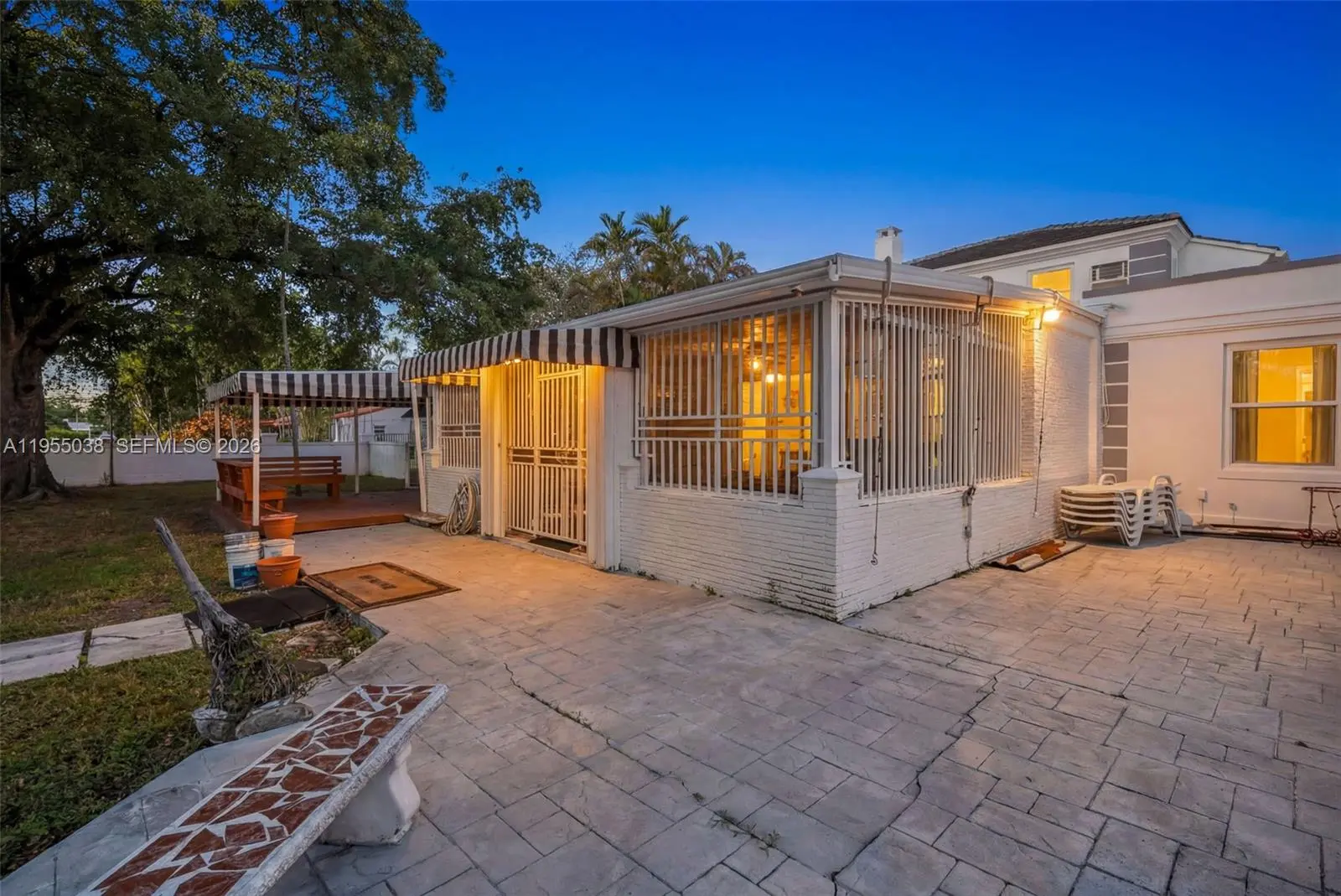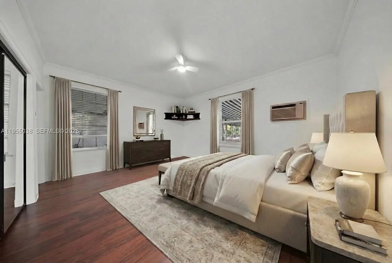 Situated on over 5 lots, an exquisite contrast of old & new defines this 5-bedroom, 4.5-bath residence. Original hardwood floors set the tone in the formal, elegant dining room & front room with a wood-burning fireplace. A family room/library with Mahogany French doors opening to a grand, almost 700sf sunroom filled w/ natural light (not included in square footage – 2022 mini split). Two downstairs primary bedrooms share a spacious, newly remodeled large Jack-and-Jill bathroom featuring dual shower heads (2024). A third downstairs bedroom functions perfectly as a nanny/housekeeper suite or office w/ access to a full bath. Upstairs, two en-suite bedrooms retain original hardwood floors & character. The (2023) remodeled, upgraded eat-in kitchen overlooks the pool & offers new cabinetry, appliances, LVP flooring, & abundant storage including a pantry, island seating storage, & concealed garbage bins. All enhanced by impact windows (w/transferable warranty, 2020) throughout. A two-car garage connects directly to the kitchen, accessed via the alley & includes extensive overhead storage. The fully enclosed private backyard is ideal for entertaining, featuring a swimming pool, bar area, half bath, fenced dog kennels, a 36-foot patio deck with 16-foot gazebo (2023), & a covered deck suited for games or outdoor dining. 2018 Main AC; 2019 Roof; 2021 Awnings; 2022 W/D; 2022 Exterior paint; 2023 Pool Resurfaced; 2025 Interior paint; 2025 New blinds in all bedrooms; 2025 New Pool Pump.
