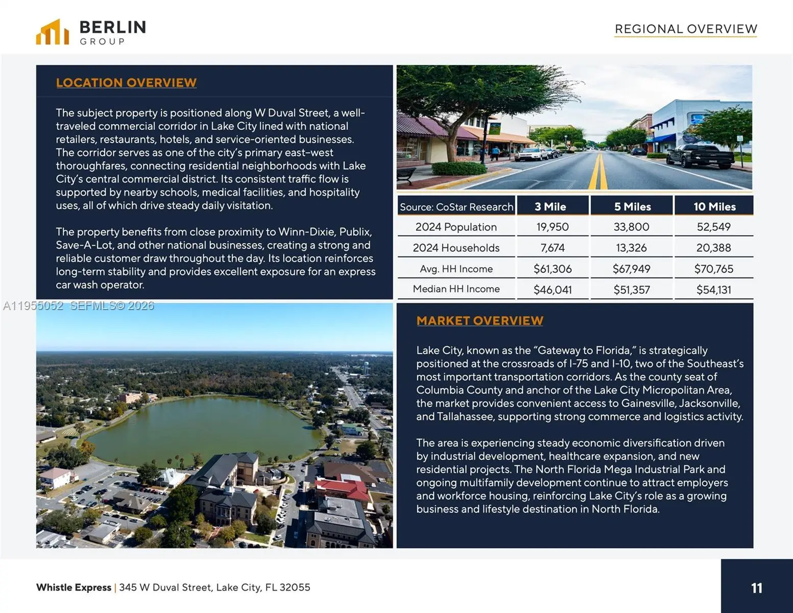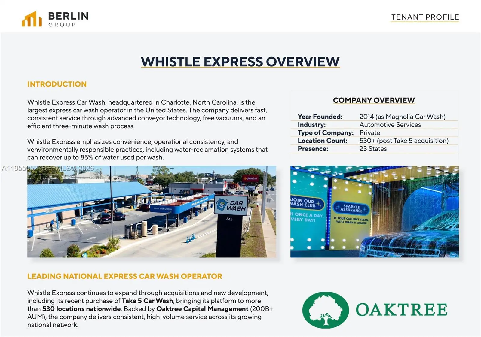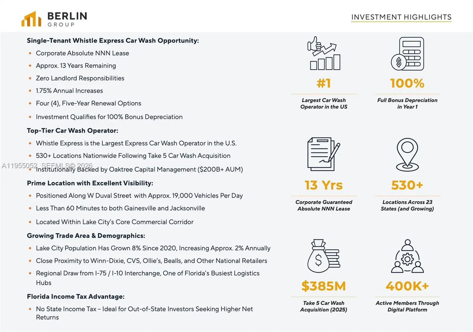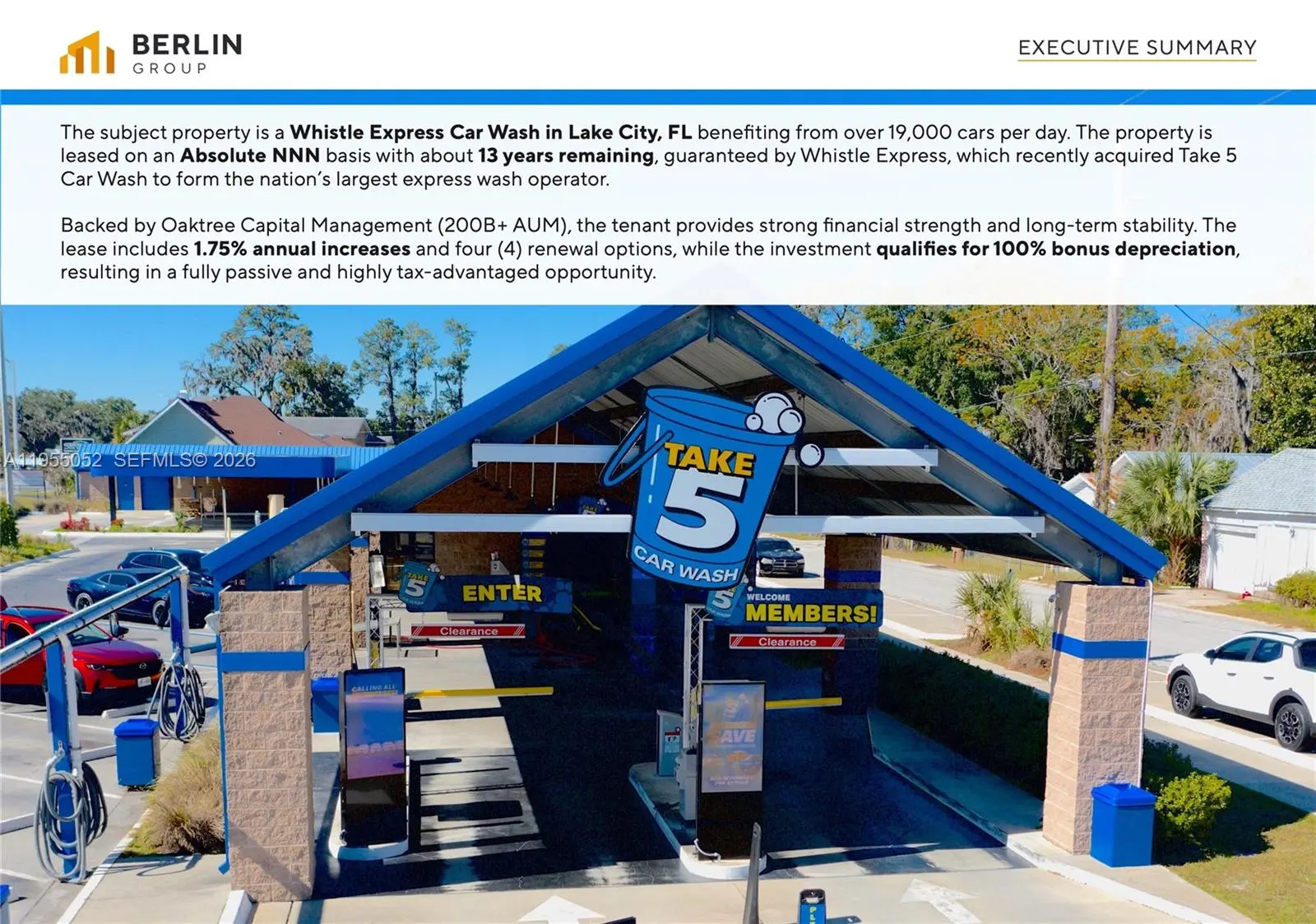 The subject property is a Whistle Express Car Wash in Lake City, FL benefiting from over 19,000 cars per day. The property is leased on an Absolute NNN basis with about 13 years remaining, guaranteed by Whistle Express, which recently acquired Take 5 Car Wash to form the nation’s largest express wash operator. Backed by Oaktree Capital Management (over $200 billion in assets under management), the tenant offers strong financial backing and long-term stability. The lease features 1.75% annual rent increases and four (4) renewal options, and the investment is eligible for accelerated depreciation, resulting in a fully passive and tax-efficient ownership opportunity.
