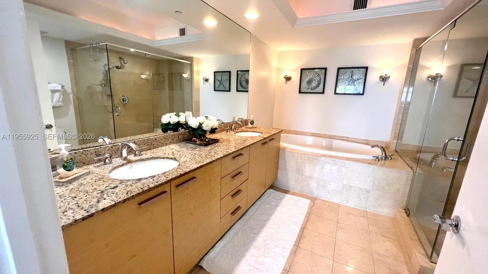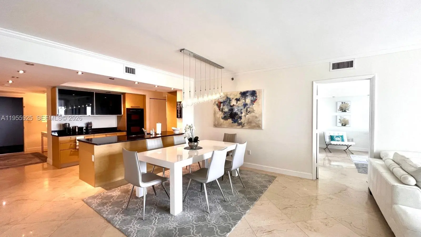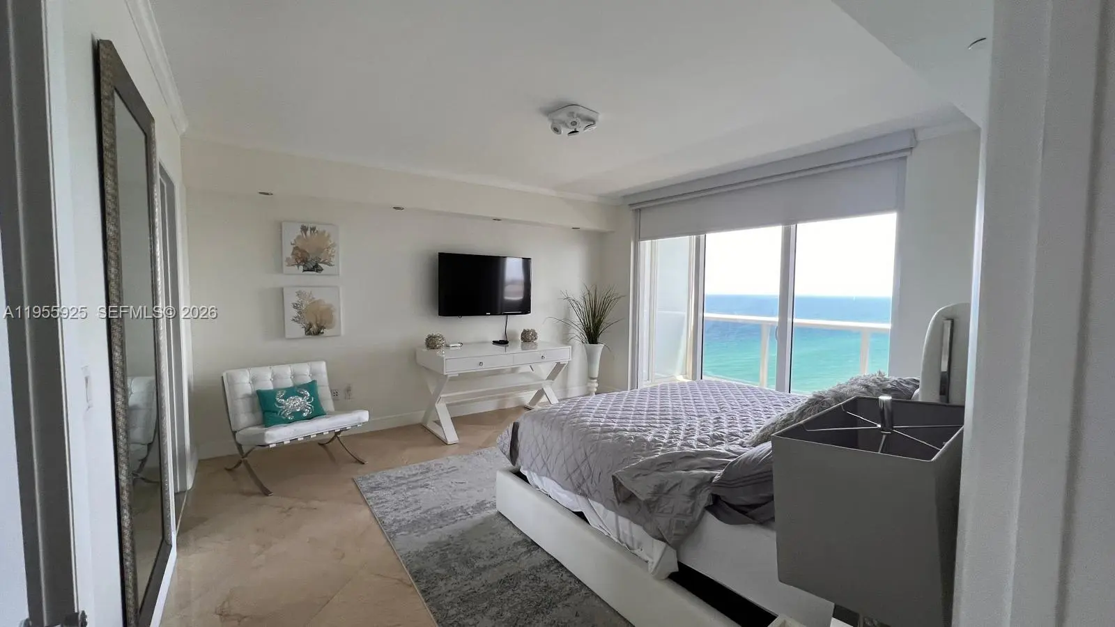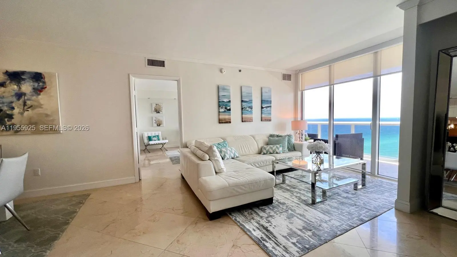 One of the most beautiful and lovingly furnished residences with desirable south exposure, offering breathtaking panoramic views of both the Atlantic Ocean and the Intracoastal Waterway. Bathed in natural sunlight throughout the day, this exceptional 2-bedroom + enclosed den / 3-bath home combines sophistication, comfort, and true coastal elegance. From the moment you enter, you are welcomed by refined marble floors that flow seamlessly throughout the living spaces, enhancing the sense of openness and light. The thoughtfully designed floor plan offers generous proportions, perfect for both relaxing and entertaining. The sleek European-style kitchen blends modern design with functionality, featuring quality finishes and ample cabinetry for effortless living. The spacious primary suite is a private sanctuary, complete with dual sinks, a luxurious Roman soaking tub, and a separate walk-in shower, creating a spa-like retreat within your own home. The enclosed den provides flexibility — ideal as a home office, guest space, or additional sitting area.Residents enjoy an unparalleled resort-style lifestyle with world-class amenities including eight spectacular swimming pools, an expansive 30,000 sq. ft. fitness and spa center, full-service valet parking, and a poolside restaurant and bar. Perfectly situated directly on the beach, this prime location places you just minutes from Florida’s finest shopping, dining, and entertainment destinations offering the ultimate blend of luxurY