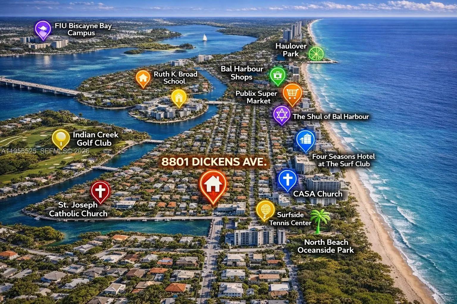 Imagine waking up each day in this charming corner pool home in Surfside, where the atmosphere is calm and relaxed, steps from the ocean, offering privacy, space, and a peaceful coastal setting. Situated on an oversized corner lot directly across from multi-million-dollar waterfront estates, this residence blends privacy, prestige, and long-term value. The beach, Bal Harbour Shops, Indian Creek Island — known as the “Billionaire Bunker” — parks, and local amenities are all within walking distance, creating a highly walkable coastal lifestyle. The home features 3 bedrooms and 2 bathrooms with an intelligent layout that separates the sleeping areas from the main living spaces. The spacious garage currently includes the laundry area and plumbing to reinstall a third bathroom, and it can be converted into an additional bedroom or flexible living space, offering the potential to create a comfortable fourth bedroom or expand the interior living area. A private side entrance provides additional flexibility for a home office, guest suite, or independent living space. Outdoors, enjoy a pool, Jacuzzi, summer kitchen, and covered terrace designed for year-round enjoyment and entertaining. With a 2020 roof, solid upgrades, limited inventory, and strong demand in Surfside, this property offers both lifestyle appeal and long-term value. Homes on quiet streets like this are rarely available.