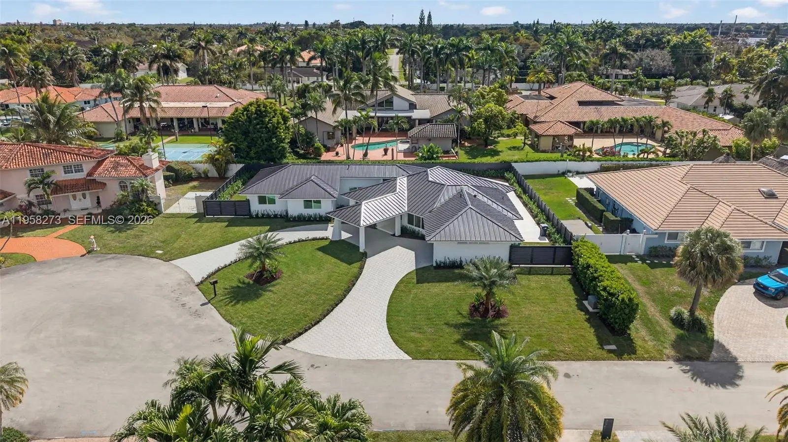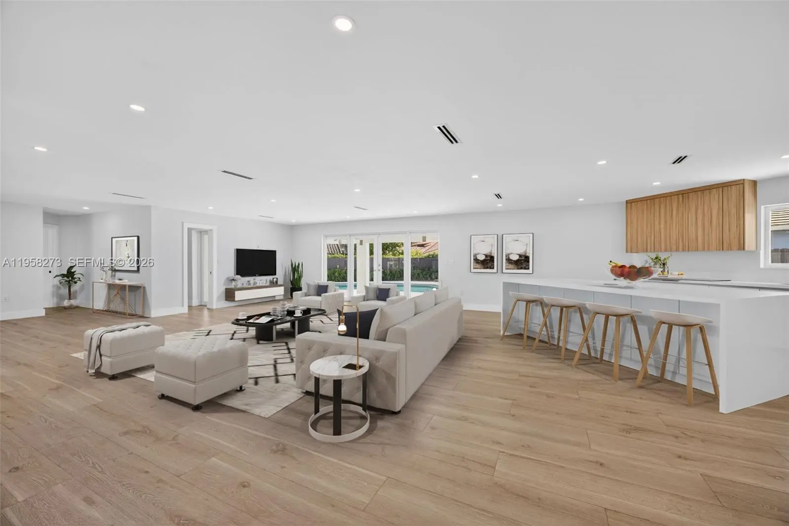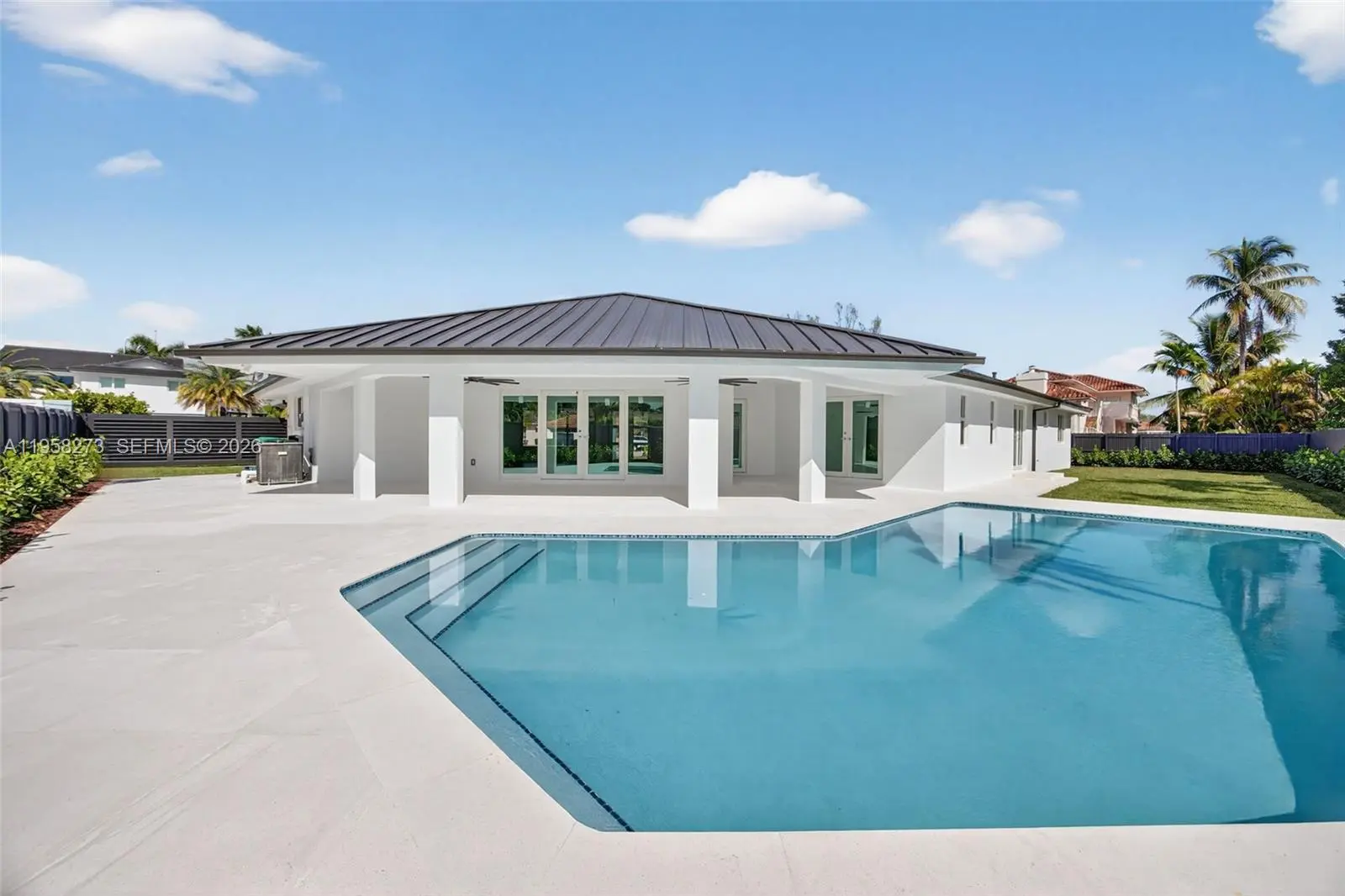 This luxurious estate has just undergone a comprehensive, newly completed renovation, delivering a refined and thoroughly modern living experience. Offering 4 bedrooms and 3 full bathrooms, the home showcases elevated design, quality materials, and meticulous craftsmanship throughout. Recent improvements include a new roof, impact windows, brand-new zoned A/C system, and modern recessed lighting that enhances the clean architectural lines and bright interiors. The reimagined kitchen serves as the heart of the home, featuring top-of-the-line Jenn-Air appliances, sleek cabinetry, and contemporary finishes designed for both everyday living and entertaining. Each bathroom reflects the same cohesive, modern aesthetic. The property also features a newly epoxied double-car garage, offering both functionality and a polished finish. Outdoor living is equally impressive, highlighted by a large yard and an updated pool, creating a private, resort-style setting ideal for relaxation or gatherings. With all renovations recently completed, this move-in-ready home offers the rare opportunity to enjoy a fully modernized residence that feels like new, while retaining the character of an established home—crafted for today’s discerning buyer. Ideally situated in a highly desirable location, the home offers convenient access to major shopping destinations, highly regarded schools, and key thoroughfares, providing both everyday convenience and long-term desirability.