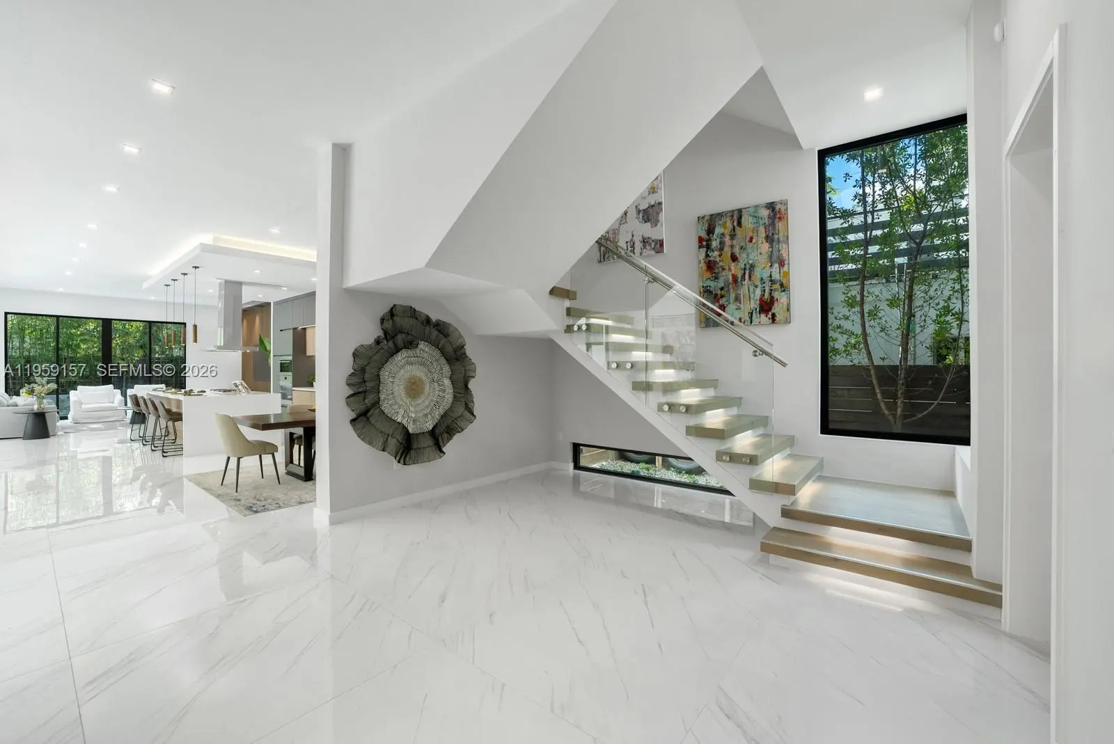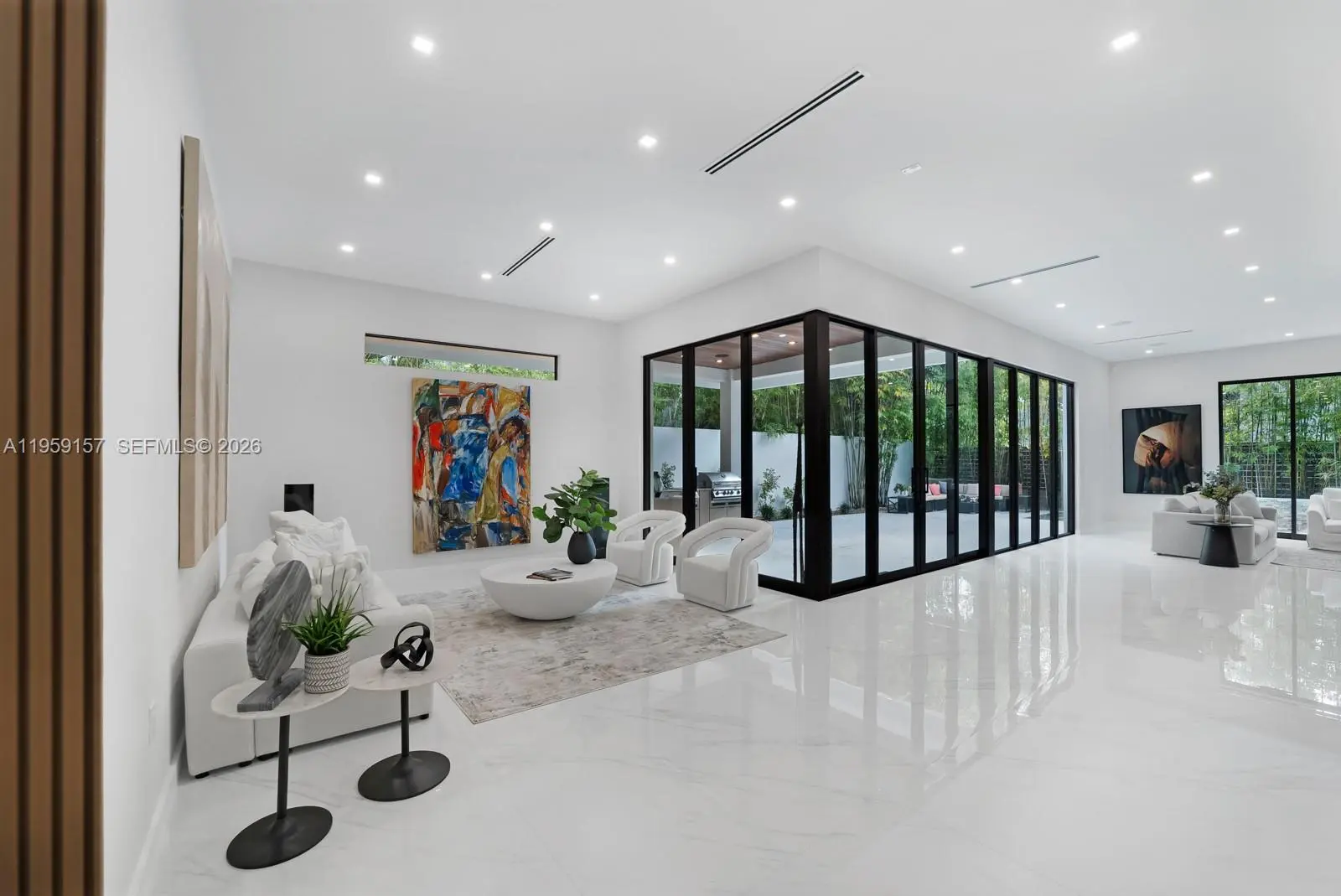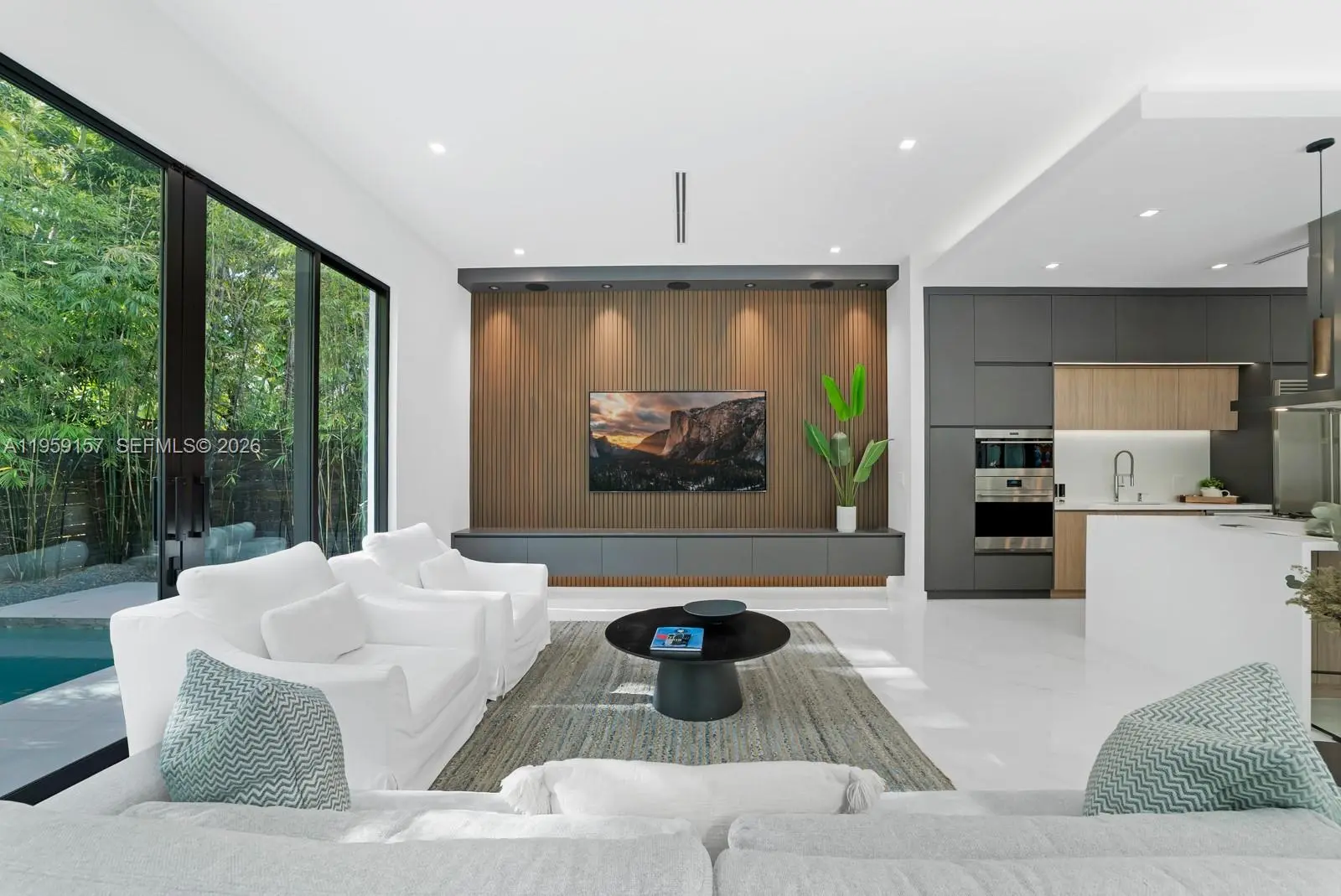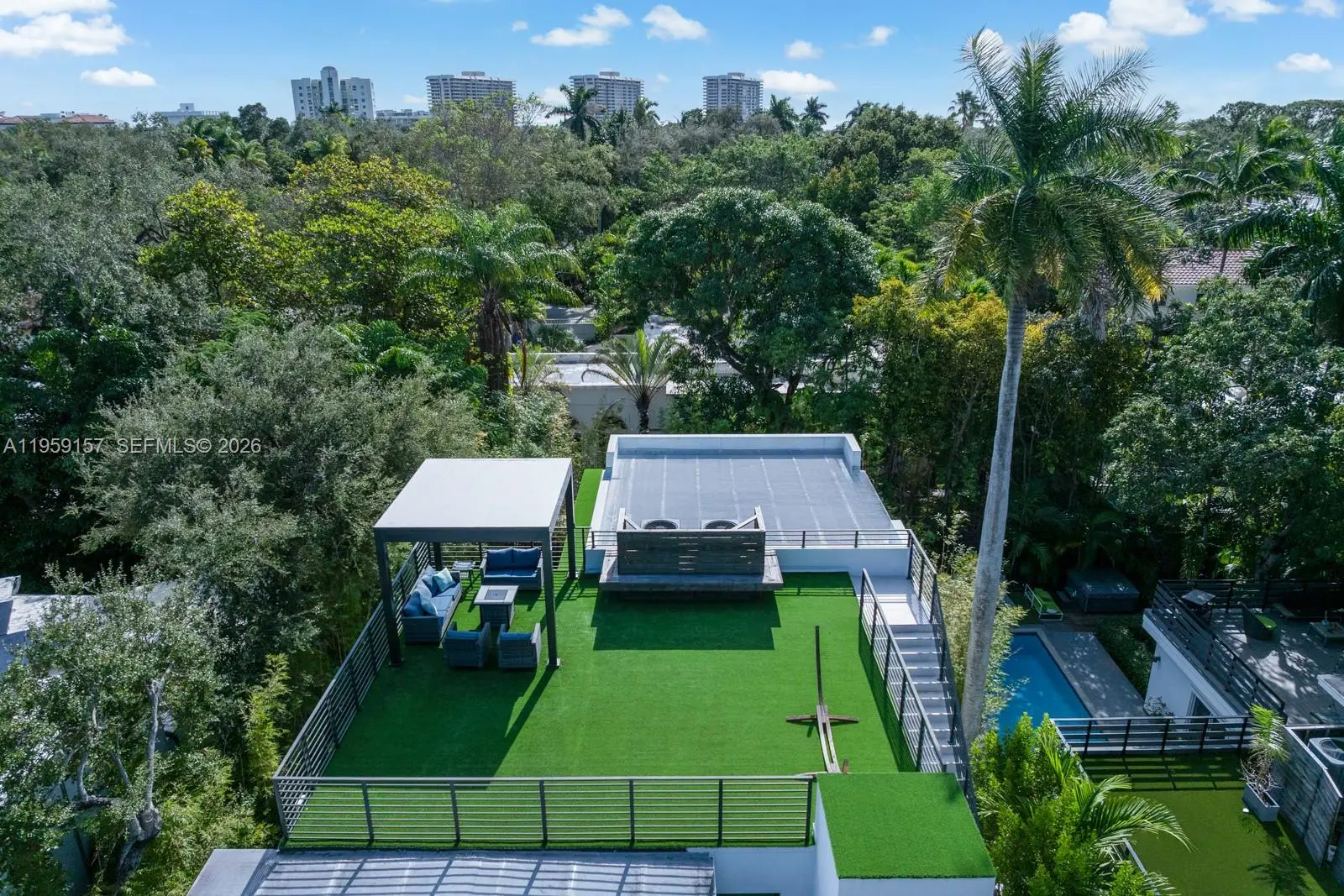 Unique opportunity to own this stunning, modern residence in the highly desirable and ultra-private North Grove section of Coconut Grove—one of Miami's most prestigious and serene neighborhoods. New Construction Nestled on a secluded cul-de-sac, this exceptional home offers unparalleled privacy and tranquility while enjoying prime proximity to the best of Coconut Grove living. With soaring 12-foot ceilings and a convenient elevator for effortless multi-level access, the residence features 5 spacious bedrooms and 4 bathrooms, including a downstairs guest/in-law suite with its own cabana bath for ultimate flexibility and comfort. The gourmet kitchen is an epicurean's dream, boasting a massive central cooking island, top-tier Sub-Zero, Wolf, and Miele appliances, and seamless flow for entertaining or everyday luxury. Luxurious details abound: 10-foot impact windows flooding the home with natural light, rich wood floors throughout, integrated security cameras, and sophisticated custom lighting. Step outside to your private oasis—a stunning saltwater pool illuminated by vibrant color LED lights, perfect for year-round relaxation in Miami's tropical climate. Ascend to the impressive 868 sq ft rooftop terrace, an entertainer's paradise with breathtaking views and endless potential for outdoor lounging, dining, or stargazing. A 2-car attached garage and thoughtful modern finishes that elevate everyday living Alumatech Gourmet exterior Kitchen with Bull Appliances.