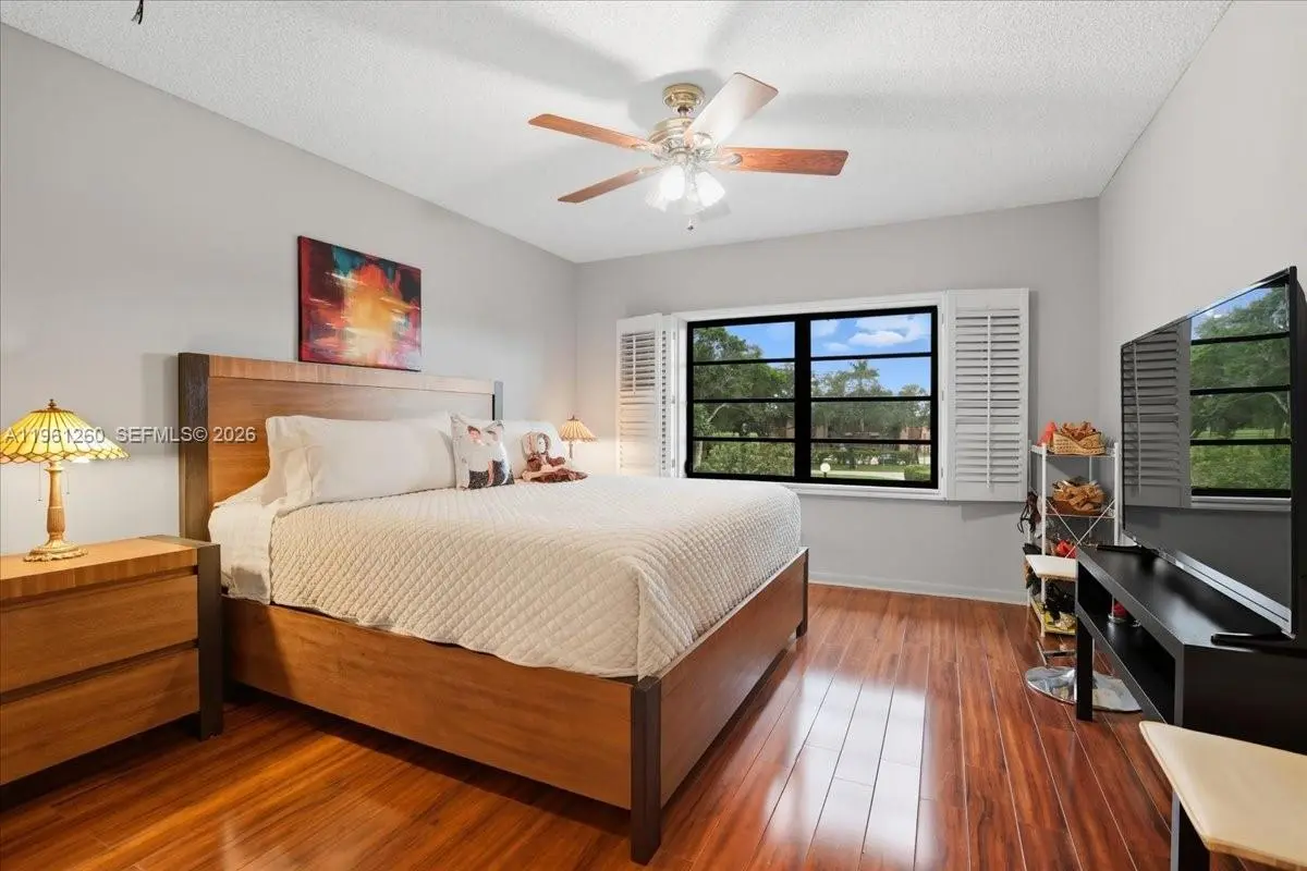 Rare legally combined corner residence in the gated Lago Mar community, offering 4 bedrooms, 3 bathrooms, and approximately 2,593 sq ft of living space with lake and golf-course views. This spacious home features an open living and dining layout, a large balcony, impact glass, in-unit laundry, generous storage, and a flexible office, den, or sitting area off the primary suite. The oversized primary retreat includes a walk-in closet and spacious bath, while the split layout offers comfort for family, guests, or work-from-home needs. Conveniently located near American Heritage School, Sawgrass Mills, dining, and major highways. A rare opportunity to own one of the larger residences in this desirable gated Plantation community.