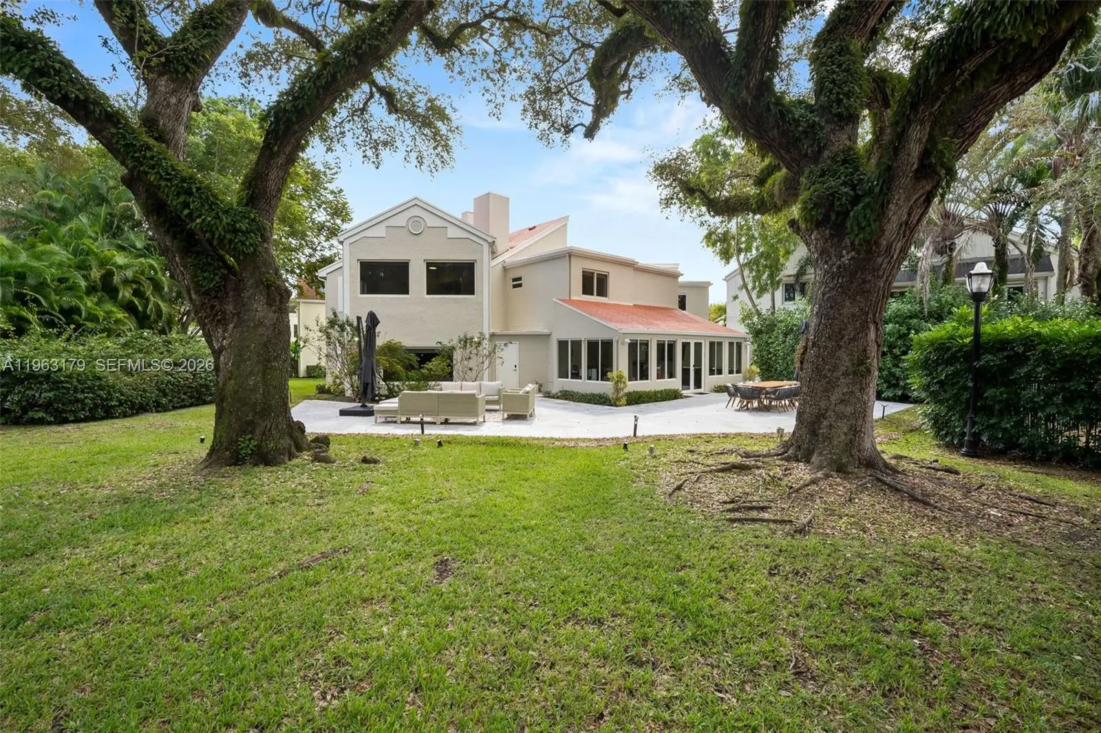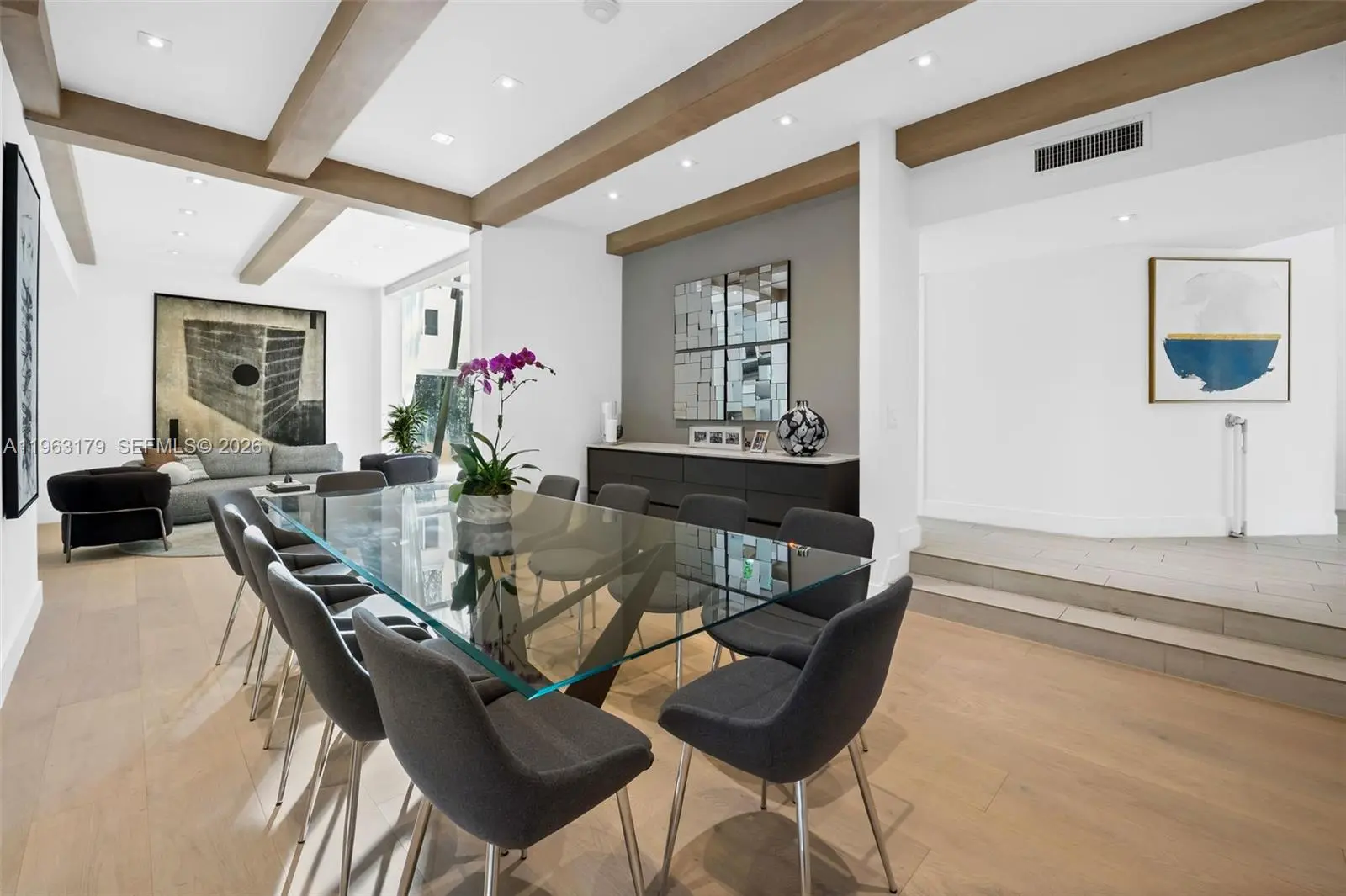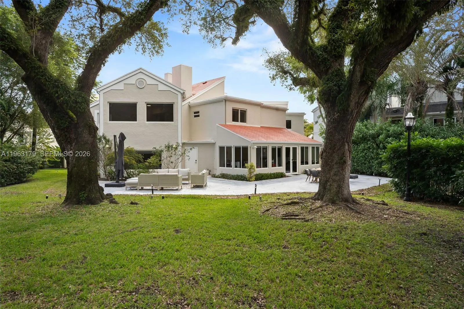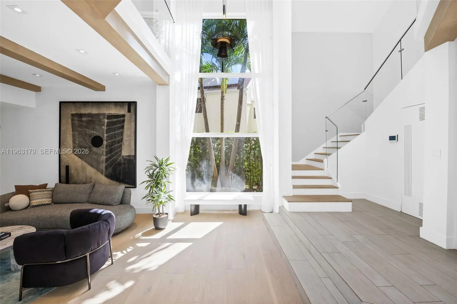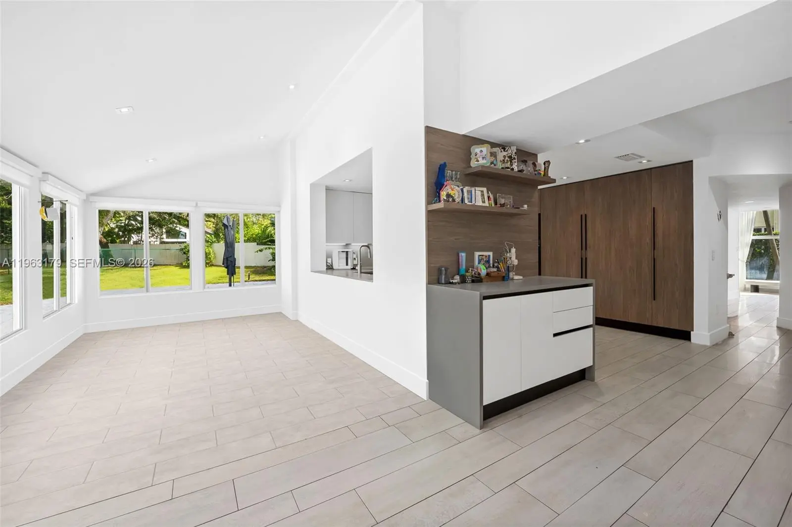 Located in The Chateaux, an exclusive gated enclave in North Miami Beach, this architecturally refined residence blends modern design, volume, privacy, and lifestyle amenities. Renovated, upgraded, and meticulously maintained, the home features soaring ceilings, exposed beams, skylights, and expansive windows that fill the interiors with natural light. Wide-plank flooring and refined finishes anchor the design-forward aesthetic. A striking floating staircase and open mezzanine add depth, while multiple living areas flow seamlessly for entertaining and everyday living. The kitchen offers custom cabinetry, integrated appliances, and generous storage, opening to adjacent dining and living spaces. The primary suite features vaulted ceilings, a spa-inspired bath, expansive custom walk-in closets, and a private sitting area ideal for a lounge or office. Secondary bedrooms are well-sized and thoughtfully designed. Outdoors, a stone patio and manicured lawn framed by mature oak trees create a serene setting. Ideally positioned within the community, the home enjoys direct access to sweeping green space and convenient proximity to the pool. Residents enjoy resort-style amenities including tennis, basketball and soccer courts, fitness center, and playground. Minutes from Aventura Mall, Bal Harbour, beaches, top schools, dining, and major thoroughfares, this exceptional residence offers space, privacy, and refined living in one of North Miami Beach’s most desirable neighborhoods.