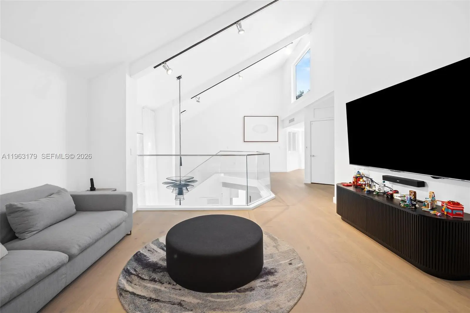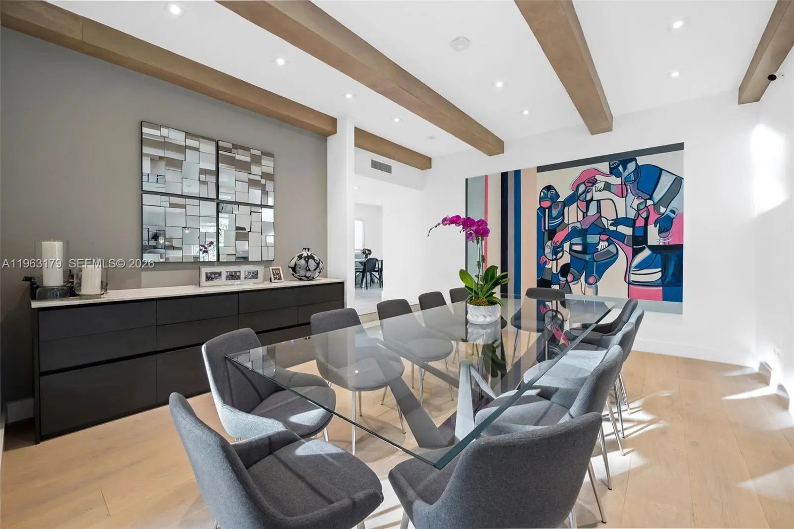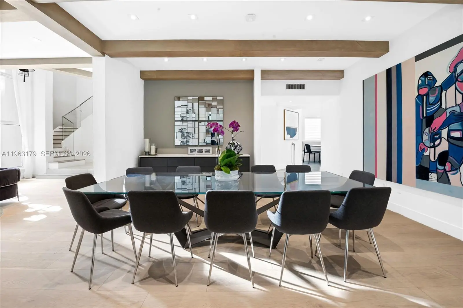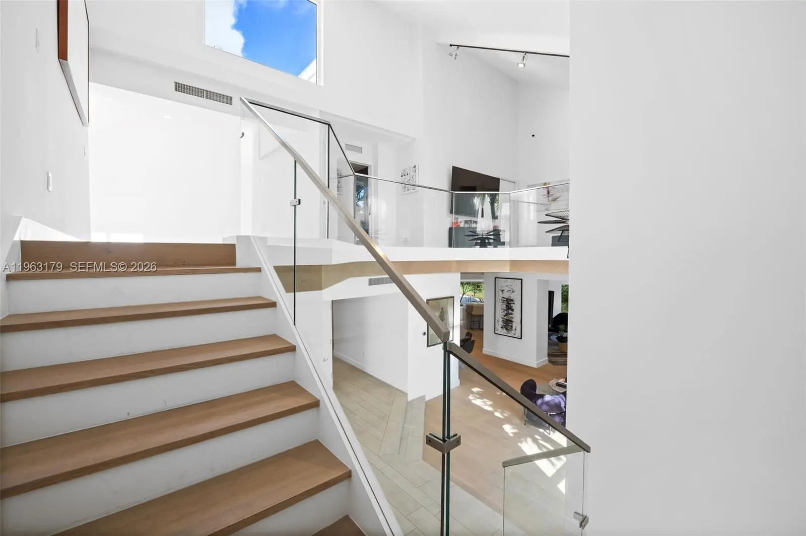 Located in The Chateaux, an exclusive gated enclave in North Miami Beach, this architecturally refined residence blends modern design, volume, privacy, and lifestyle amenities. Renovated, upgraded, and meticulously maintained, the home features soaring ceilings, exposed beams, skylights, and expansive windows that fill the interiors with natural light. Wide-plank flooring and refined finishes anchor the design-forward aesthetic. A striking floating staircase and open mezzanine add depth, while multiple living areas flow seamlessly for entertaining and everyday living. The kitchen offers custom cabinetry, integrated appliances, and generous storage, opening to adjacent dining and living spaces. The primary suite features vaulted ceilings, a spa-inspired bath, expansive custom walk-in closets, and a private sitting area ideal for a lounge or office. Secondary bedrooms are well-sized and thoughtfully designed. Outdoors, a stone patio and manicured lawn framed by mature oak trees create a serene setting. Ideally positioned within the community, the home enjoys direct access to sweeping green space and convenient proximity to the pool. Residents enjoy resort-style amenities including tennis, basketball and soccer courts, fitness center, and playground. Minutes from Aventura Mall, Bal Harbour, beaches, top schools, dining, and major thoroughfares, this exceptional residence offers space, privacy, and refined living in one of North Miami Beach’s most desirable neighborhoods.