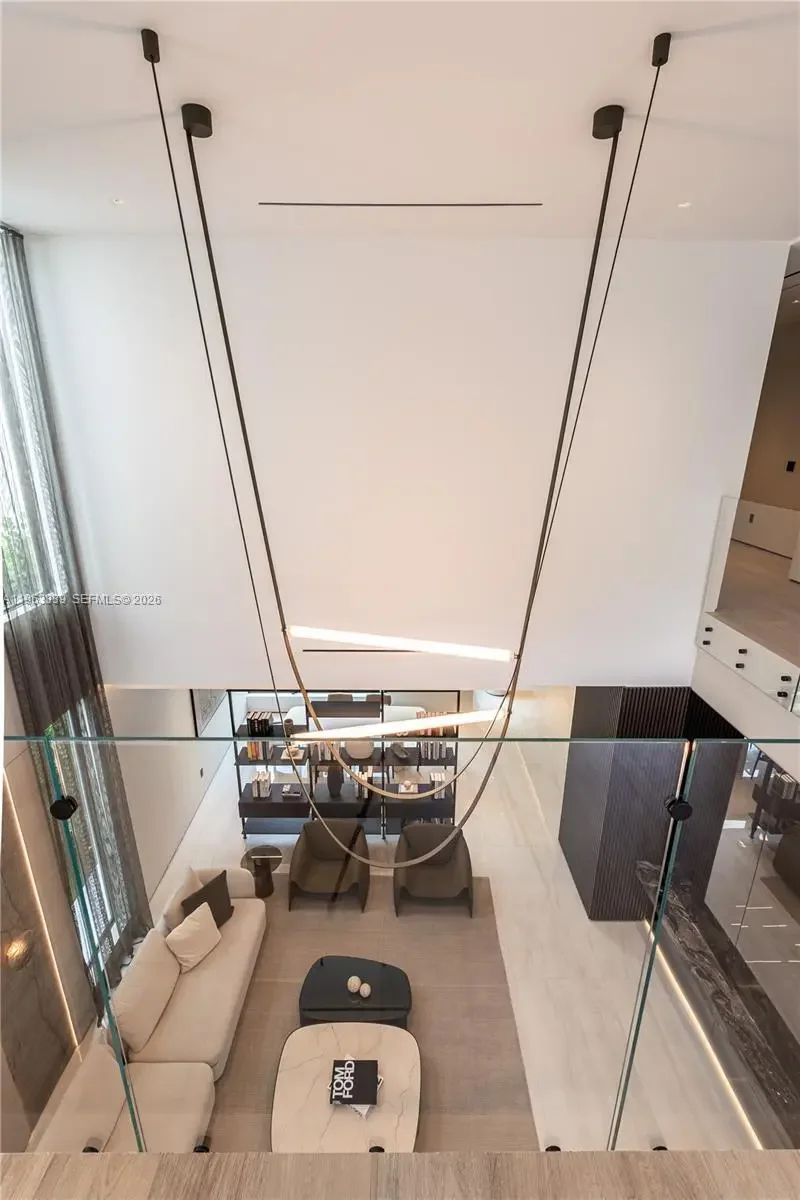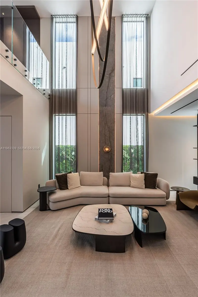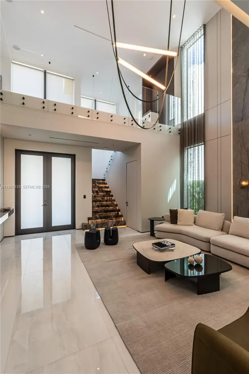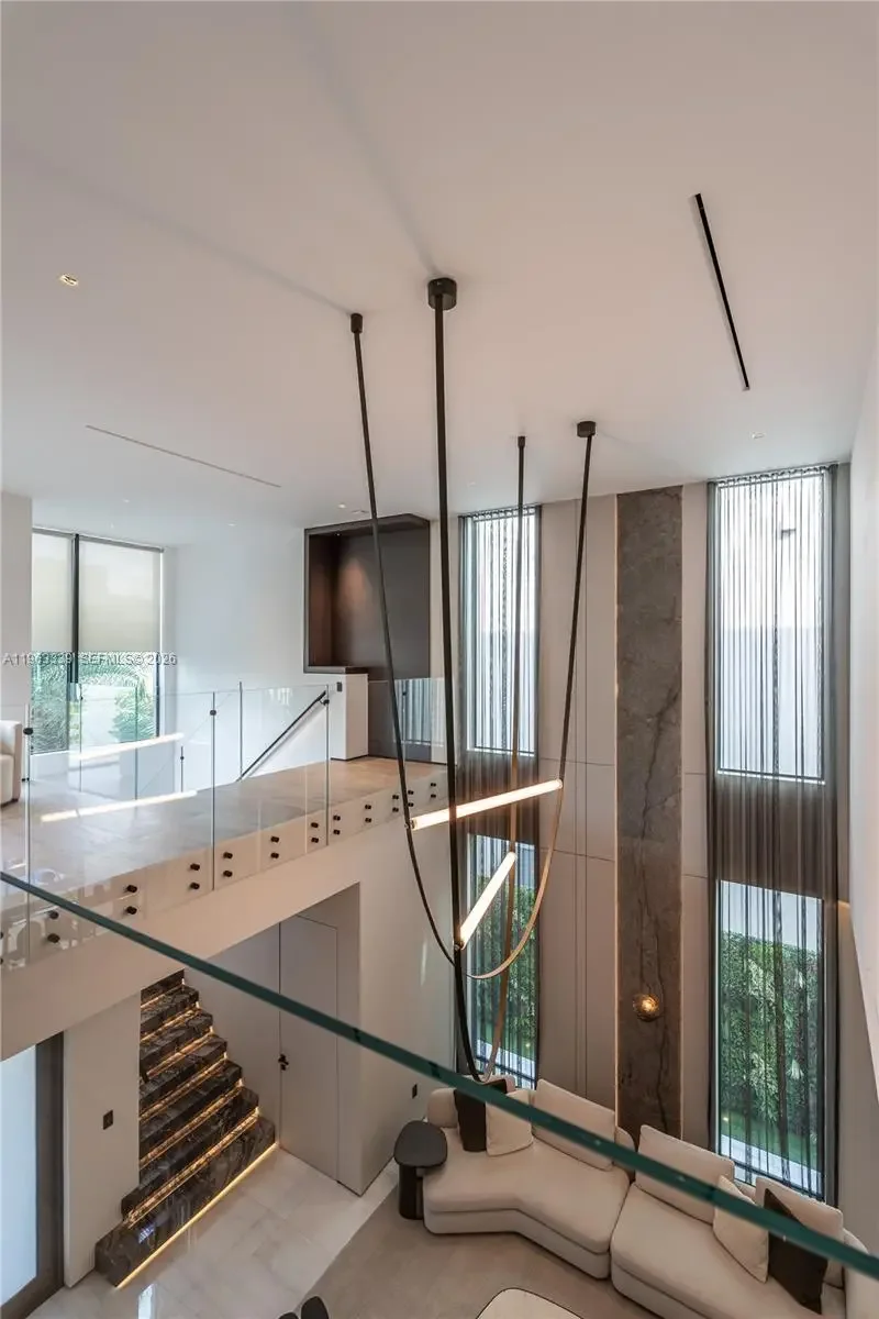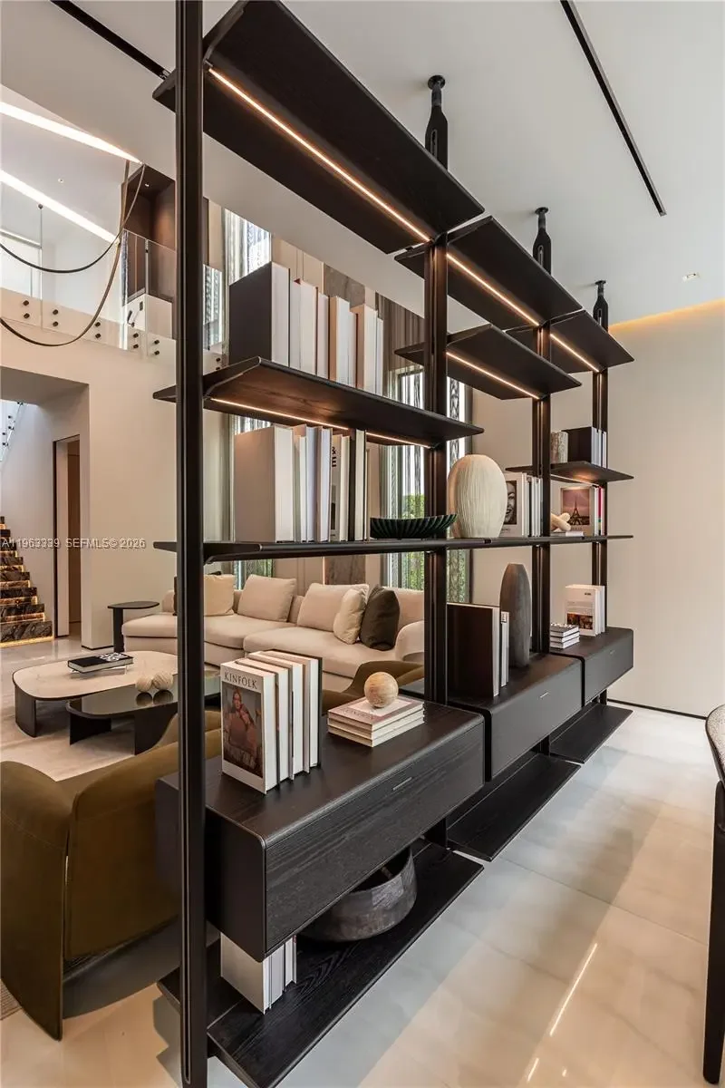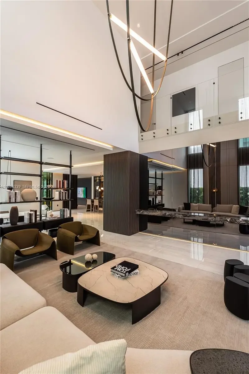 This minimalist contemporary luxury home is a masterfully designed residence curated with uncompromising attention to detail, delivering a true high-end living experience. The home features a full WAC architectural track lighting system throughout, complemented by recessed linear LEDs, ambient cove lighting, and a dramatic Flos AIM statement fixture accentuating the double-height living space. A fully integrated Smart Home system with Lutron Shades and Control4 allows seamless control of lighting, climate, and ambiance, while a whole-home speaker system provides integrated audio throughout. Interiors showcasing sculptural contemporary pieces and anchored by a striking Lexington central shelving unit by Poliform, conceived as a gallery-style architectural focal point. The residence is finished with large-format marble-design flooring and flawless Level 5 smooth wall finishes, reflecting a museum-quality execution. Custom sheer and blackout drapery systems provide refined light control and privacy throughout. The Italian Poliform kitchen is a true showpiece, featuring sleek European cabinetry, premium integrated appliances, and an oversized full-slab waterfall island—ideal for both entertaining and everyday luxury living. The primary suite offers a boutique-style custom walk-in closet with illuminated shelving. A finished garage adds versatility as a lounge, studio, or private gym. Every element of this home reflects a refined, luxury standard.