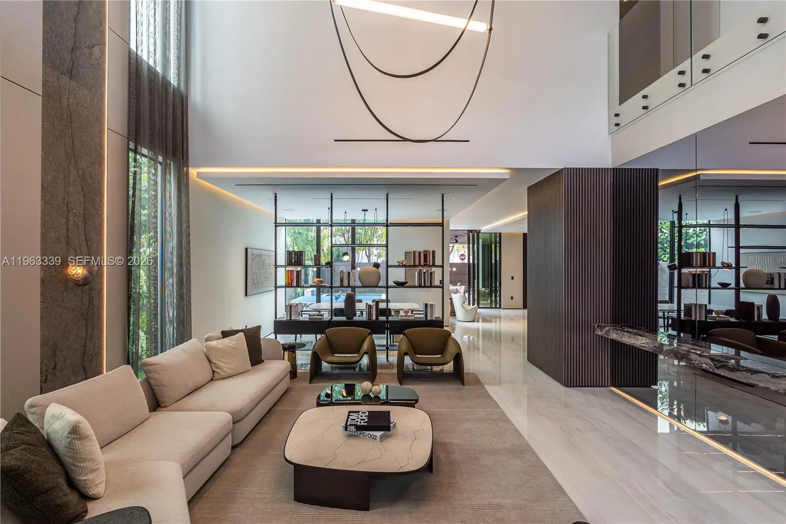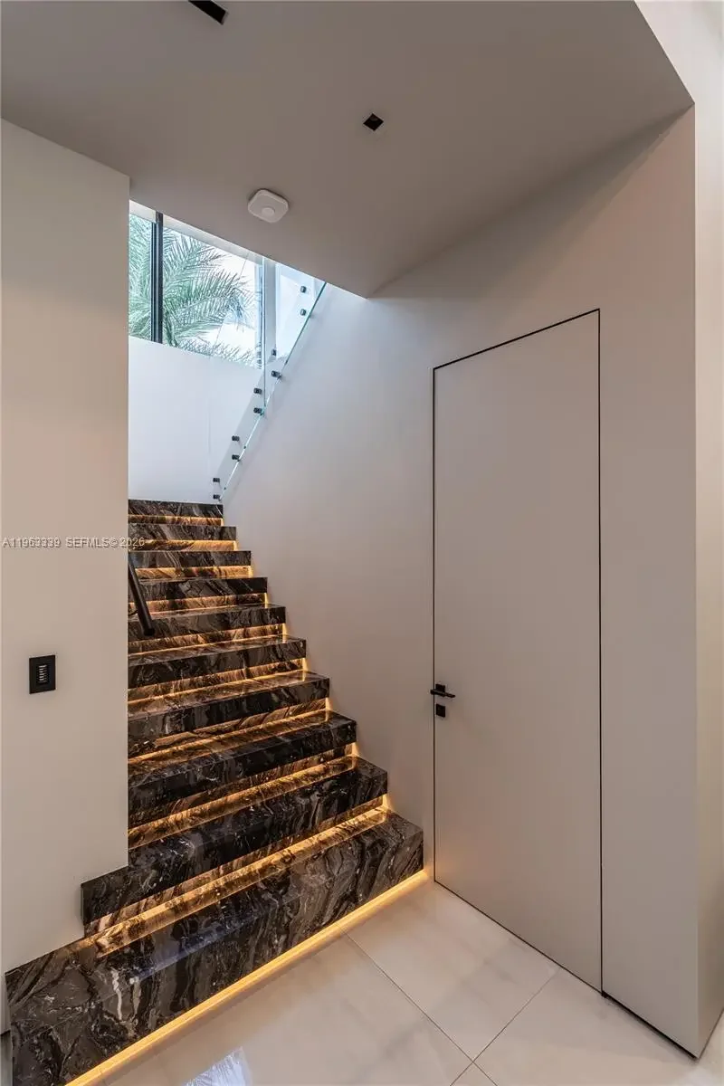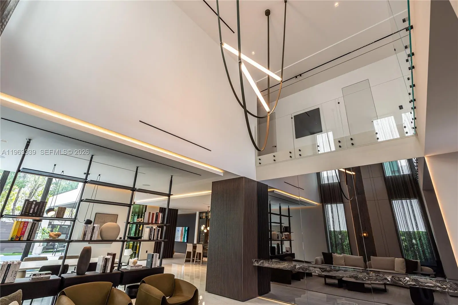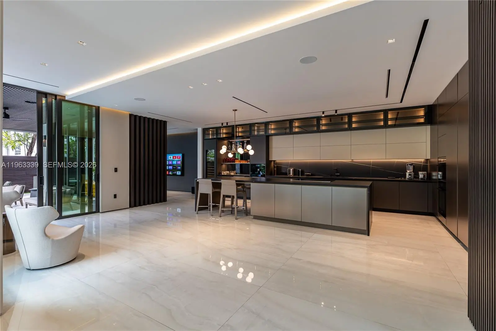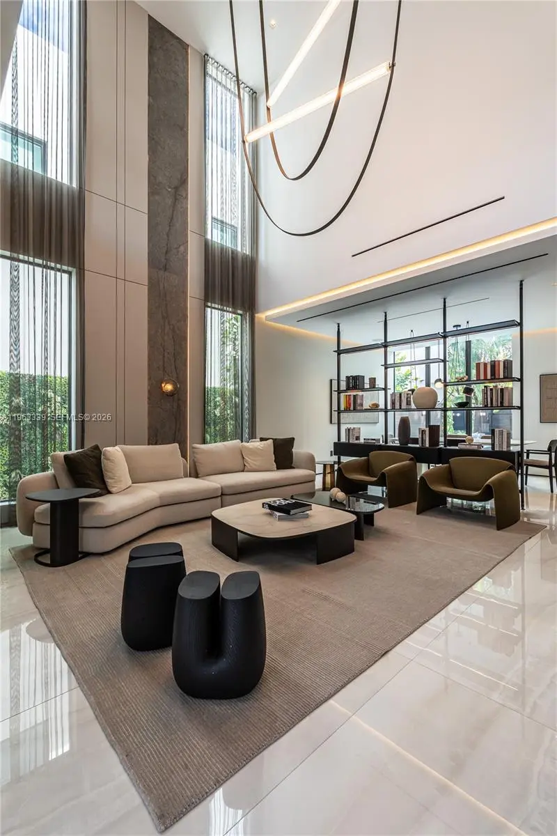 This minimalist contemporary luxury home is a masterfully designed residence curated with uncompromising attention to detail, delivering a true high-end living experience. The home features a full WAC architectural track lighting system throughout, complemented by recessed linear LEDs, ambient cove lighting, and a dramatic Flos AIM statement fixture accentuating the double-height living space. A fully integrated Smart Home system with Lutron Shades and Control4 allows seamless control of lighting, climate, and ambiance, while a whole-home speaker system provides integrated audio throughout. Interiors showcasing sculptural contemporary pieces and anchored by a striking Lexington central shelving unit by Poliform, conceived as a gallery-style architectural focal point. The residence is finished with large-format marble-design flooring and flawless Level 5 smooth wall finishes, reflecting a museum-quality execution. Custom sheer and blackout drapery systems provide refined light control and privacy throughout. The Italian Poliform kitchen is a true showpiece, featuring sleek European cabinetry, premium integrated appliances, and an oversized full-slab waterfall island—ideal for both entertaining and everyday luxury living. The primary suite offers a boutique-style custom walk-in closet with illuminated shelving. A finished garage adds versatility as a lounge, studio, or private gym. Every element of this home reflects a refined, luxury standard.