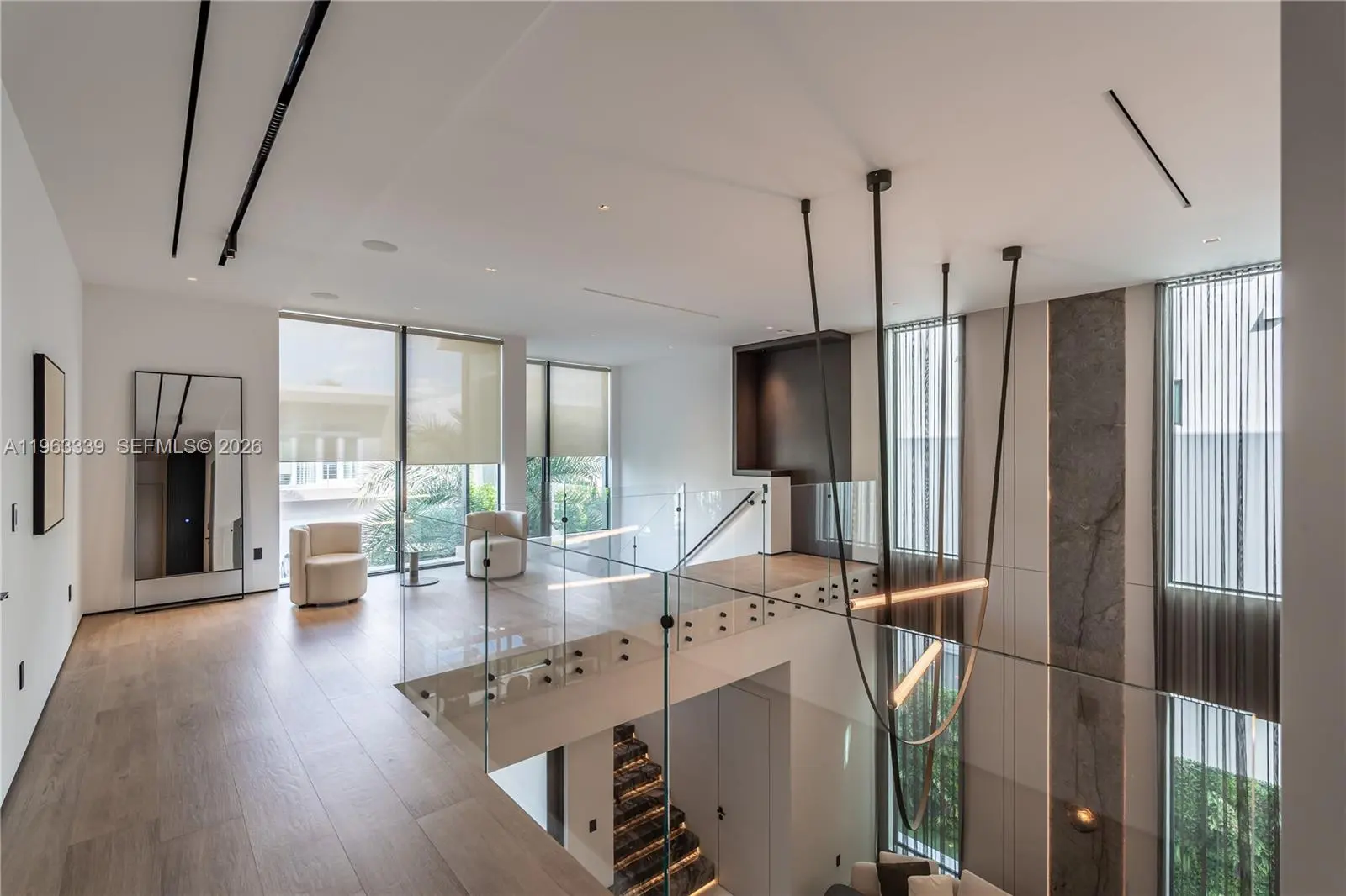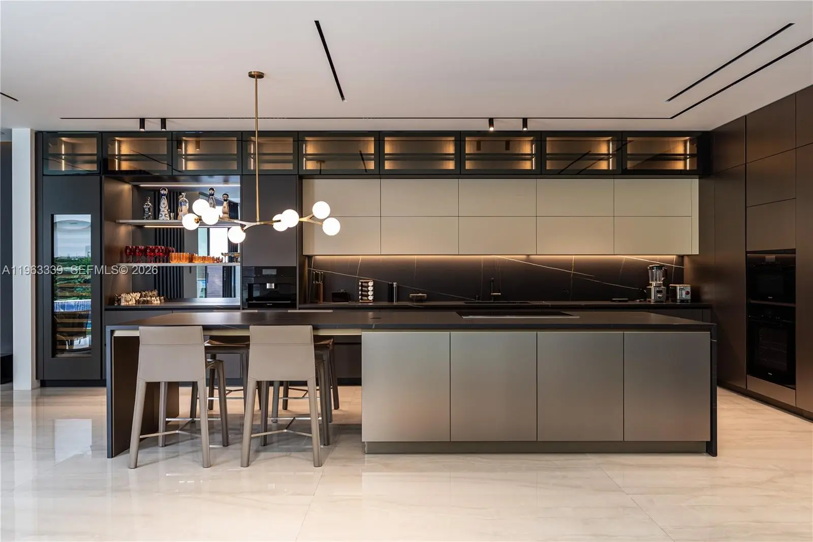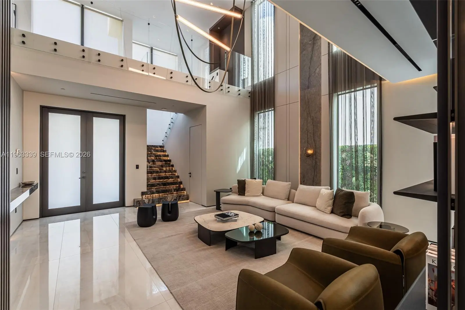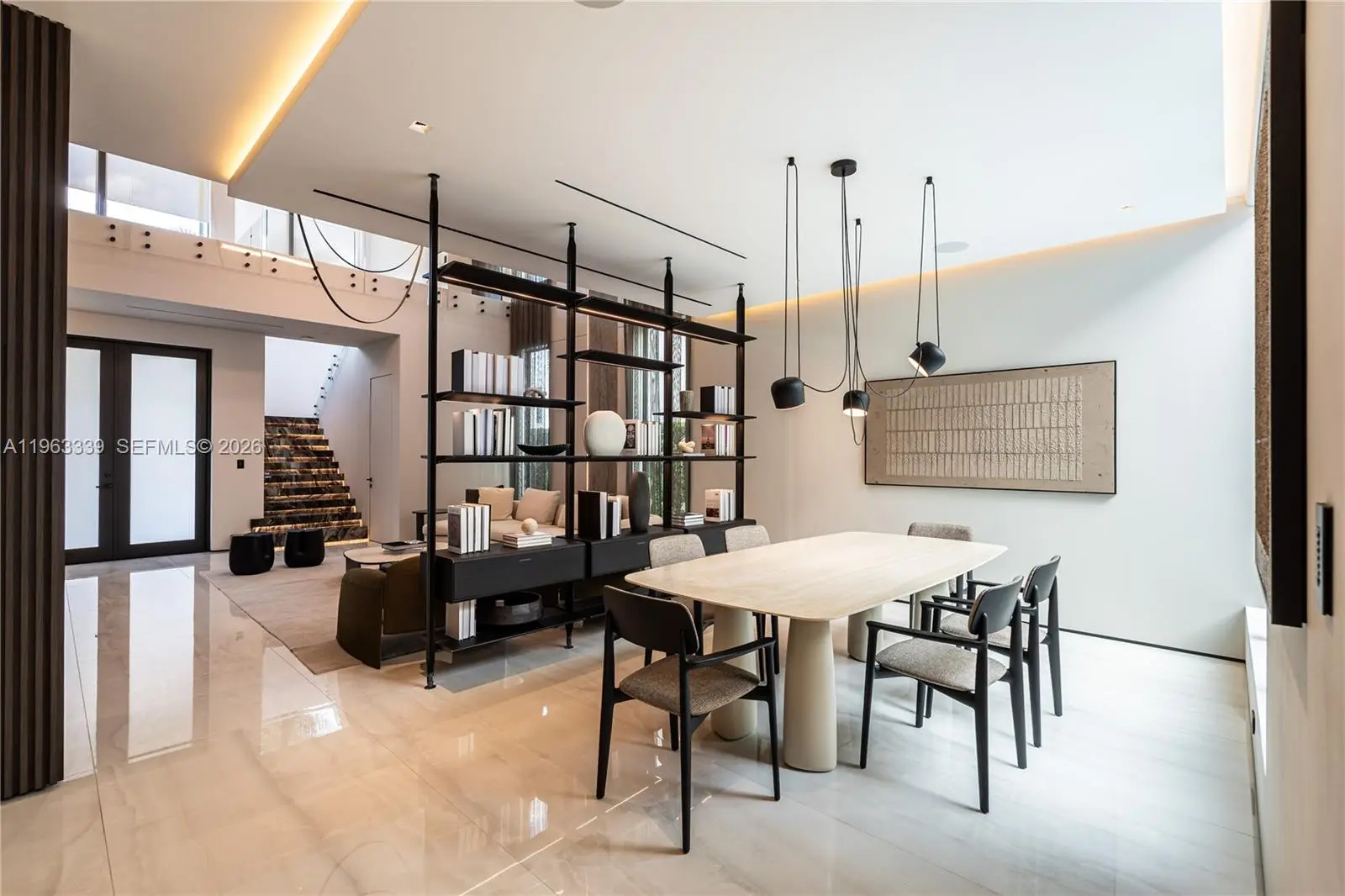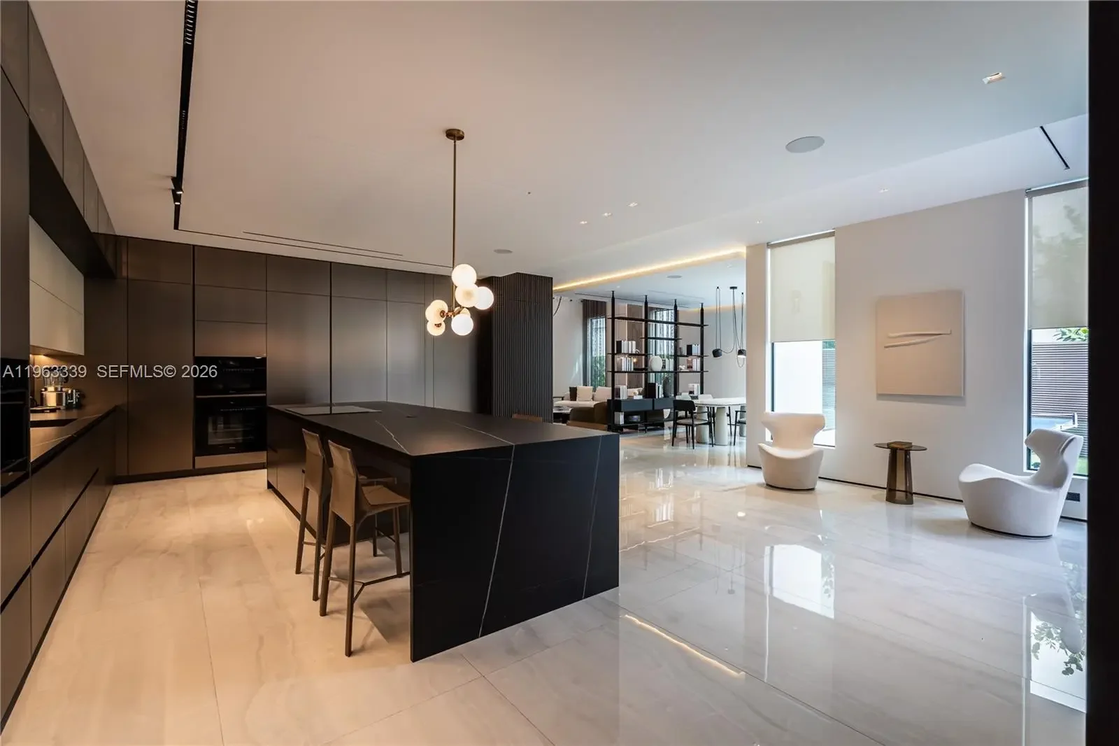 This minimalist contemporary luxury home is a masterfully designed residence curated with uncompromising attention to detail, delivering a true high-end living experience. The home features a full WAC architectural track lighting system throughout, complemented by recessed linear LEDs, ambient cove lighting, and a dramatic Flos AIM statement fixture accentuating the double-height living space. A fully integrated Smart Home system with Lutron Shades and Control4 allows seamless control of lighting, climate, and ambiance, while a whole-home speaker system provides integrated audio throughout. Interiors showcasing sculptural contemporary pieces and anchored by a striking Lexington central shelving unit by Poliform, conceived as a gallery-style architectural focal point. The residence is finished with large-format marble-design flooring and flawless Level 5 smooth wall finishes, reflecting a museum-quality execution. Custom sheer and blackout drapery systems provide refined light control and privacy throughout. The Italian Poliform kitchen is a true showpiece, featuring sleek European cabinetry, premium integrated appliances, and an oversized full-slab waterfall island—ideal for both entertaining and everyday luxury living. The primary suite offers a boutique-style custom walk-in closet with illuminated shelving. A finished garage adds versatility as a lounge, studio, or private gym. Every element of this home reflects a refined, luxury standard.