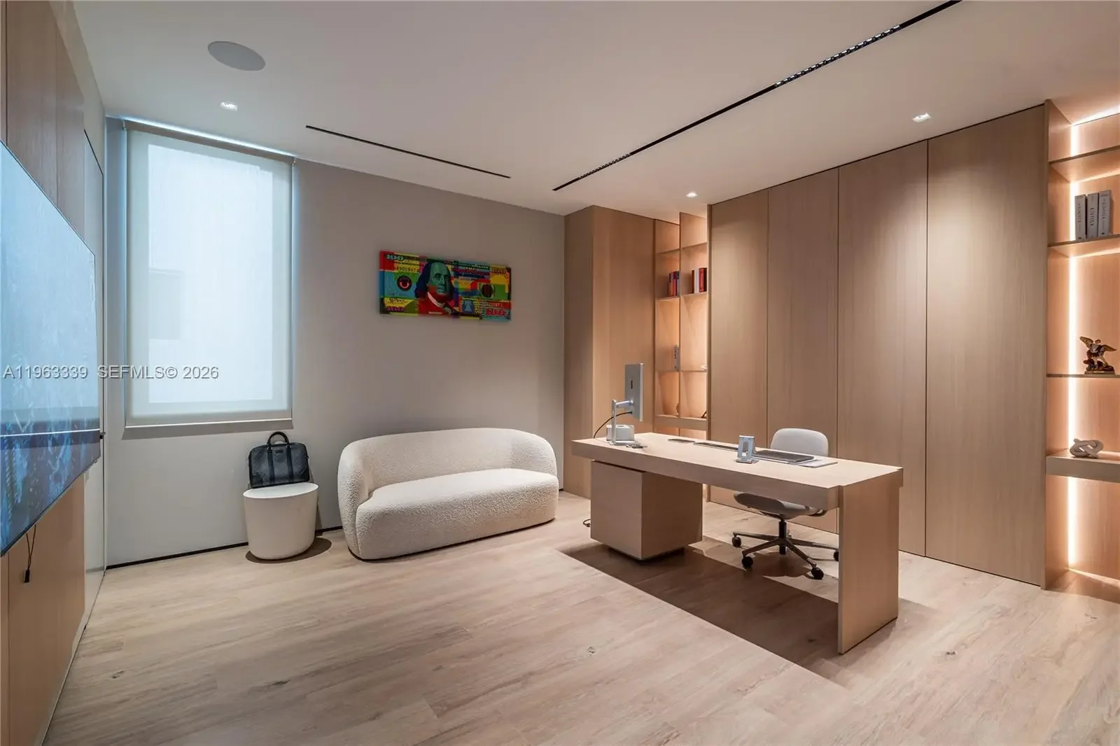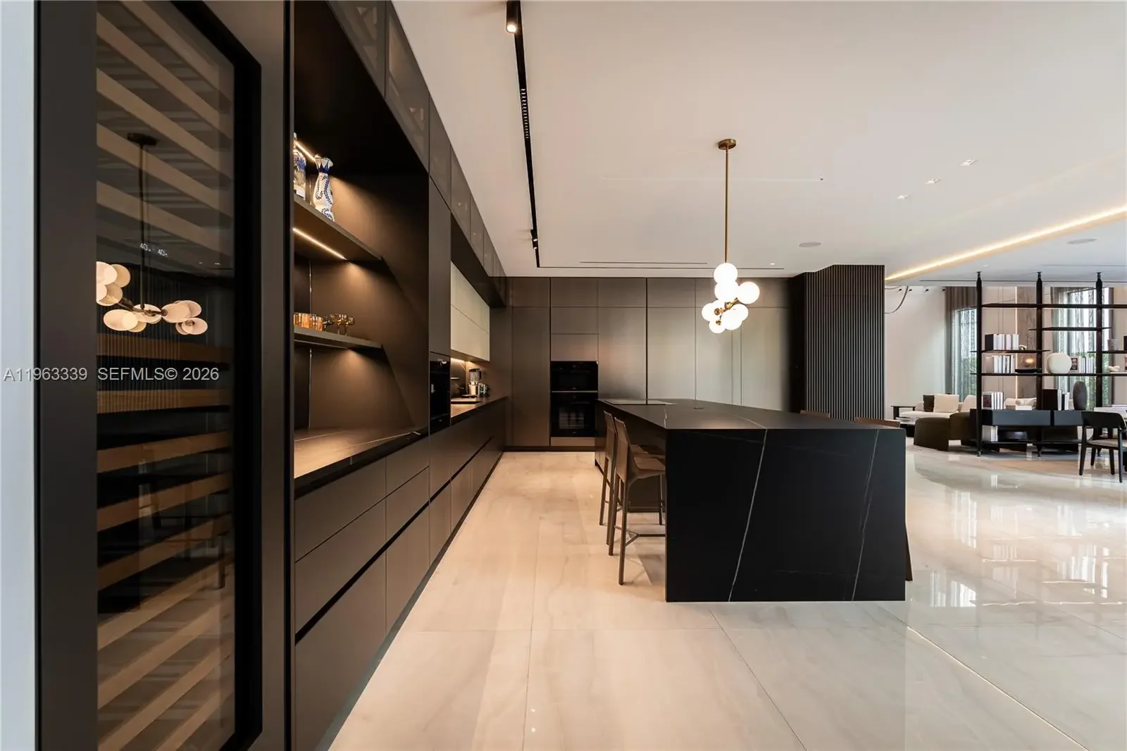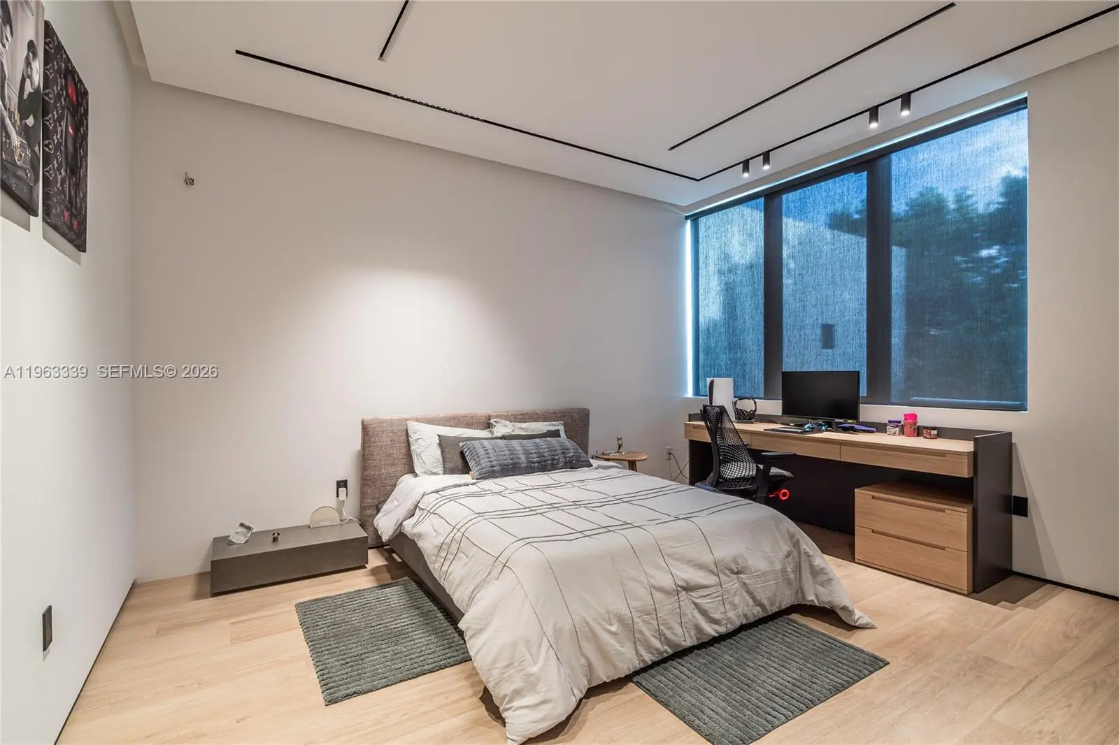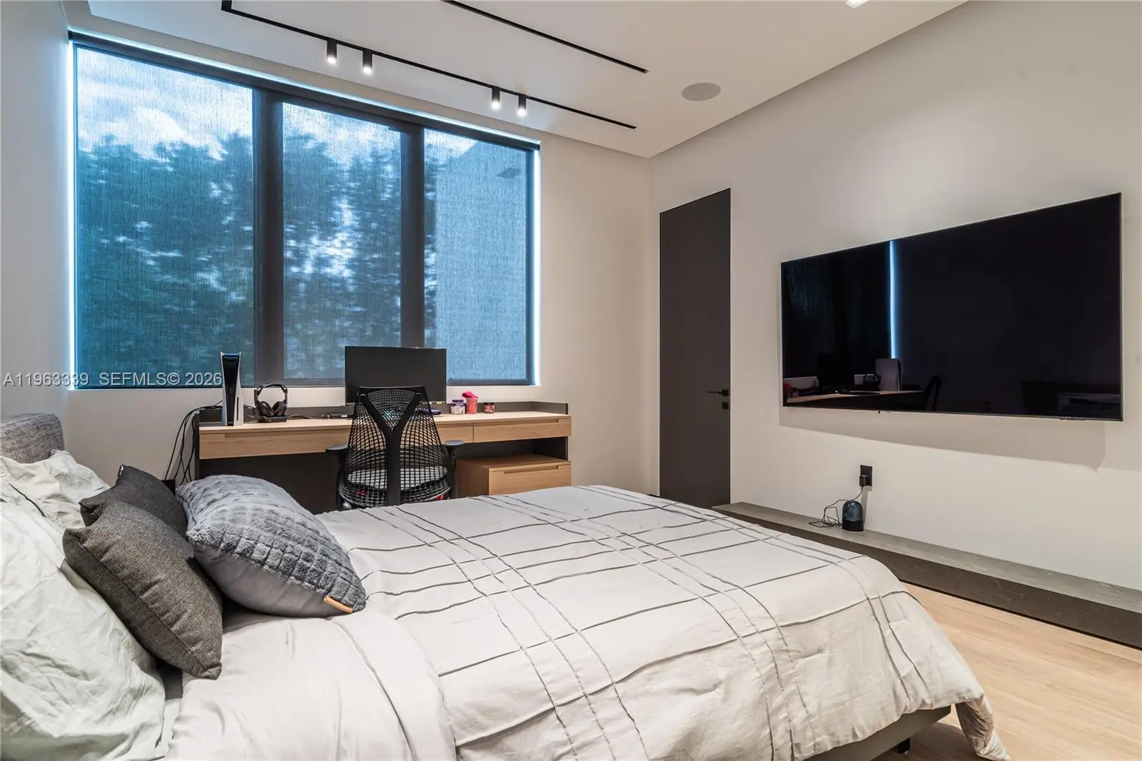 This minimalist contemporary luxury home is a masterfully designed residence curated with uncompromising attention to detail, delivering a true high-end living experience. The home features a full WAC architectural track lighting system throughout, complemented by recessed linear LEDs, ambient cove lighting, and a dramatic Flos AIM statement fixture accentuating the double-height living space. A fully integrated Smart Home system with Lutron Shades and Control4 allows seamless control of lighting, climate, and ambiance, while a whole-home speaker system provides integrated audio throughout. Interiors showcasing sculptural contemporary pieces and anchored by a striking Lexington central shelving unit by Poliform, conceived as a gallery-style architectural focal point. The residence is finished with large-format marble-design flooring and flawless Level 5 smooth wall finishes, reflecting a museum-quality execution. Custom sheer and blackout drapery systems provide refined light control and privacy throughout. The Italian Poliform kitchen is a true showpiece, featuring sleek European cabinetry, premium integrated appliances, and an oversized full-slab waterfall island—ideal for both entertaining and everyday luxury living. The primary suite offers a boutique-style custom walk-in closet with illuminated shelving. A finished garage adds versatility as a lounge, studio, or private gym. Every element of this home reflects a refined, luxury standard.
