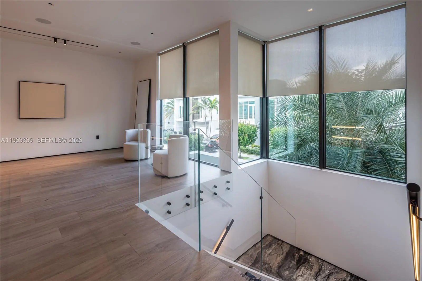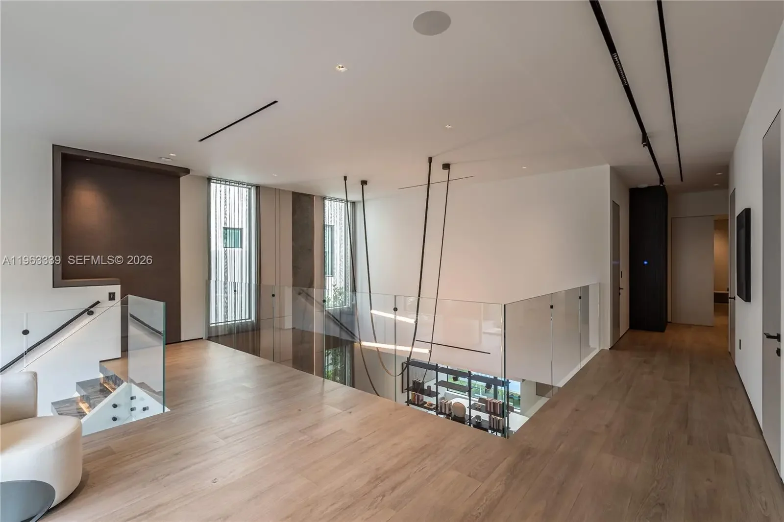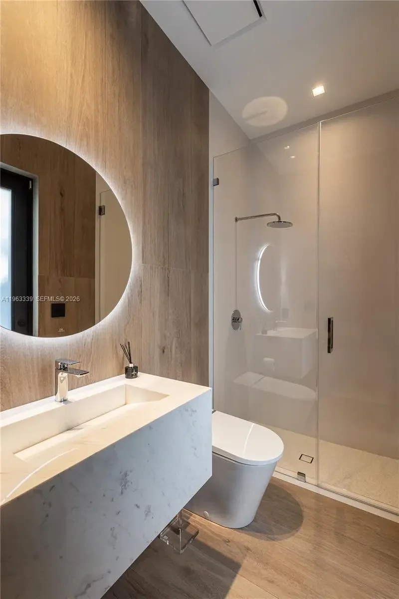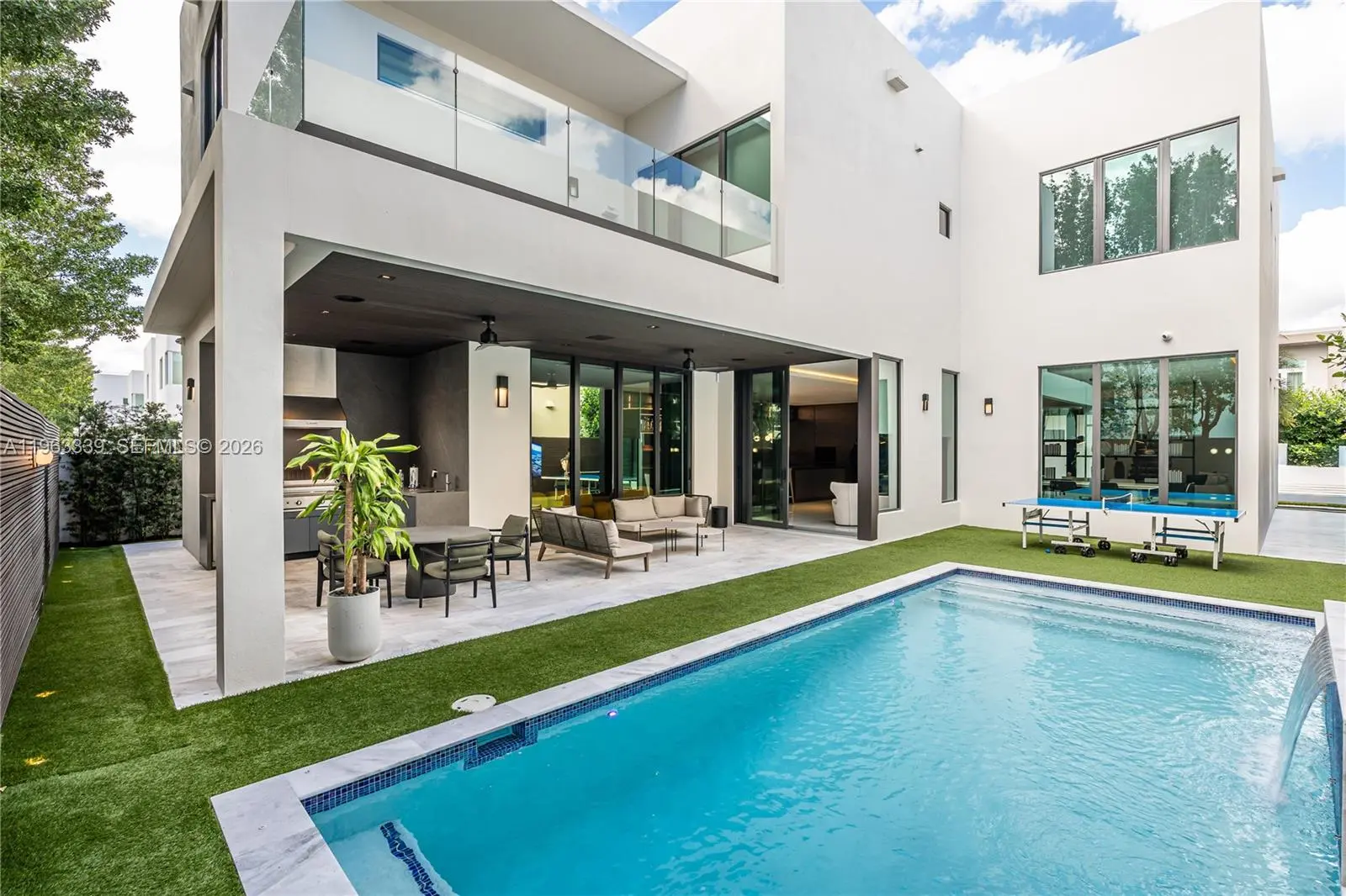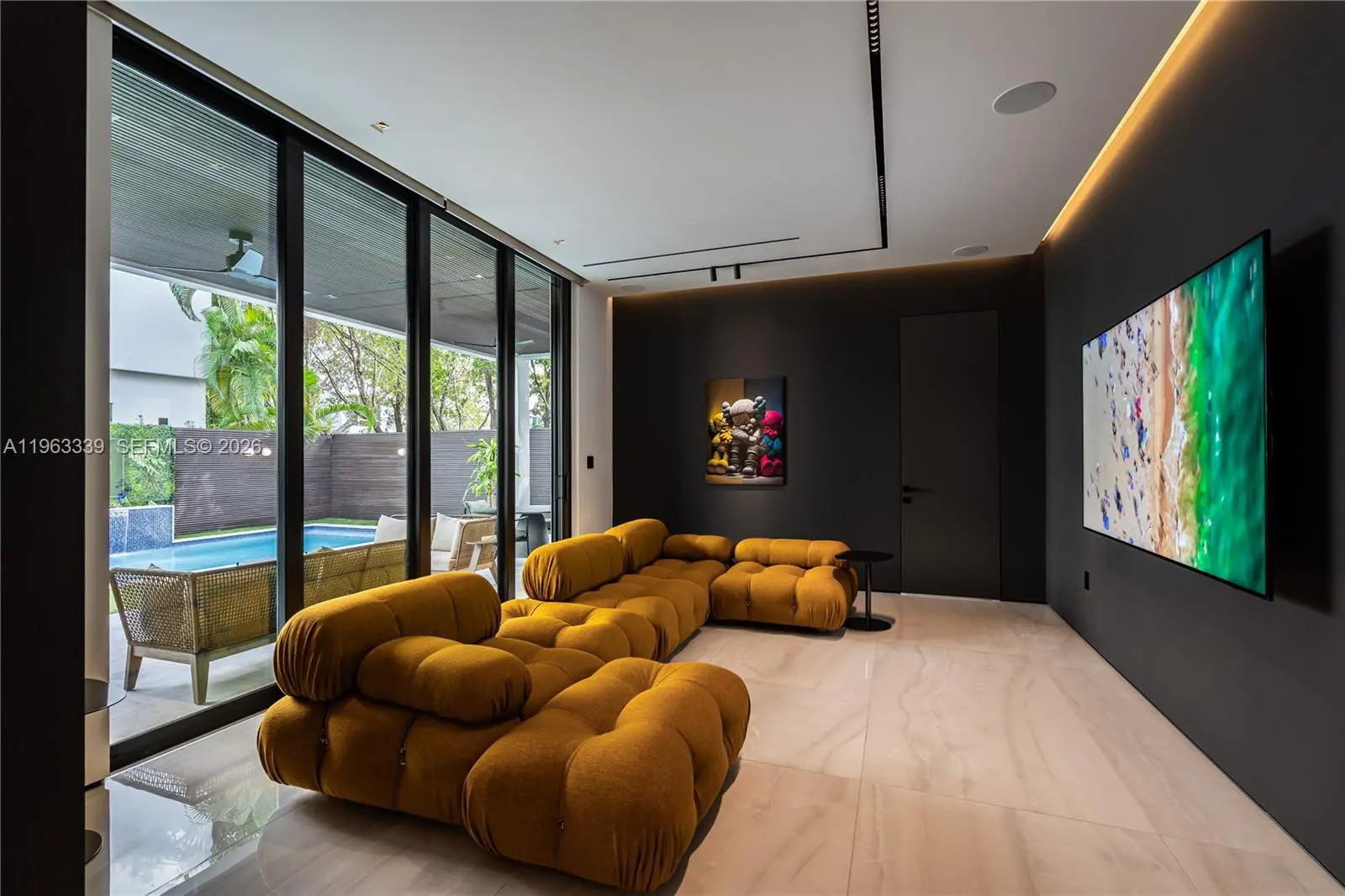 This minimalist contemporary luxury home is a masterfully designed residence curated with uncompromising attention to detail, delivering a true high-end living experience. The home features a full WAC architectural track lighting system throughout, complemented by recessed linear LEDs, ambient cove lighting, and a dramatic Flos AIM statement fixture accentuating the double-height living space. A fully integrated Smart Home system with Lutron Shades and Control4 allows seamless control of lighting, climate, and ambiance, while a whole-home speaker system provides integrated audio throughout. Interiors showcasing sculptural contemporary pieces and anchored by a striking Lexington central shelving unit by Poliform, conceived as a gallery-style architectural focal point. The residence is finished with large-format marble-design flooring and flawless Level 5 smooth wall finishes, reflecting a museum-quality execution. Custom sheer and blackout drapery systems provide refined light control and privacy throughout. The Italian Poliform kitchen is a true showpiece, featuring sleek European cabinetry, premium integrated appliances, and an oversized full-slab waterfall island—ideal for both entertaining and everyday luxury living. The primary suite offers a boutique-style custom walk-in closet with illuminated shelving. A finished garage adds versatility as a lounge, studio, or private gym. Every element of this home reflects a refined, luxury standard.