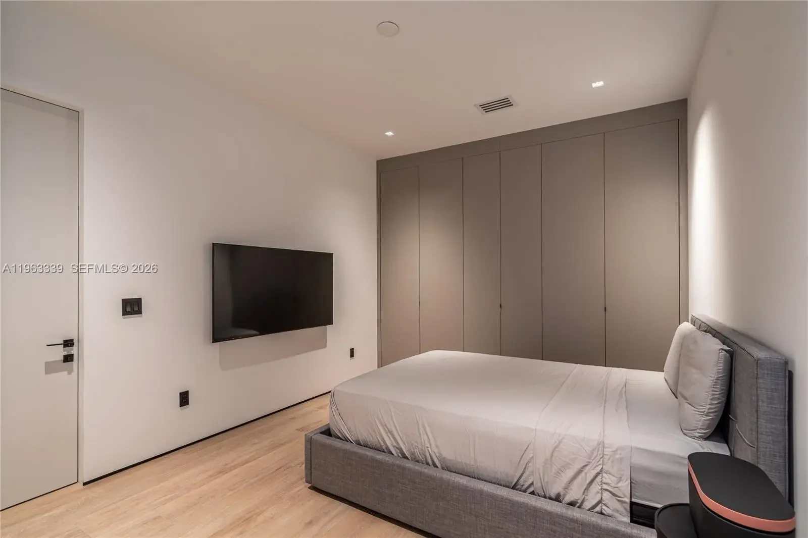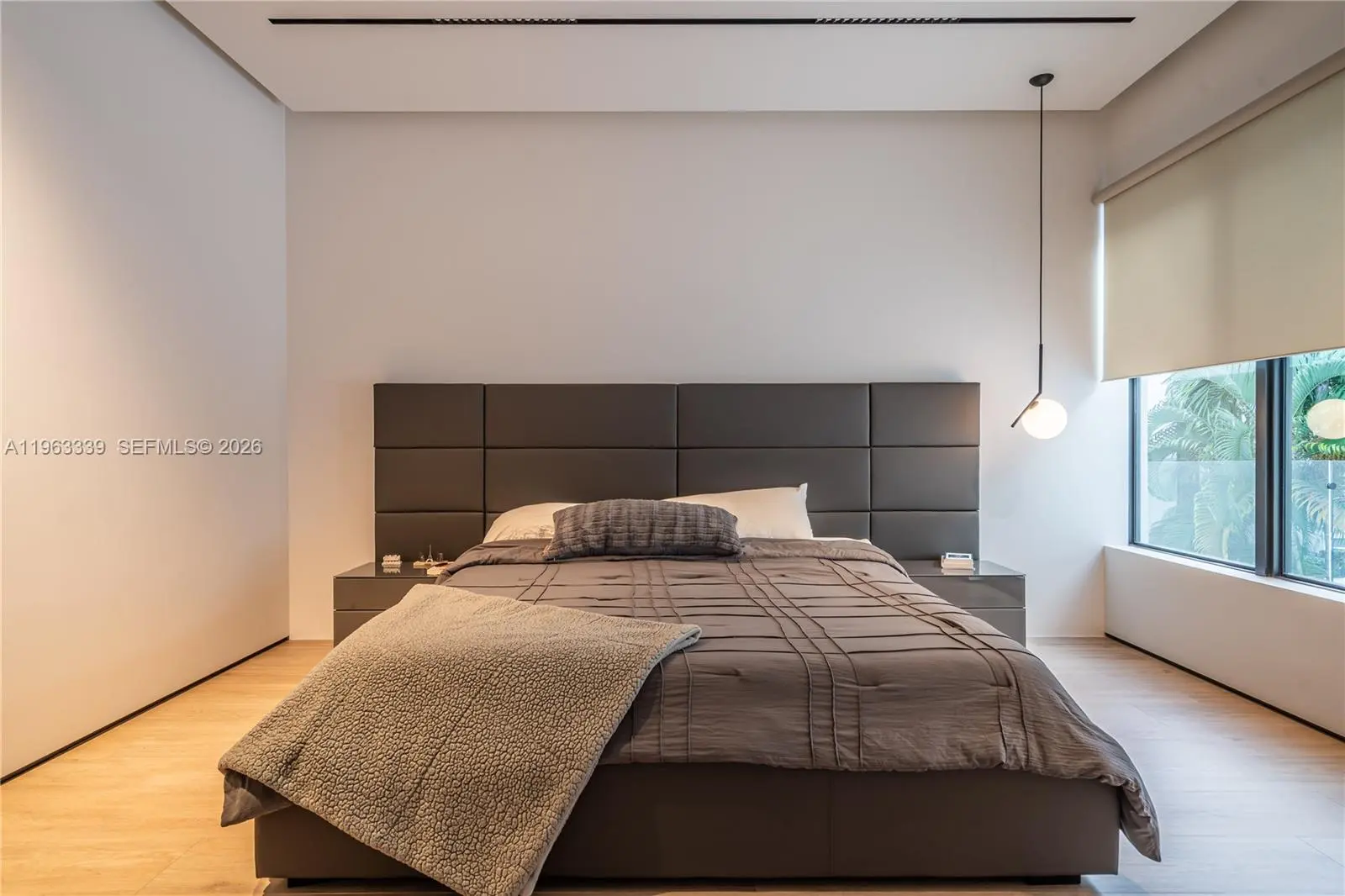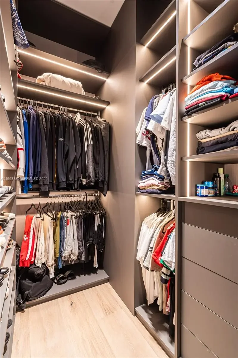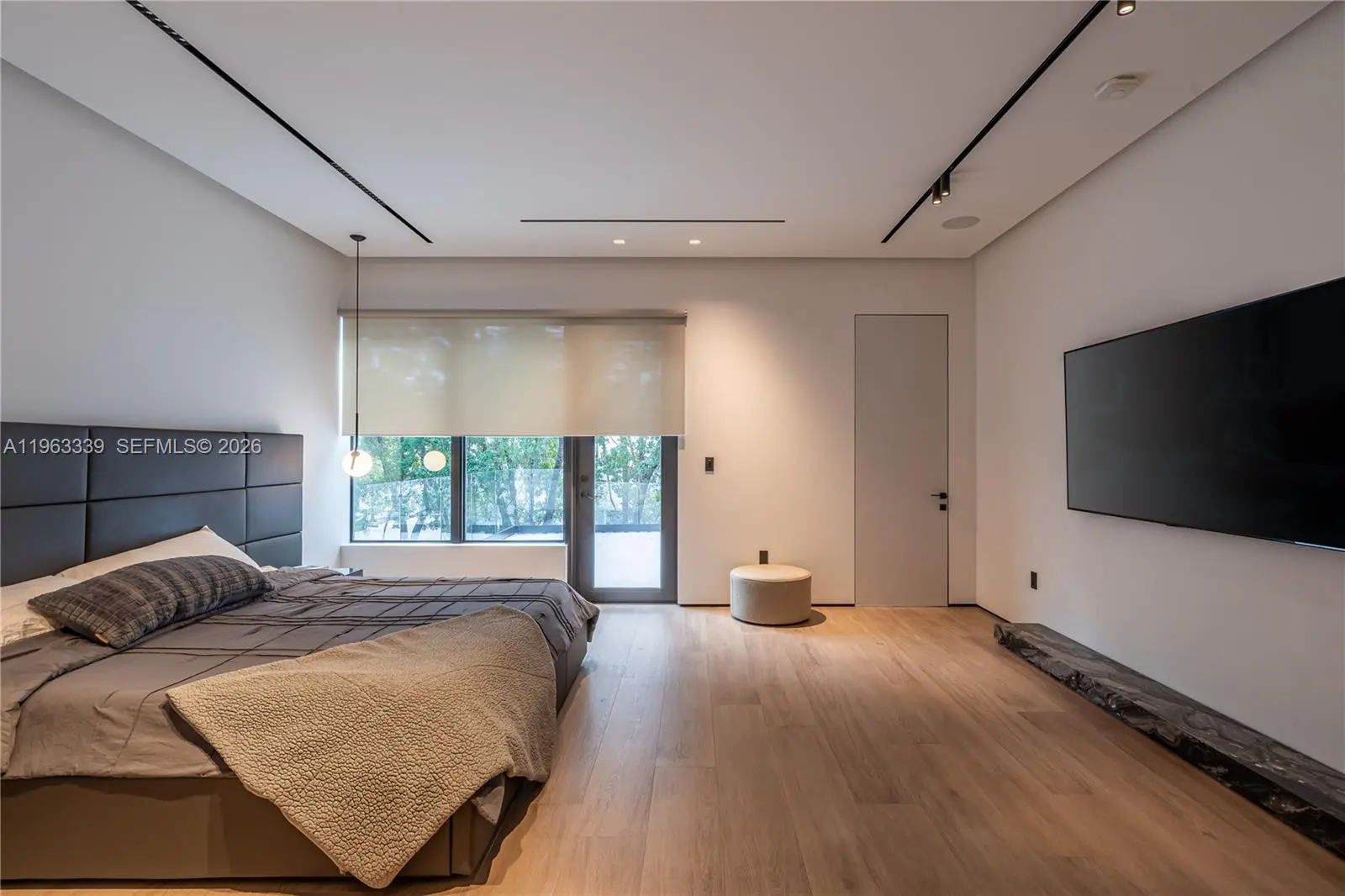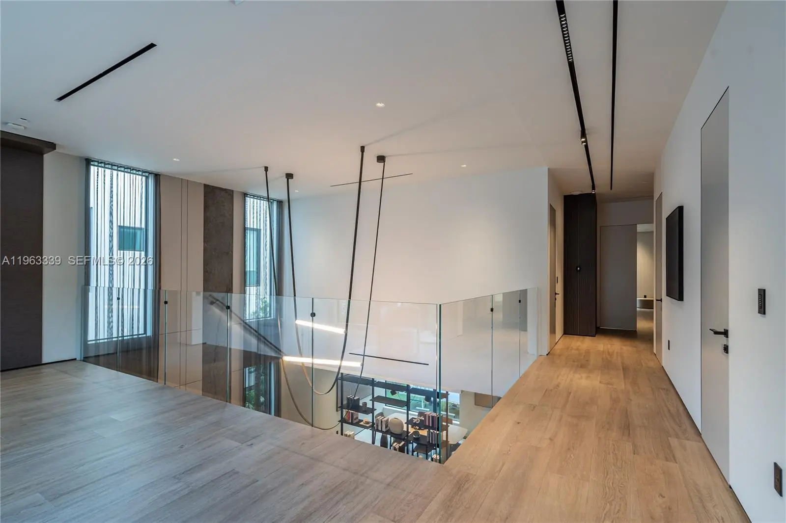 This minimalist contemporary luxury home is a masterfully designed residence curated with uncompromising attention to detail, delivering a true high-end living experience. The home features a full WAC architectural track lighting system throughout, complemented by recessed linear LEDs, ambient cove lighting, and a dramatic Flos AIM statement fixture accentuating the double-height living space. A fully integrated Smart Home system with Lutron Shades and Control4 allows seamless control of lighting, climate, and ambiance, while a whole-home speaker system provides integrated audio throughout. Interiors showcasing sculptural contemporary pieces and anchored by a striking Lexington central shelving unit by Poliform, conceived as a gallery-style architectural focal point. The residence is finished with large-format marble-design flooring and flawless Level 5 smooth wall finishes, reflecting a museum-quality execution. Custom sheer and blackout drapery systems provide refined light control and privacy throughout. The Italian Poliform kitchen is a true showpiece, featuring sleek European cabinetry, premium integrated appliances, and an oversized full-slab waterfall island—ideal for both entertaining and everyday luxury living. The primary suite offers a boutique-style custom walk-in closet with illuminated shelving. A finished garage adds versatility as a lounge, studio, or private gym. Every element of this home reflects a refined, luxury standard.