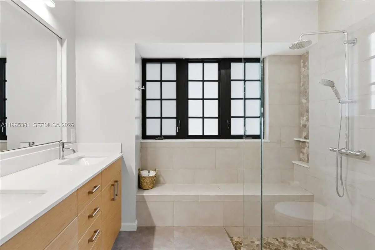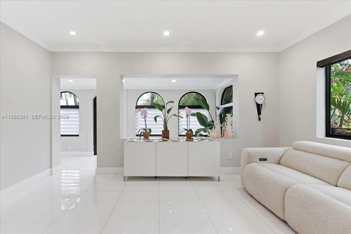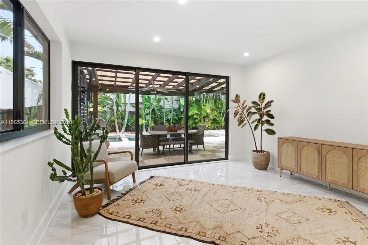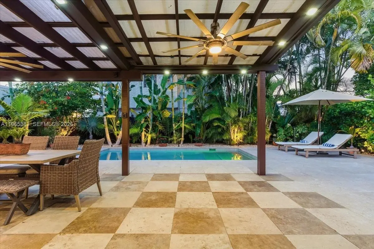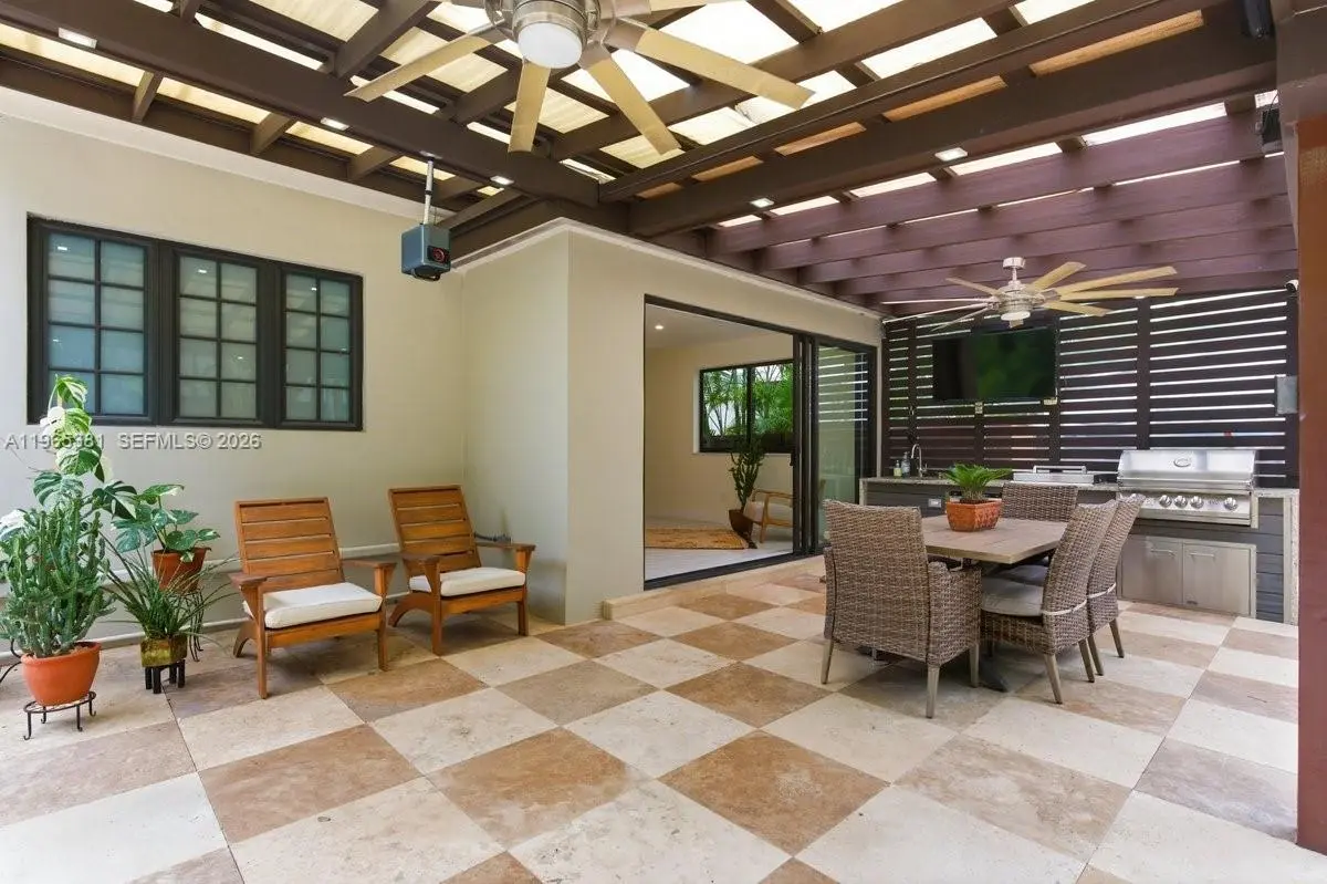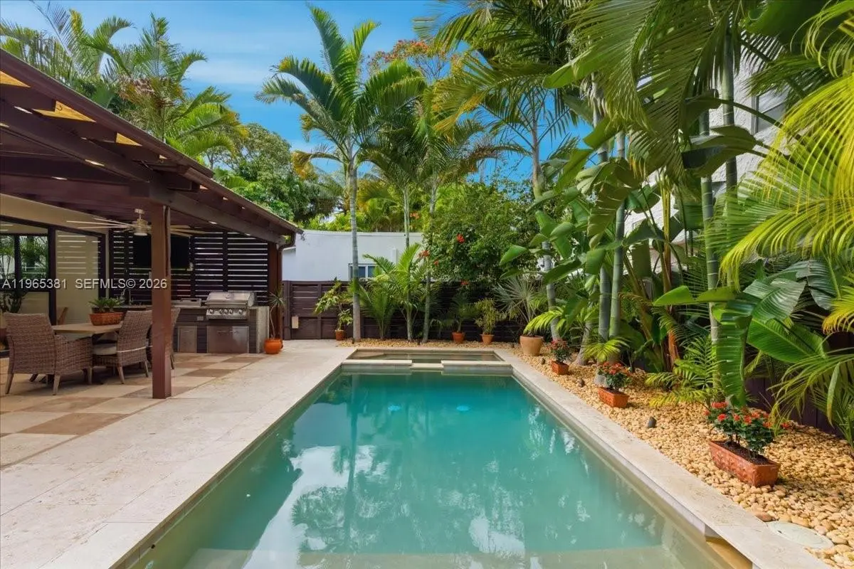 A rare jewel, this exceptional home delivers a true resort-style lifestyle rarely found in Miami. Thoughtfully curated for year-round enjoyment, the entire backyard was reimagined in 2023 into a private retreat featuring a heated saltwater pool with separate spa, with custom aggregate finish, Moroccan tile, refined stonework, lush palm landscaping, and dramatic night lighting. A pergola, summer kitchen, and covered porch create multiple outdoor living and entertaining zones—offering the kind of effortless indoor-outdoor lifestyle typically reserved for luxury resorts. Beyond the setting, the home offers meaningful, high-value improvements that elevate comfort and peace of mind. The property sits on naturally high elevation-no flood zone-with a dedicated drainage system. Inside, ceilings are higher than typical for homes of this era, complemented by a thoughtfully remodeled interior, modern linear slot diffusers air vents, and zoned comfort with supplemental mini-split AC units. Additional upgrades include a 2015 roof, 100% impact windows, impact front door and patio slider, upgraded electrical panel with surge protection, improved plumbing, resealed driveway, reverse-osmosis kitchen water filtration, and a fully automated pool and spa system. Truly this home has been impeccably maintained, cared for and loved. A rare opportunity for buyers seeking a refined, turnkey retreat delivering privacy, quality, and a true Florida resort experience.