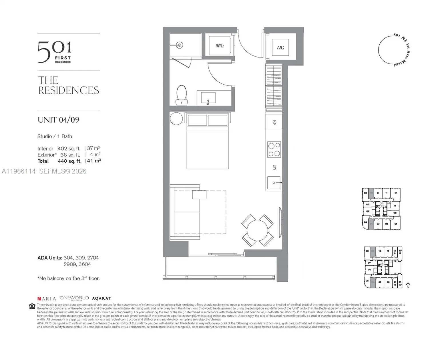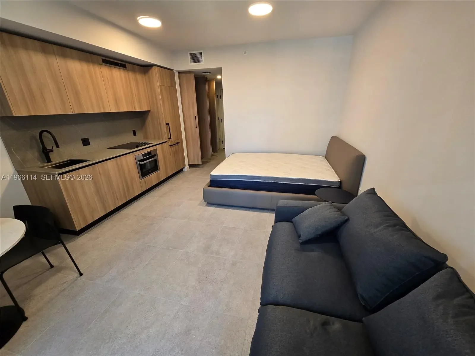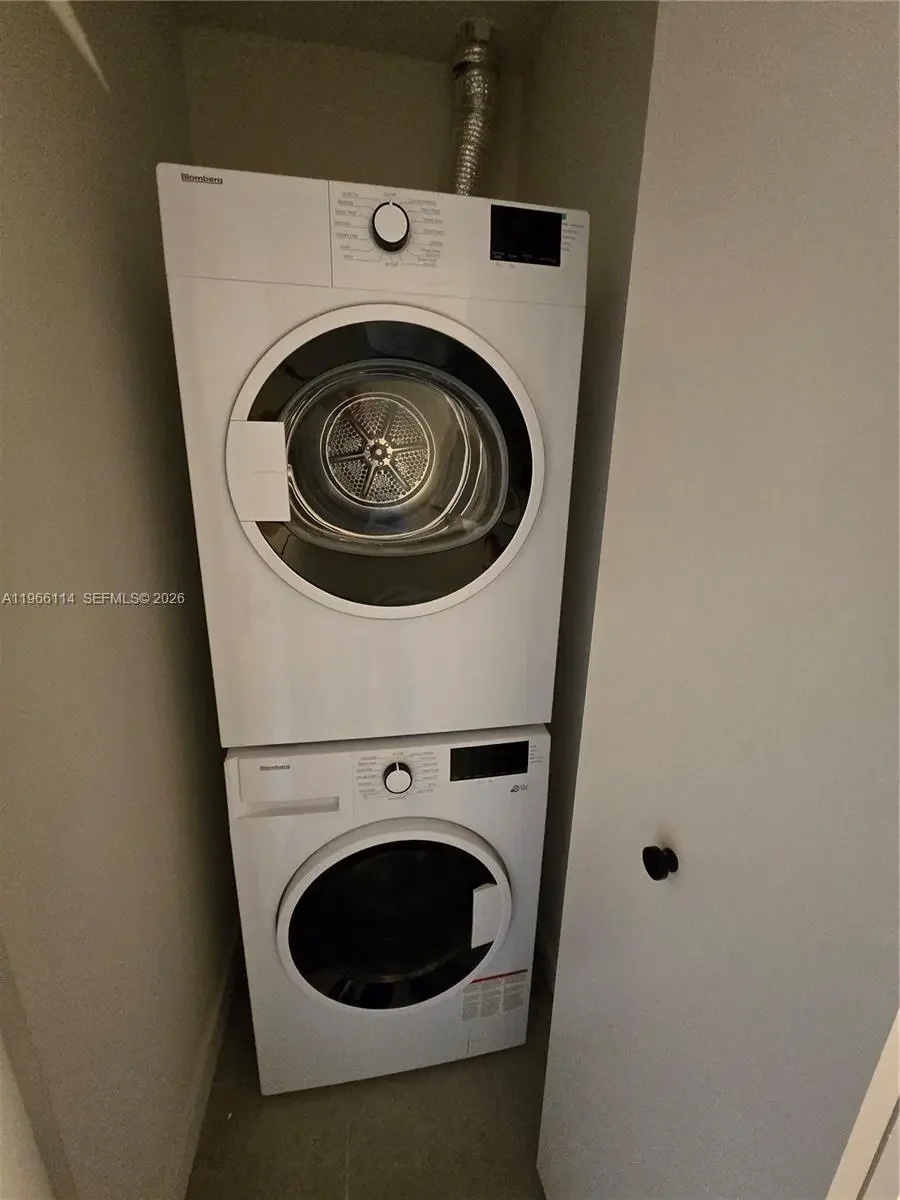 No short term. List price is based on a 1 year contract, minimum must be more than 6 months. Valet-only building - residents with vehicles must contract directly with the valet provider at an additional cost separate from the rent. Be the first to live in this impeccable, fully furnished studio at the newly completed 501 First Residences. This turn-key Unit #709 offers a sophisticated urban living experience with 402 SF of interior space and a private balcony featuring city views. The residence features floor-to-ceiling windows with integrated roller shades, wood-grain flooring, and a modern European-style kitchen. The living area is tastefully appointed with a charcoal grey sofa, white pedestal dining set, and a large smart TV, while the sleeping area offers a plush platform bed and custom built-in wardrobes. Convenience is key with an in-unit stacked washer/dryer and a spa-inspired bathroom with a rain shower and stone-style tiling. Residents enjoy over 20,000 SF of resort-style amenities across the top two floors ("Verde"), including a 75-foot lap pool, hot/cold hydrotherapy baths, a rooftop movie theater, and a world-class fitness center by HOMAGE. Additional perks include a co-working lounge, pet spa, valet parking at extra cost to tenant, and a ground-floor bistro. Perfectly located in Downtown Miami, just steps from the Kaseya Center, Miami Worldcenter, and the Brightline. Association requires common area deposit equal to one month's rent.