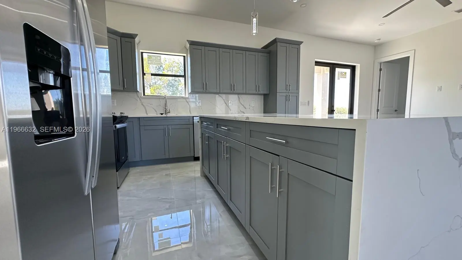 BRAND NEW CONSTRUCTION ON A CANAL LOT New 3 Bedroom/2 Bathroom/Den and 2 Car Garage 0.34 Acre Lot In Lehigh Acres. The kitchen features quartz countertops, soft-close shaker cabinets, and stainless-steel appliances, including a refrigerator, range, dishwasher, and microwave. Designed with convenience and comfort in mind, the home includes impact-resistant doors and windows, ceiling fans in every room, a full size laundry room, master suite boasts dual sinks and a walk-in shower. A two-car attached garage and room for a pool add to the property’s appeal. Also have gutters around all the house and irrigation system. . Epoxy Coating In The Garage And On The Open Lania. No HOA and CDD