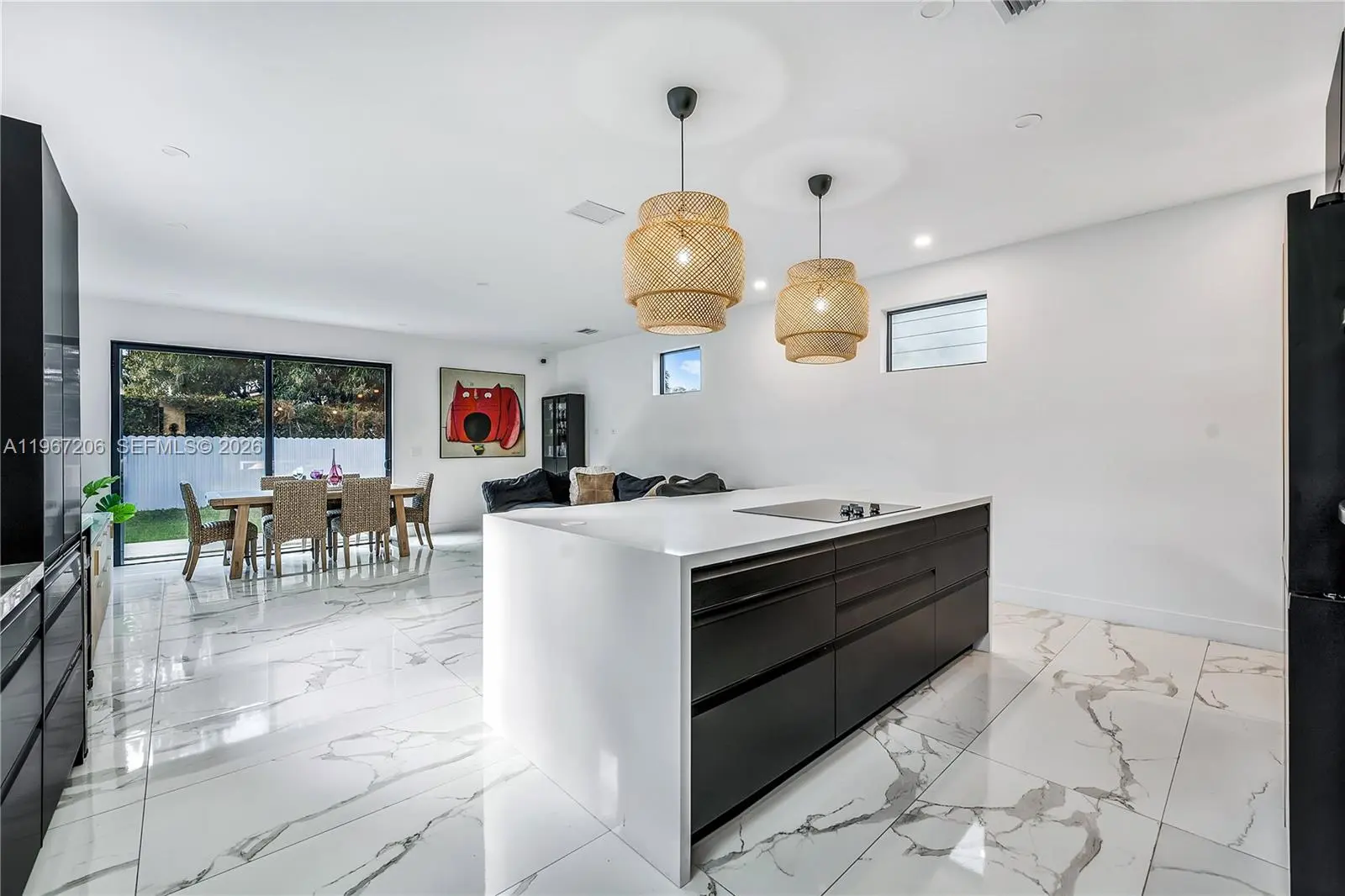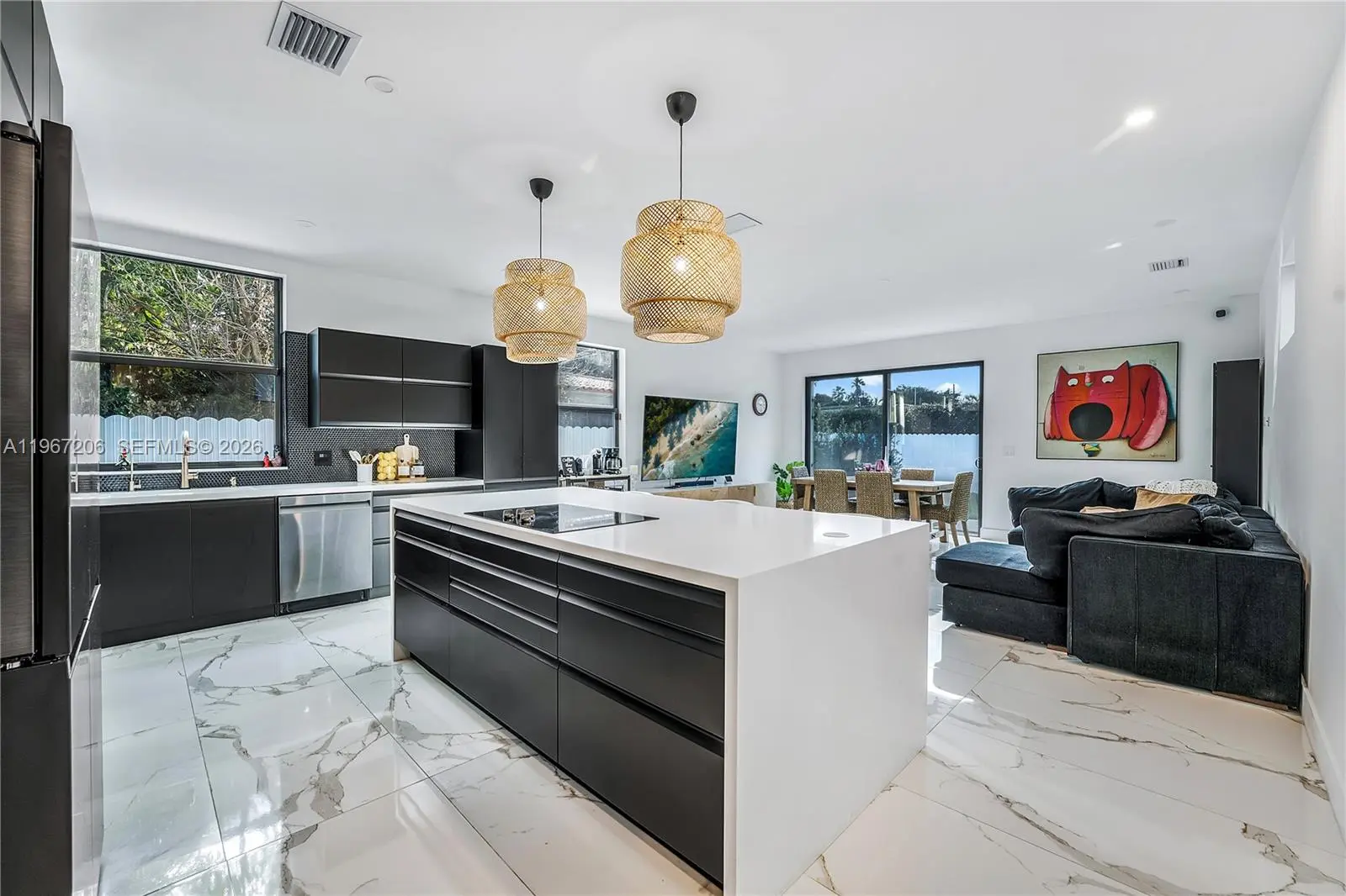 Contemporary residence built in 2022 offering a functional and elegant layout with 4 bedrooms, 4.5 bathrooms and 2,594 SF of living area. The home features an open-concept design with large porcelain tile flooring, impact windows, and modern finishes throughout. The kitchen is equipped with custom cabinetry, black stainless-steel appliances, and an oversized island, ideal for entertaining. Additional features include built-in closets, electric gate, sprinkler system, and a private patio. One bedroom with full bath is located on the ground floor with exterior access. Ideally positioned near Brickell, Coral Gables, Coconut Grove, and Miami International Airport, this home offers easy access to the city’s top dining, business districts, and lifestyle destinations. A rare opportunity to own a contemporary home that blends location, design, and comfort effortlessly.