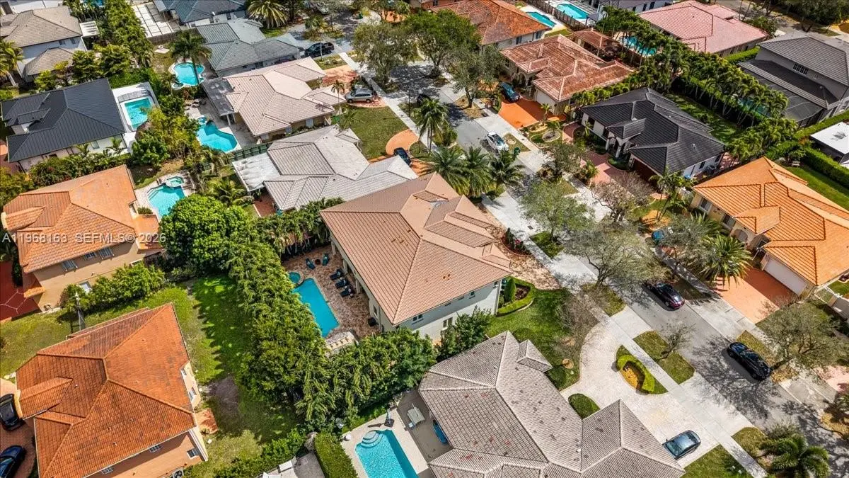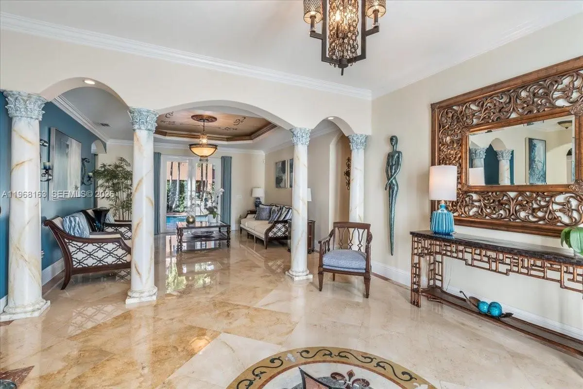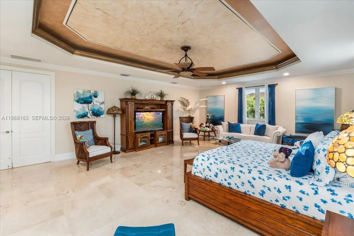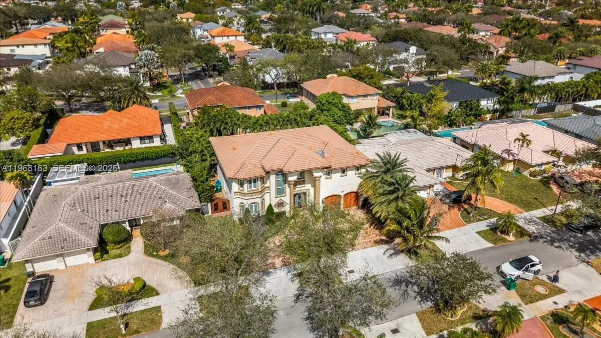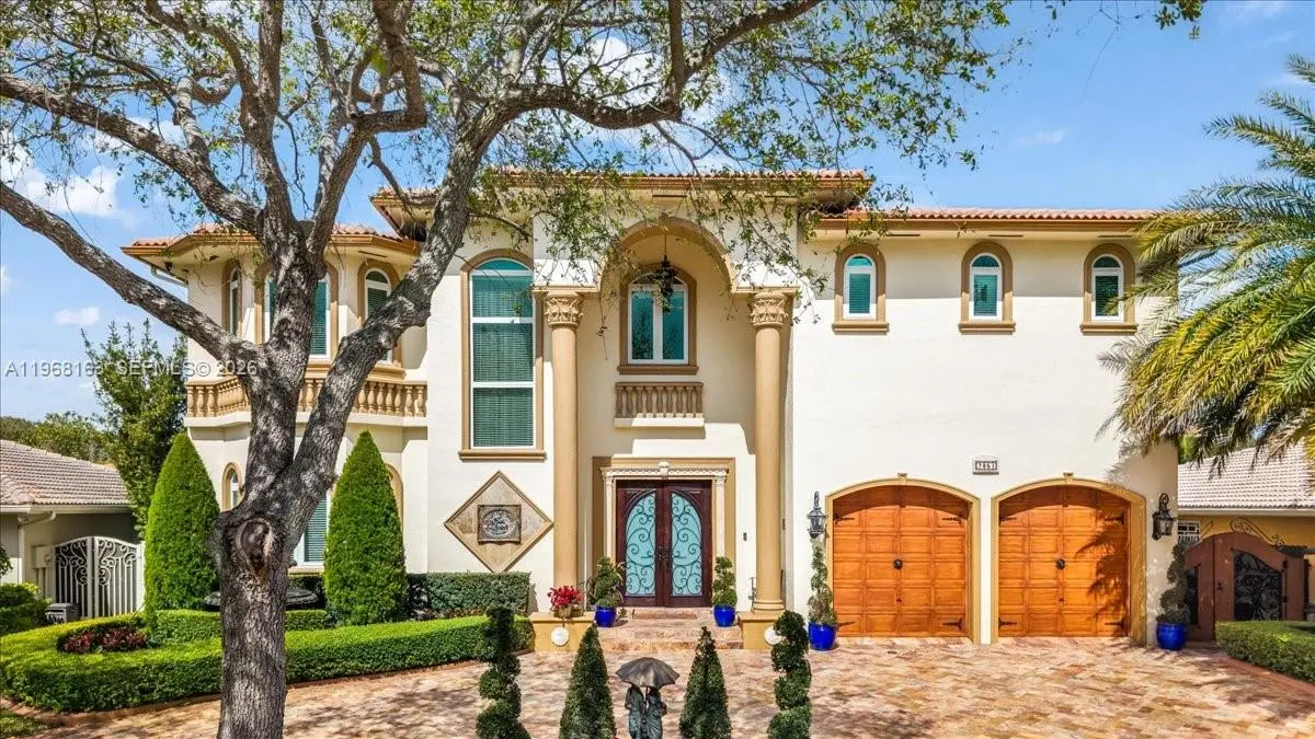 Luxurious estate located within the gated and highly sought-after community of Royal Oaks. This Mediterranean-inspired home offers approximately 4,256 square feet of thoughtfully designed living space, featuring six bedrooms and five bathrooms. Built entirely of concrete, including the second floor, the residence provides exceptional durability and long-term value. A marble entry with a custom medallion leads into spacious interiors with high ceilings, classic architectural details, and marble flooring throughout, creating a bright and elegant atmosphere. The functional layout includes three guest bedrooms with private en-suite baths and an expansive primary suite of over 900 square feet, complete with a spa-style bathroom and Jacuzzi soaking tub. High-impact windows and doors enhance security and energy efficiency. A second-floor kitchenette with washer and dryer is ideal for extended family or guests, and an oversized two-car garage with marble flooring completes the home’s interior. The backyard oasis is equally impressive, featuring a marble deck, large covered terrace, refreshing pool area, outdoor kitchen, and a tiki hut—perfect for entertaining or relaxing in privacy.