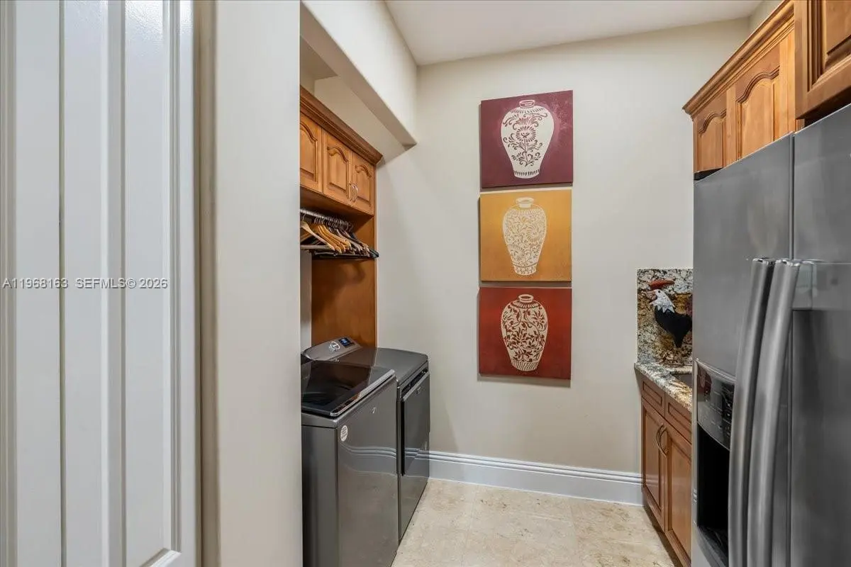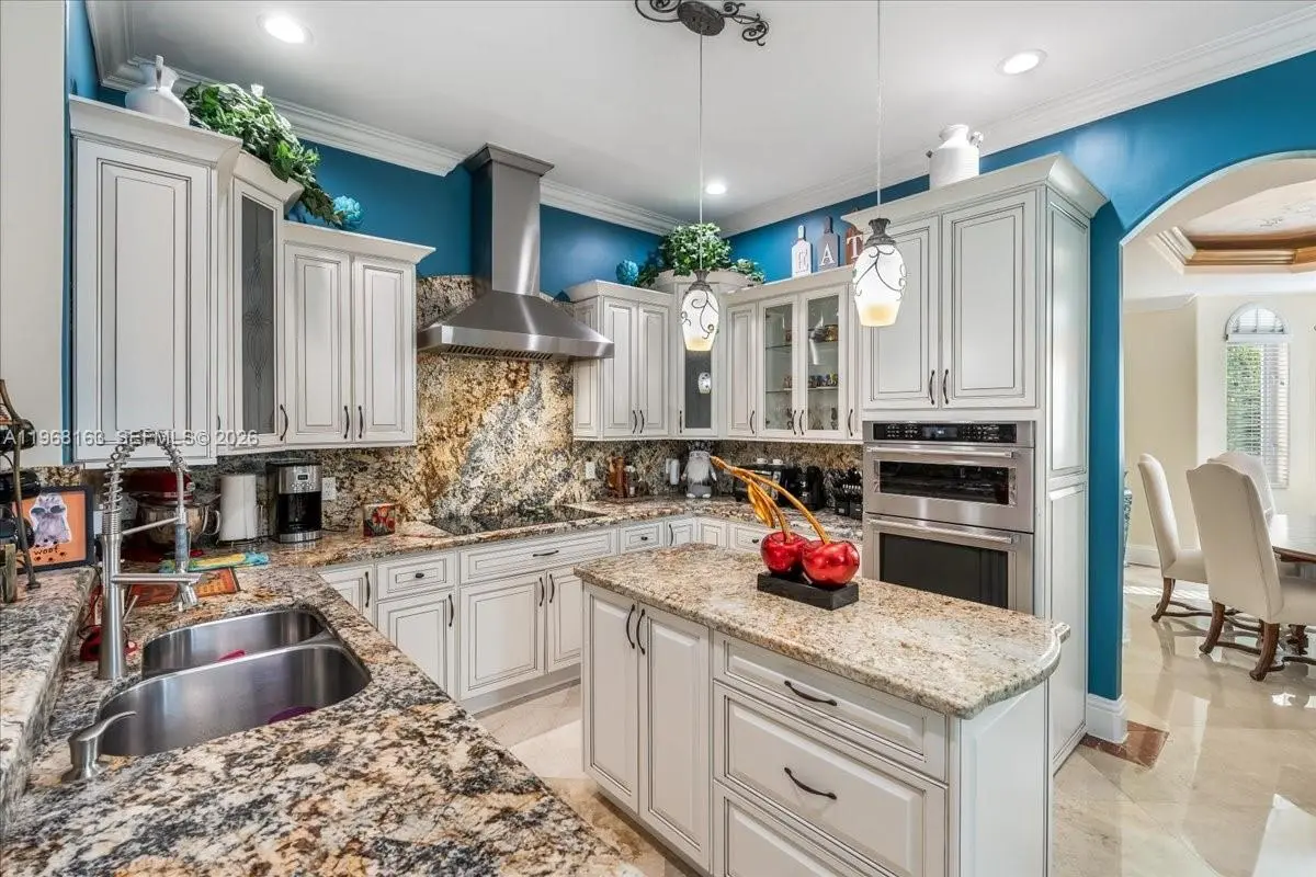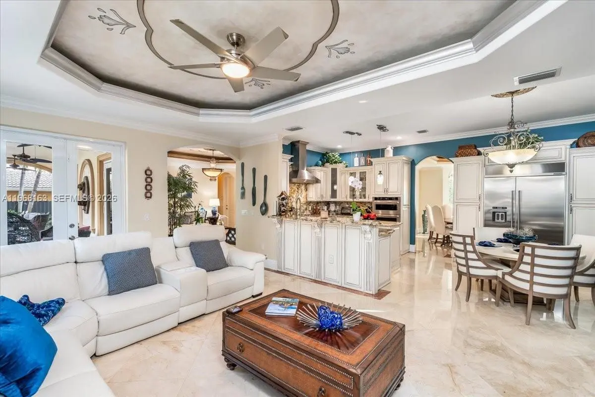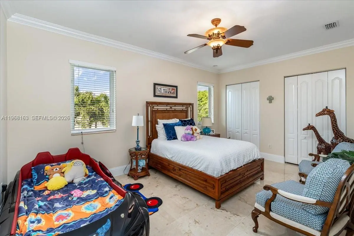 Luxurious estate located within the gated and highly sought-after community of Royal Oaks. This Mediterranean-inspired home offers approximately 4,256 square feet of thoughtfully designed living space, featuring six bedrooms and five bathrooms. Built entirely of concrete, including the second floor, the residence provides exceptional durability and long-term value. A marble entry with a custom medallion leads into spacious interiors with high ceilings, classic architectural details, and marble flooring throughout, creating a bright and elegant atmosphere. The functional layout includes three guest bedrooms with private en-suite baths and an expansive primary suite of over 900 square feet, complete with a spa-style bathroom and Jacuzzi soaking tub. High-impact windows and doors enhance security and energy efficiency. A second-floor kitchenette with washer and dryer is ideal for extended family or guests, and an oversized two-car garage with marble flooring completes the home’s interior. The backyard oasis is equally impressive, featuring a marble deck, large covered terrace, refreshing pool area, outdoor kitchen, and a tiki hut—perfect for entertaining or relaxing in privacy.