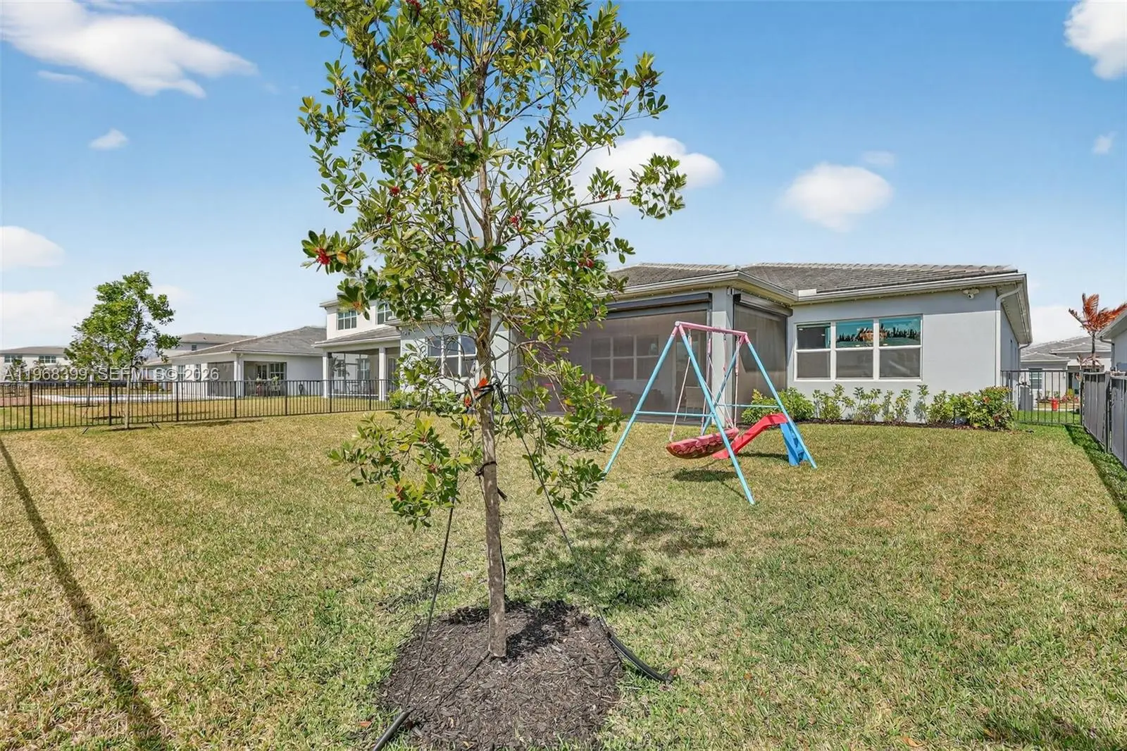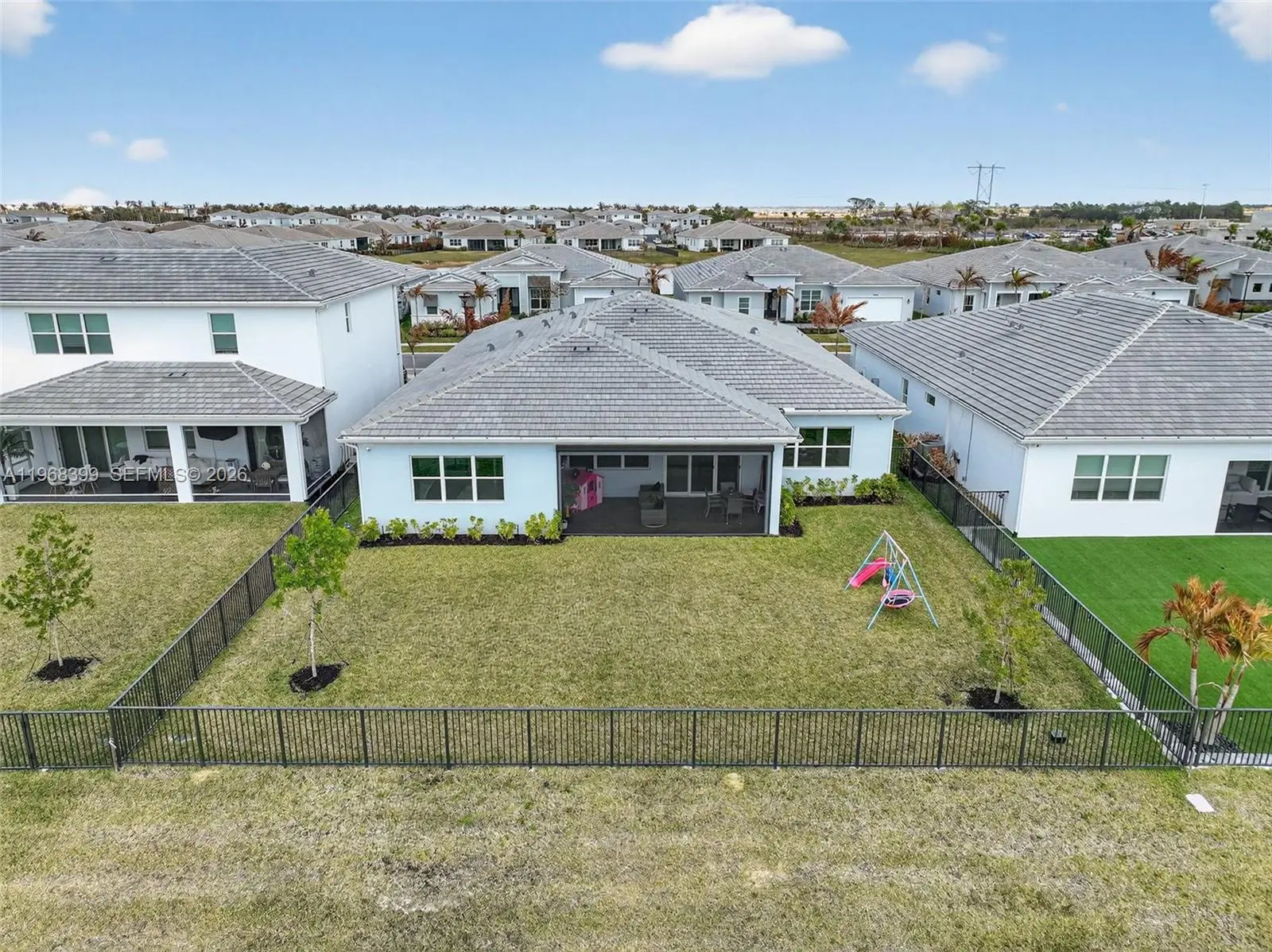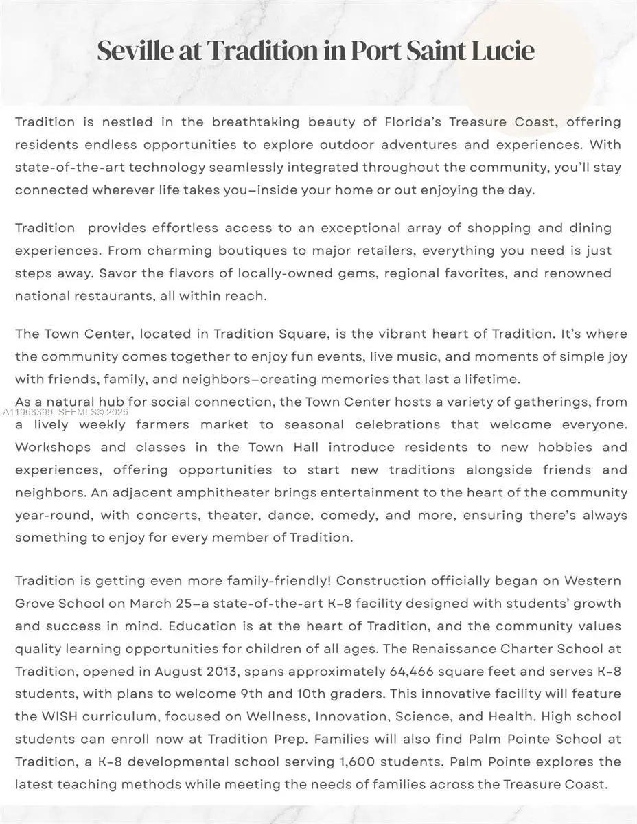 Experience refined lakefront living in Seville at Tradition by Mattamy Homes. This 2024 Noble model offers serene lake views and sophisticated indoor-outdoor living. Soaring ceilings, designer lighting, and open-concept living spaces create an elegant yet comfortable atmosphere. The gourmet kitchen flows seamlessly into the dining and living areas, all overlooking the water. Upgrades include built-in blinds, electric shades, surround sound in the office and main living areas, and a whole-home water softener system. The primary suite features mood lighting, dual vanities, separate closets, private water closet, and a floor-to-ceiling spa-style shower. Enjoy a fenced backyard with electric screened patio and customizable exterior lighting—perfect for entertaining. Residents enjoy resort-style amenities including clubhouse, resort pool, playground, event lawn, cabana area, fitness center, pickleball, basketball, walking trails, dog park, walking and golf cart paths. Most furniture/ golf cart are included. Seville is also located close to a variety of shopping, dining, and entertainment options. Residents will be w/minutes Of the St. Lucie West Town Center, the Tradition Town Center, the PGA Village. 10,000-sf clubhouse will provide the state-of-the-art fitness center, cycling studio, and social areas. Rest and relax in the 7,000-sf resort-style pool with beach entry & whirlpool spa with cabana seating. A great place to call home!