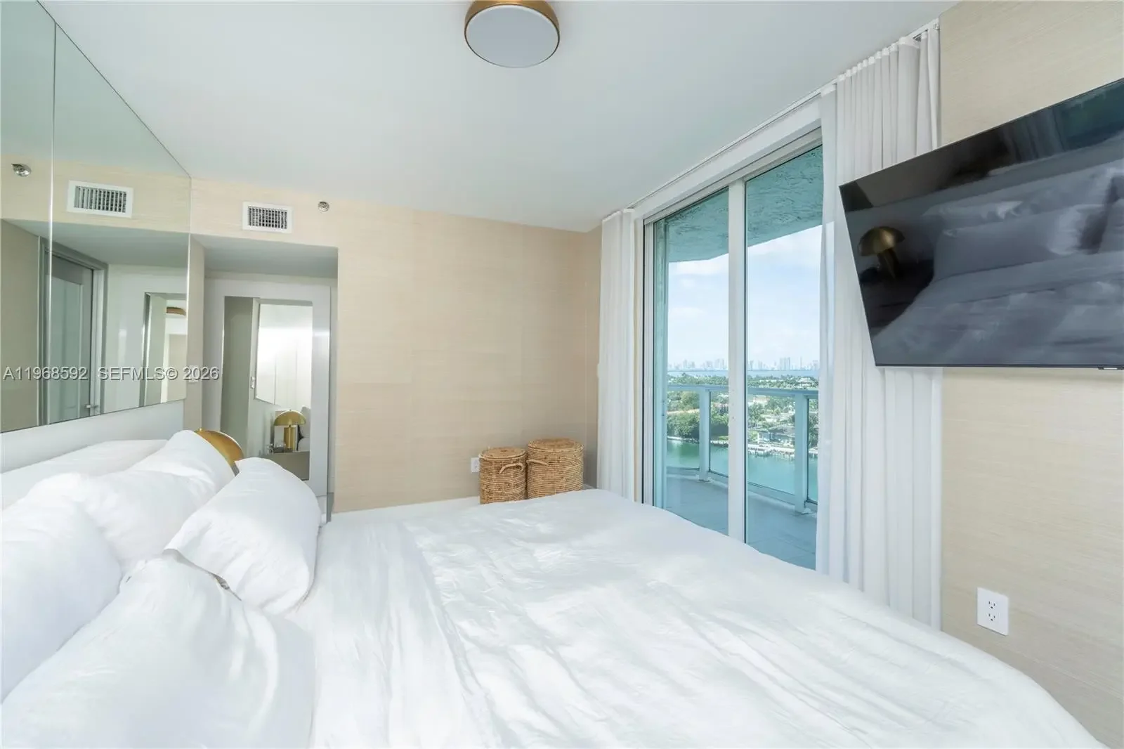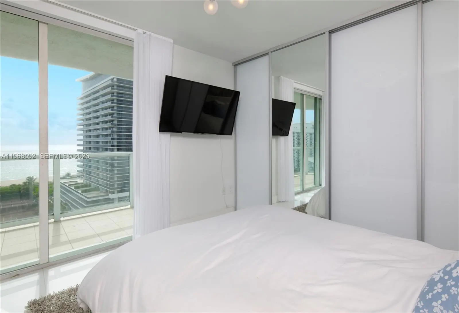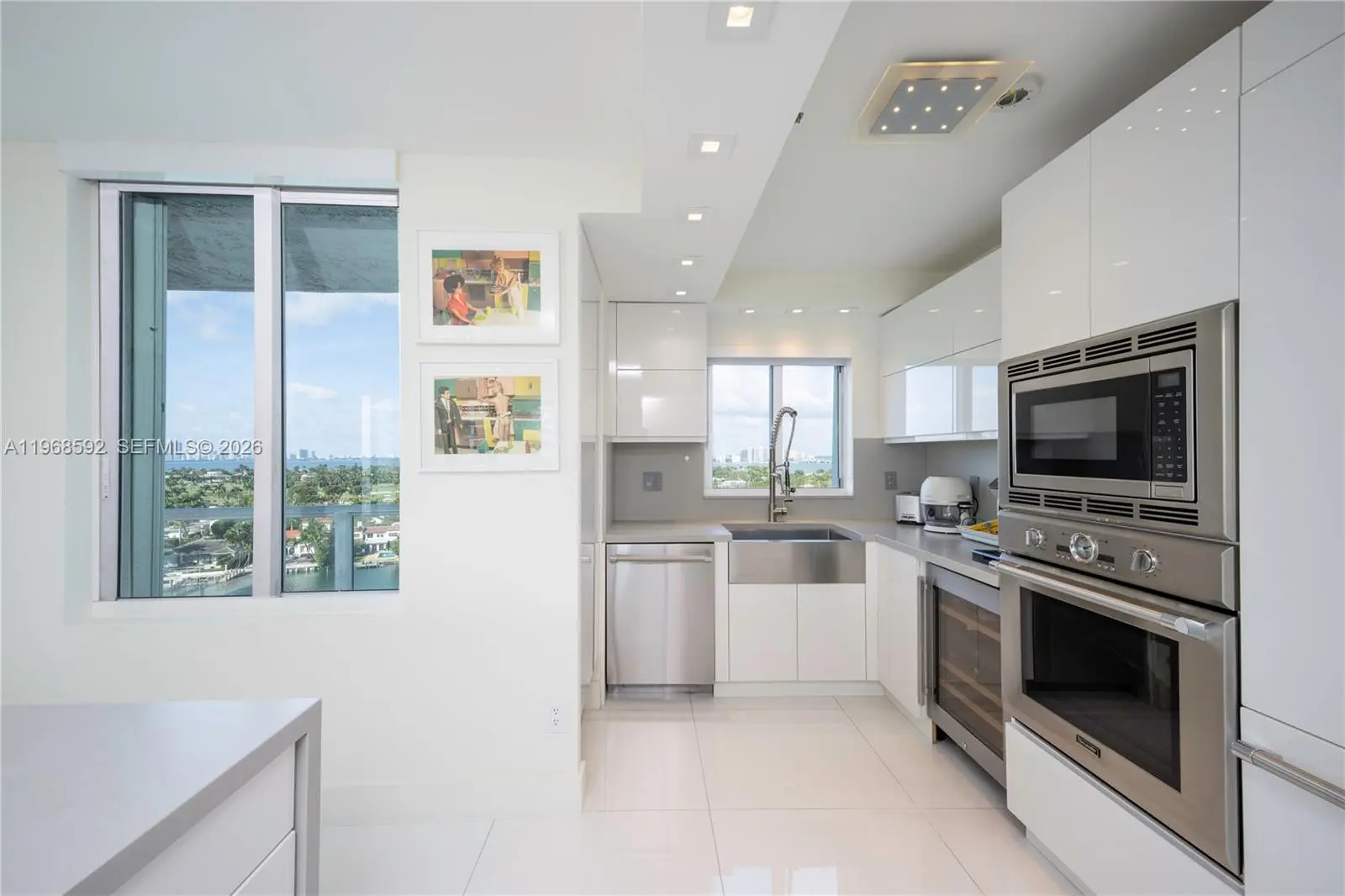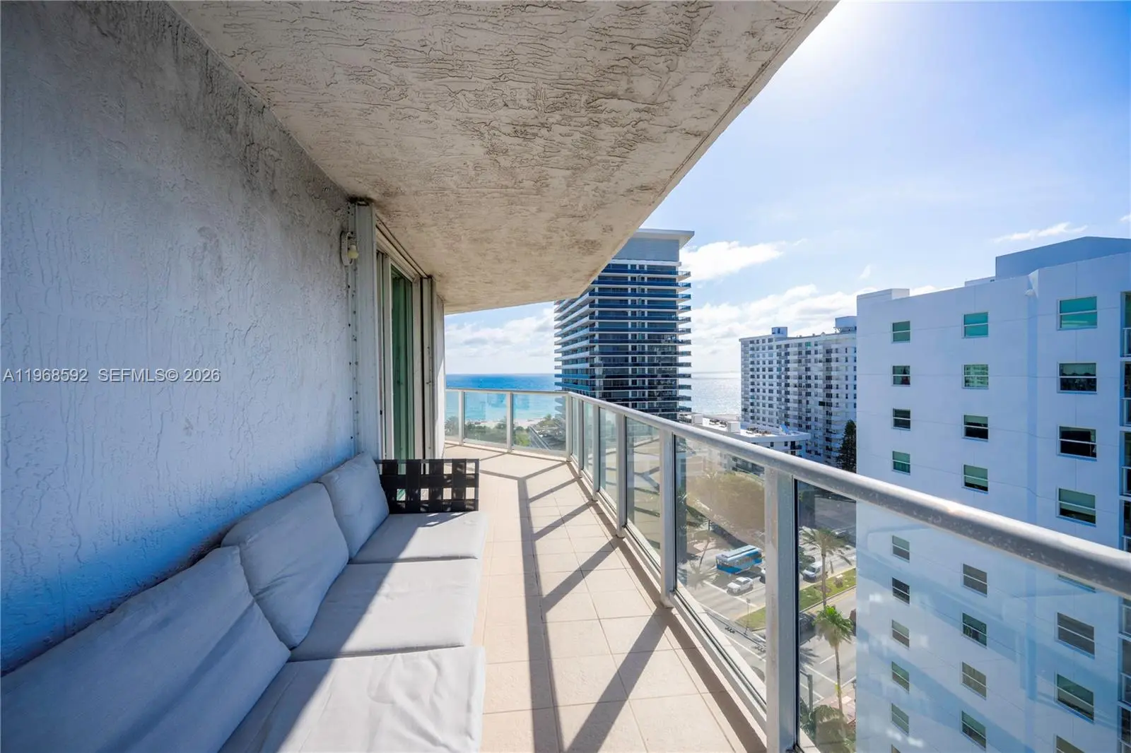 Residence 1401 at 5900 Collins Avenue is a fully reimagined, turnkey corner unit offering a seamless blend of modern design and coastal living. This meticulously remodeled apartment showcases high-end finishes throughout, with an emphasis on clean lines, natural light, and refined materials. The open-concept layout features expansive living and dining areas framed by floor-to-ceiling glass, maximizing breathtaking 180-degree views of the ocean, Intracoastal, and Downtown Miami. Three separate private balconies extend the living space outdoors, providing unobstructed sunrise-to-sunset vistas and an exceptional indoor-outdoor lifestyle. A designer kitchen anchors the space, outfitted with premium Thermador appliances, sleek custom cabinetry, and elegant stone surfaces—ideal for both everyday living and entertaining. Custom aluminum and glass doors are installed throughout the residence, adding a sophisticated architectural element while enhancing light flow between spaces. The bedrooms offer a tranquil retreat with generous proportions and thoughtfully designed storage, while the bathrooms reflect a spa-like aesthetic with upscale fixtures and finishes. Located in a full-service oceanfront building, residents enjoy direct beach access and a prime Mid-Beach location, minutes from Bal Harbour and South Beach. A rare opportunity to own a fully renovated, move-in ready residence with unparalleled panoramic views.