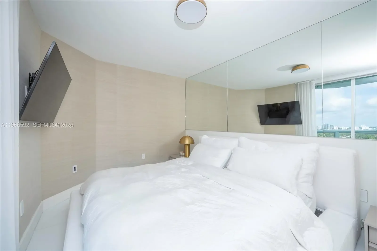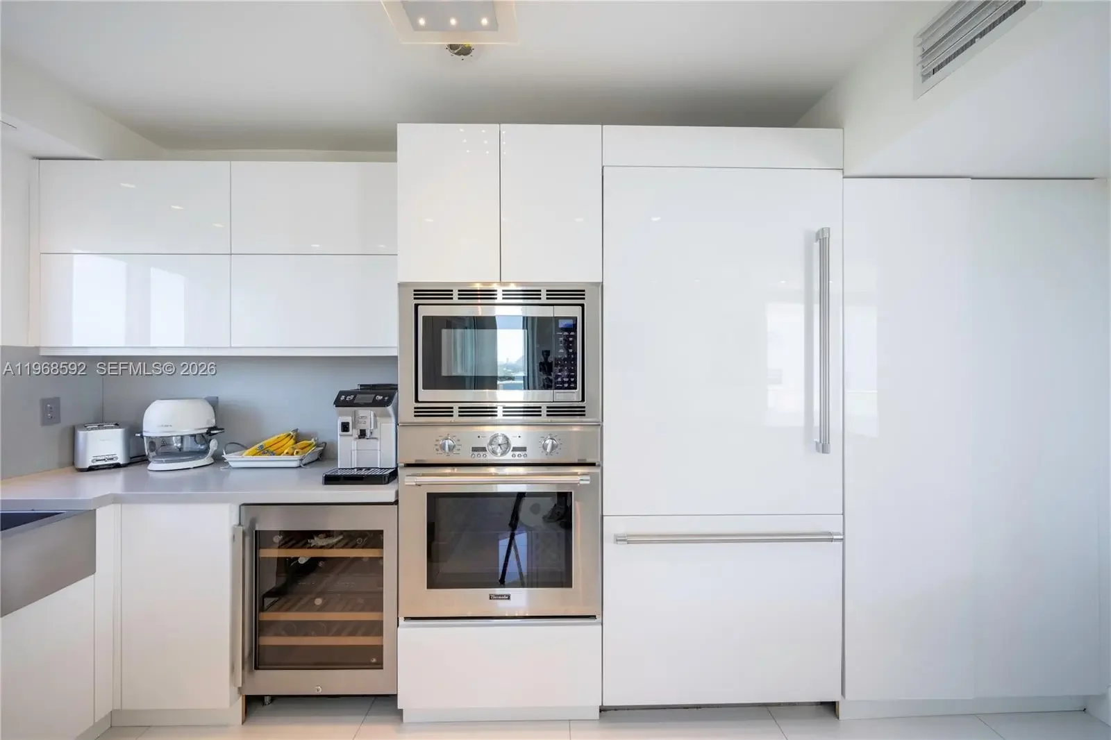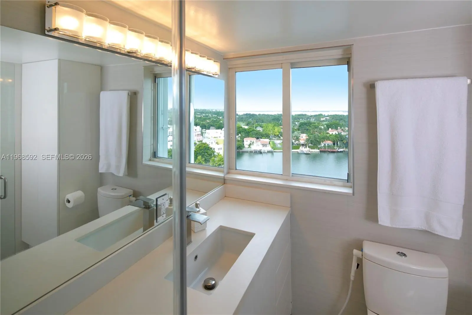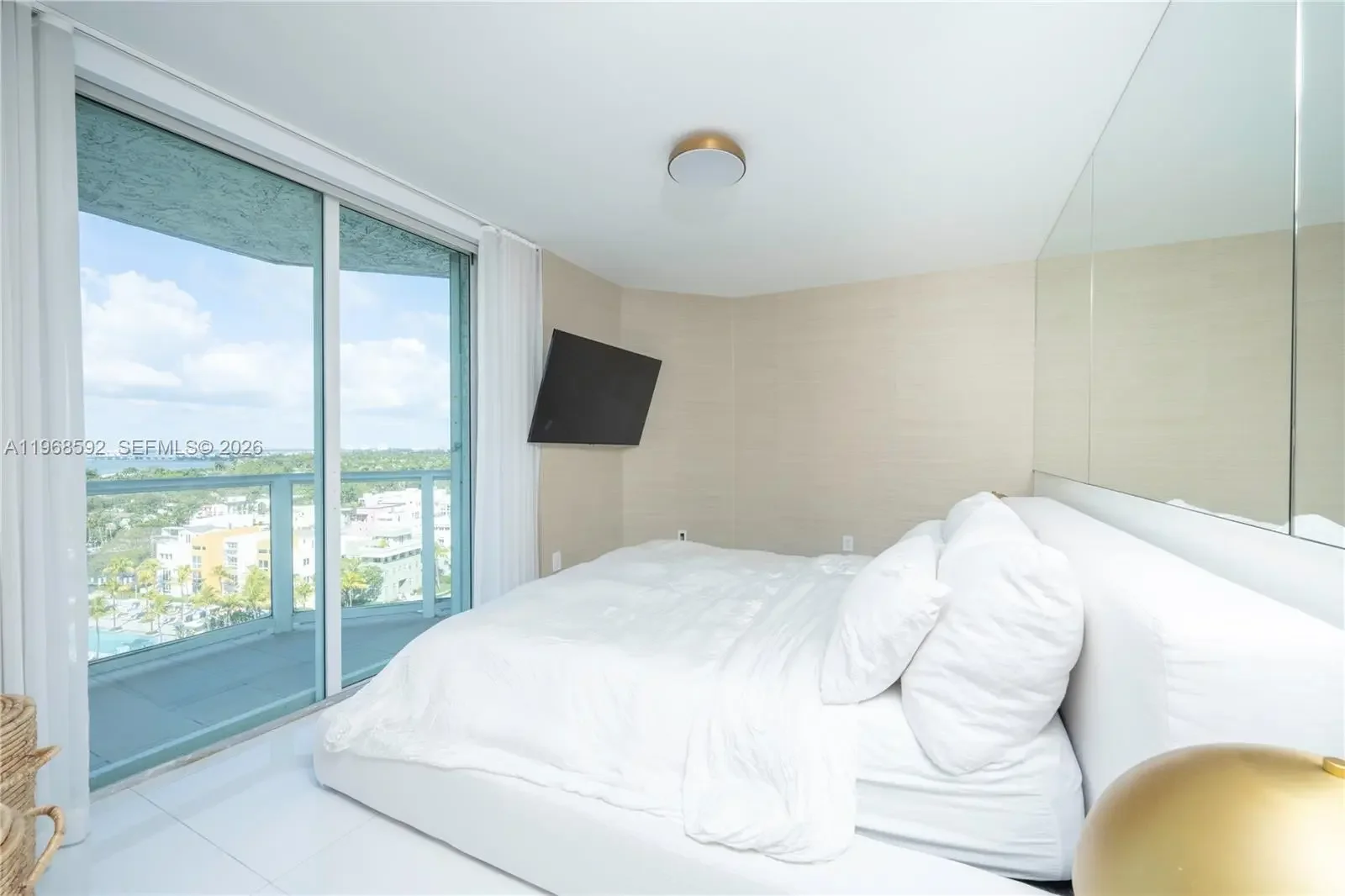 Residence 1401 at 5900 Collins Avenue is a fully reimagined, turnkey corner unit offering a seamless blend of modern design and coastal living. This meticulously remodeled apartment showcases high-end finishes throughout, with an emphasis on clean lines, natural light, and refined materials. The open-concept layout features expansive living and dining areas framed by floor-to-ceiling glass, maximizing breathtaking 180-degree views of the ocean, Intracoastal, and Downtown Miami. Three separate private balconies extend the living space outdoors, providing unobstructed sunrise-to-sunset vistas and an exceptional indoor-outdoor lifestyle. A designer kitchen anchors the space, outfitted with premium Thermador appliances, sleek custom cabinetry, and elegant stone surfaces—ideal for both everyday living and entertaining. Custom aluminum and glass doors are installed throughout the residence, adding a sophisticated architectural element while enhancing light flow between spaces. The bedrooms offer a tranquil retreat with generous proportions and thoughtfully designed storage, while the bathrooms reflect a spa-like aesthetic with upscale fixtures and finishes. Located in a full-service oceanfront building, residents enjoy direct beach access and a prime Mid-Beach location, minutes from Bal Harbour and South Beach. A rare opportunity to own a fully renovated, move-in ready residence with unparalleled panoramic views.
