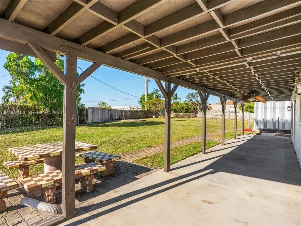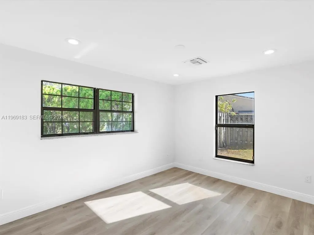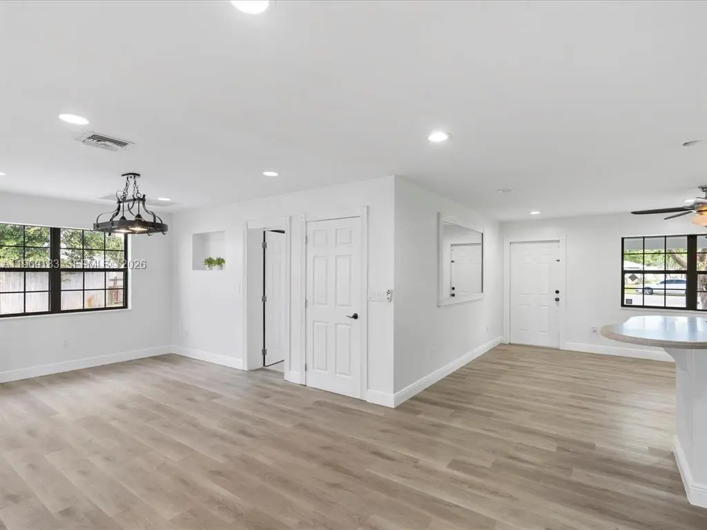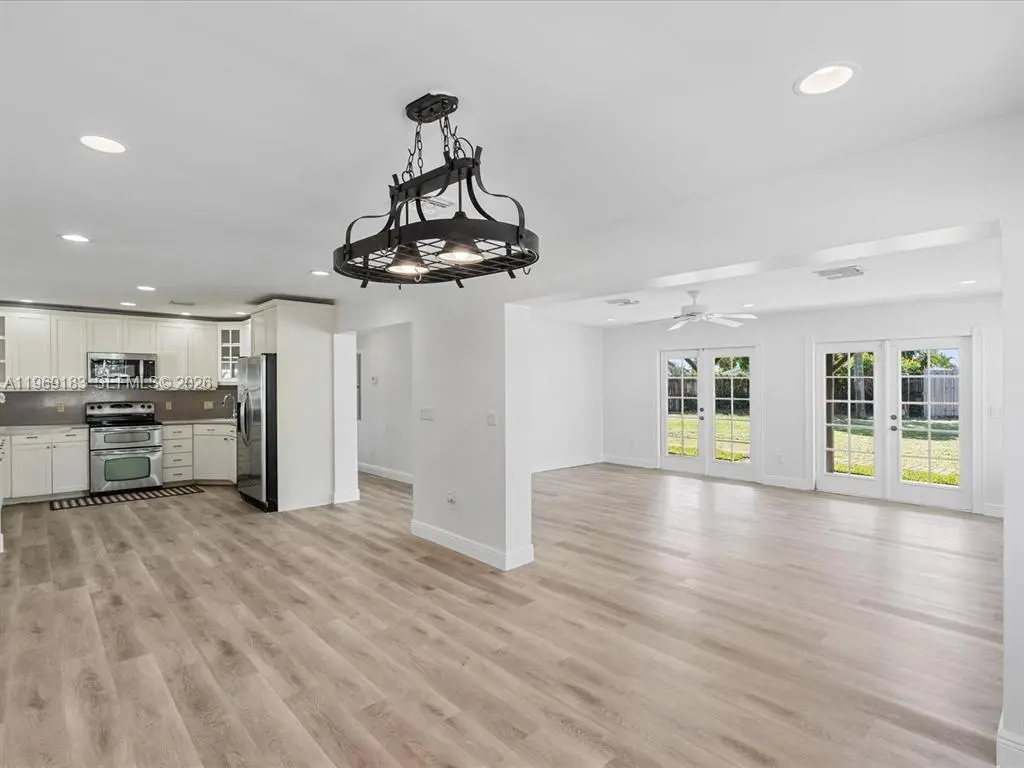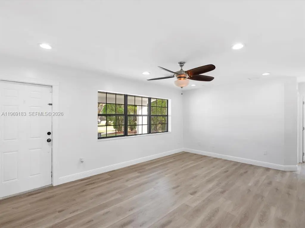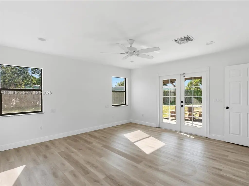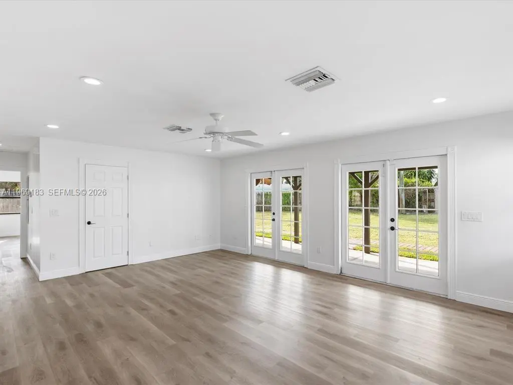 NO HOA and fast approval. LOTS of storage space; HUGE pet friendly backyard! Welcome to this charming 3-bed, 2.5-bath home with an extra room that could be 4th bedroom or recreation. The open floor plan boasts abundant natural light, large living & family rooms, and a spacious kitchen with formal dining—ideal for entertaining. Newly installed wood floors & ceiling fans enhance comfort. Features newer A/C & W/D. French doors open to a large patio & huge fenced yard—perfect for dogs. Includes a giant metal storage shed. Nestled in a quiet cul-de-sac, close to I-95, US1, Deerfield Beach, shopping & dining!