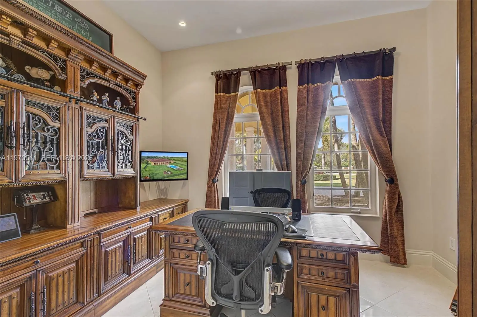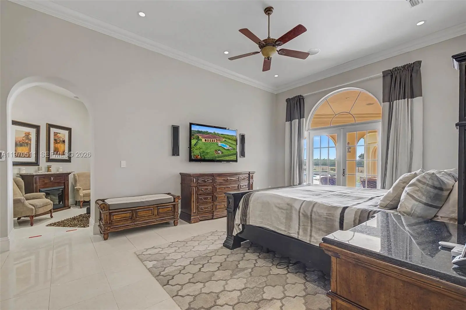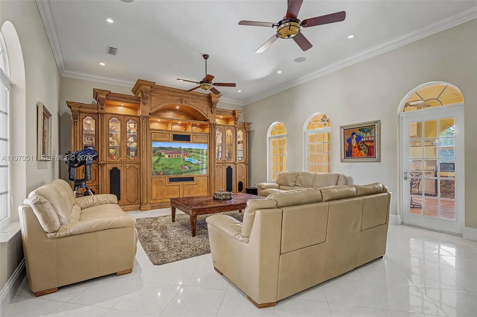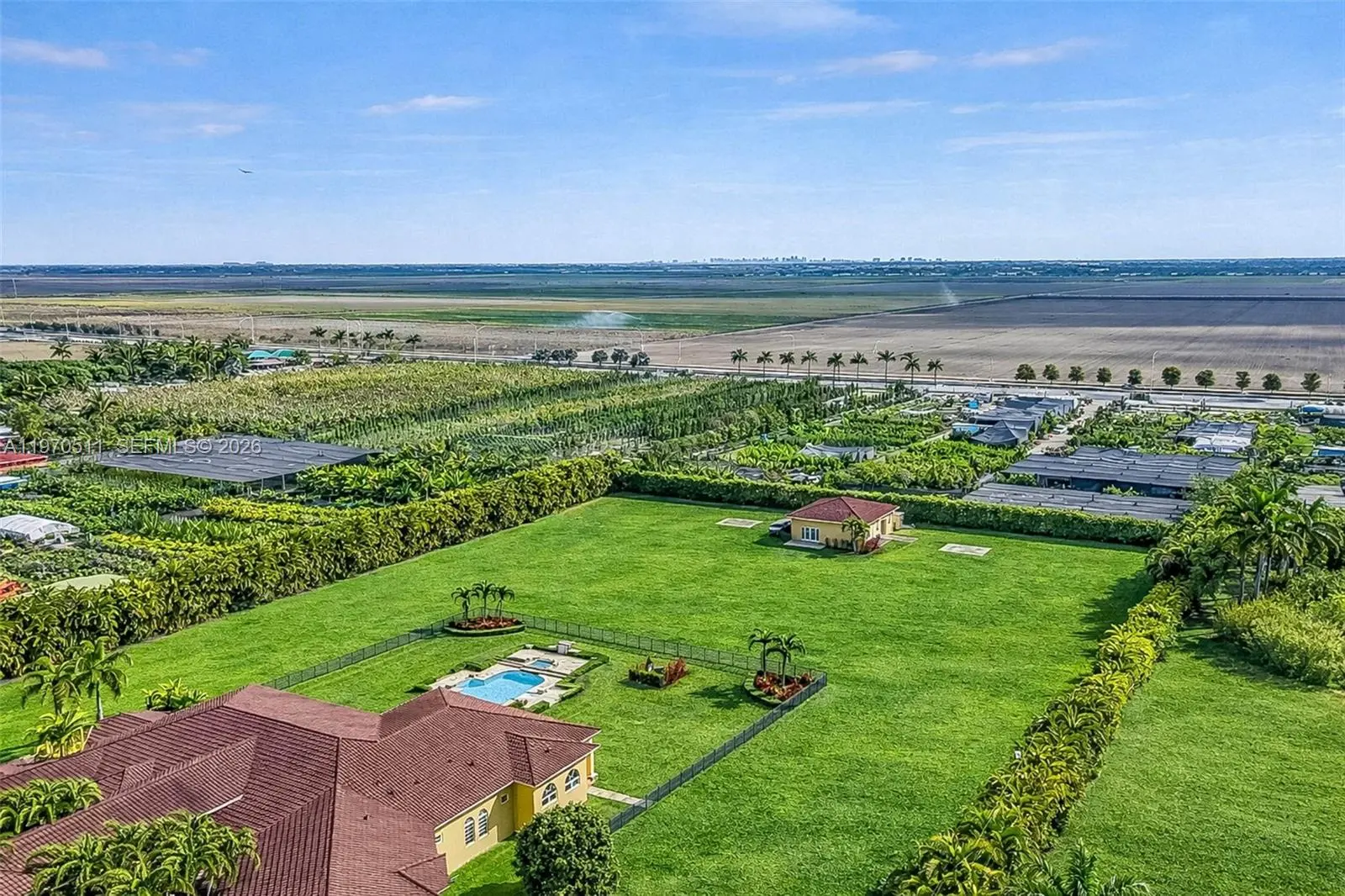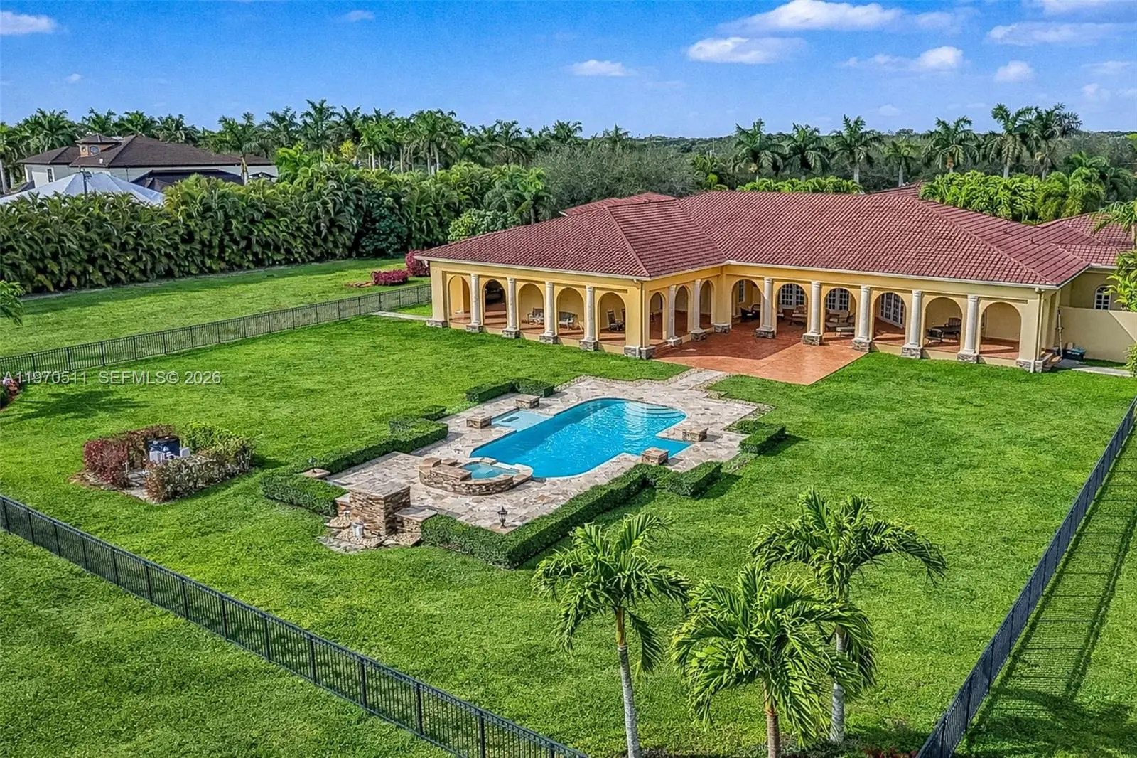 Private double gated estate home set on over 4.8 acres, this exceptional property offers 9,943sqft of living space with a well-designed triple split floor plan. The main residence features 6 bedrooms plus an office including a master and jr. suite, 7.5 baths, chef's kitchen with double subzero refrigerators, double subzero freezers, subzero drink drawers, double miele ovens, built in miele coffee maker, subzero wine refrigerator and expansive island and counter seating. Windows and doors all PGT impact glass. Metal roof on main house and rear structure. Lutron low voltage lighting, Control4 sound system and Cat6 wiring throughout the home. Full home Kohler 45kw generator. Designed for both entertaining and everyday comfort, the home includes a private theater, built-in bar, covered patio with summer kitchen, and a resort-style pool and spa. The expansive primary suite offers dual custom walk-in closets, large shower, and jetted tub. Jr suite boasts dual walk-in custom closets, double vanity bathroom, a shower/tub combo and a separate shower. A true highlight is the oversized four car dream garage with double-height ceilings, plus a detached mini-split AC temperature-controlled building currently used as additional garage space and a custom gym, with a powder room. A rare opportunity combining privacy, scale, and luxury built to the highest standards.