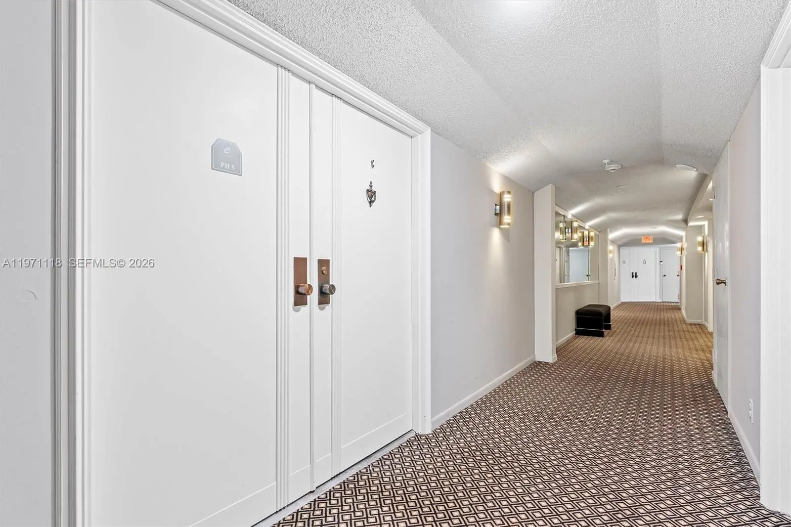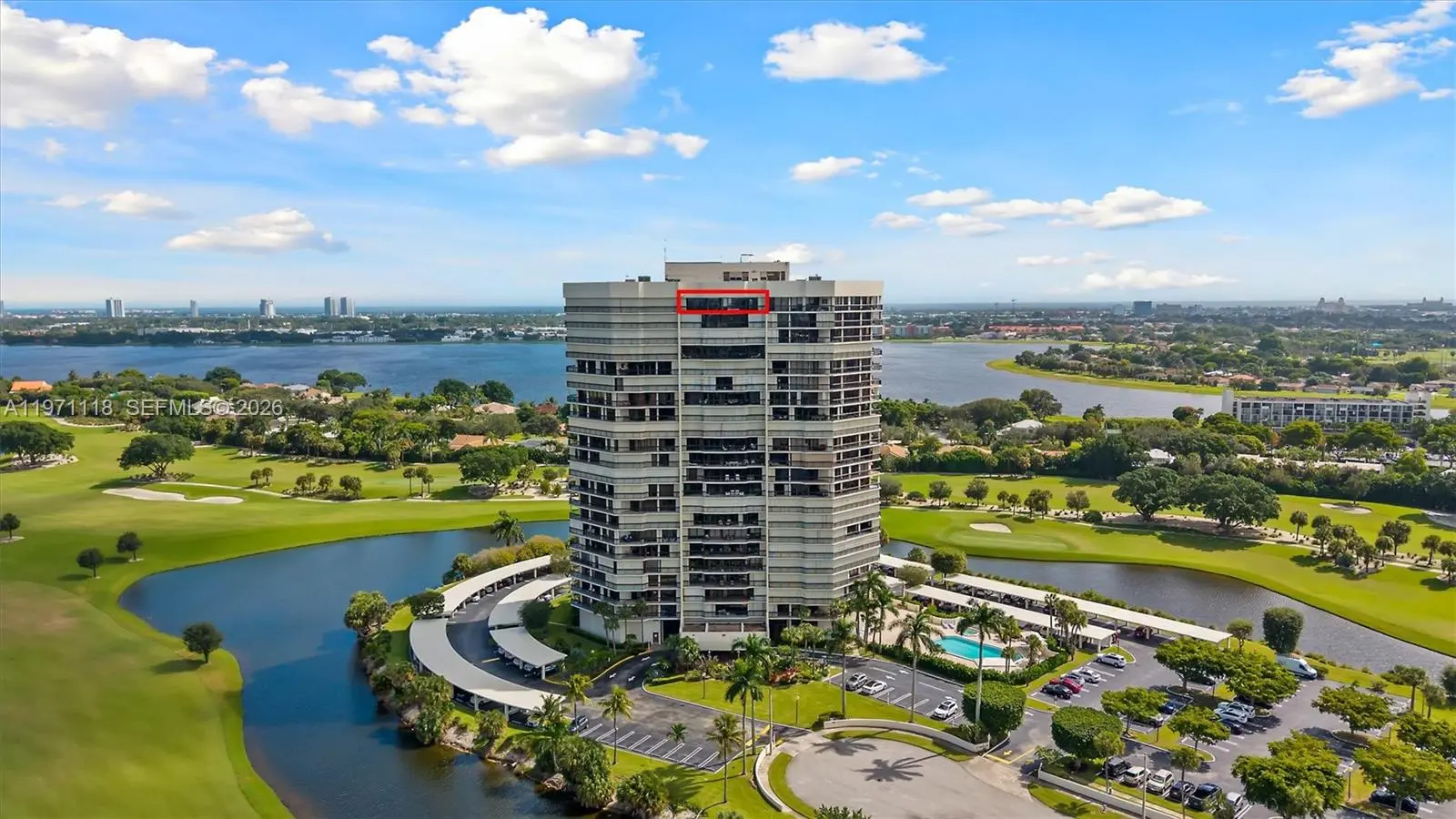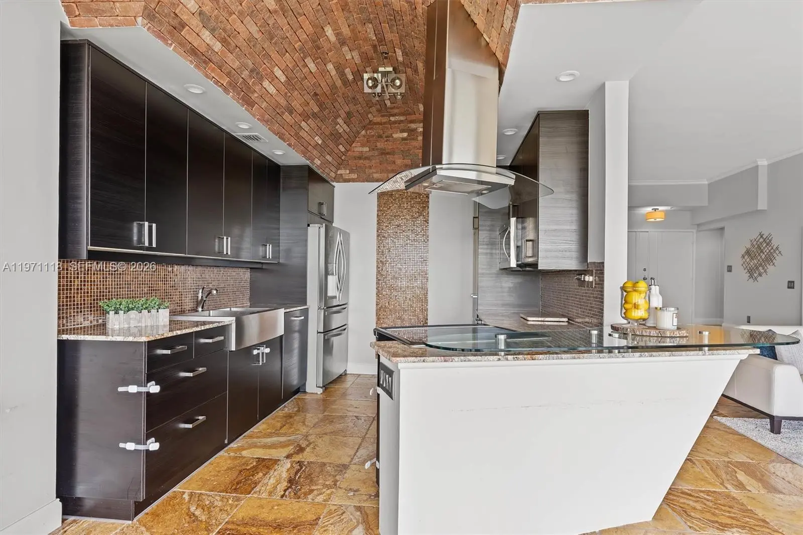 Experience penthouse living with breathtaking golf and city panoramas from a 50-ft balcony. This 2-bed, 2-bath residence spans 1,557 sq ft and blends architectural drama with modern sophistication. The featured vaulted brick ceiling and natural stone floors create a European-inspired ambiance, complemented by a remodeled kitchen with sleek cabinetry, granite counters, and mosaic accents. Spa-style baths showcase designer tile work and custom finishes, while motorized blinds add comfort and convenience. An assigned storage room on the same floor provides useful utility. The Consulate, a full-service tower within The Lands of the President, offers 24-hr security, pool and spa, fitness center, tennis, social room, and more. One assigned covered parking spot and plenty of guest spaces.