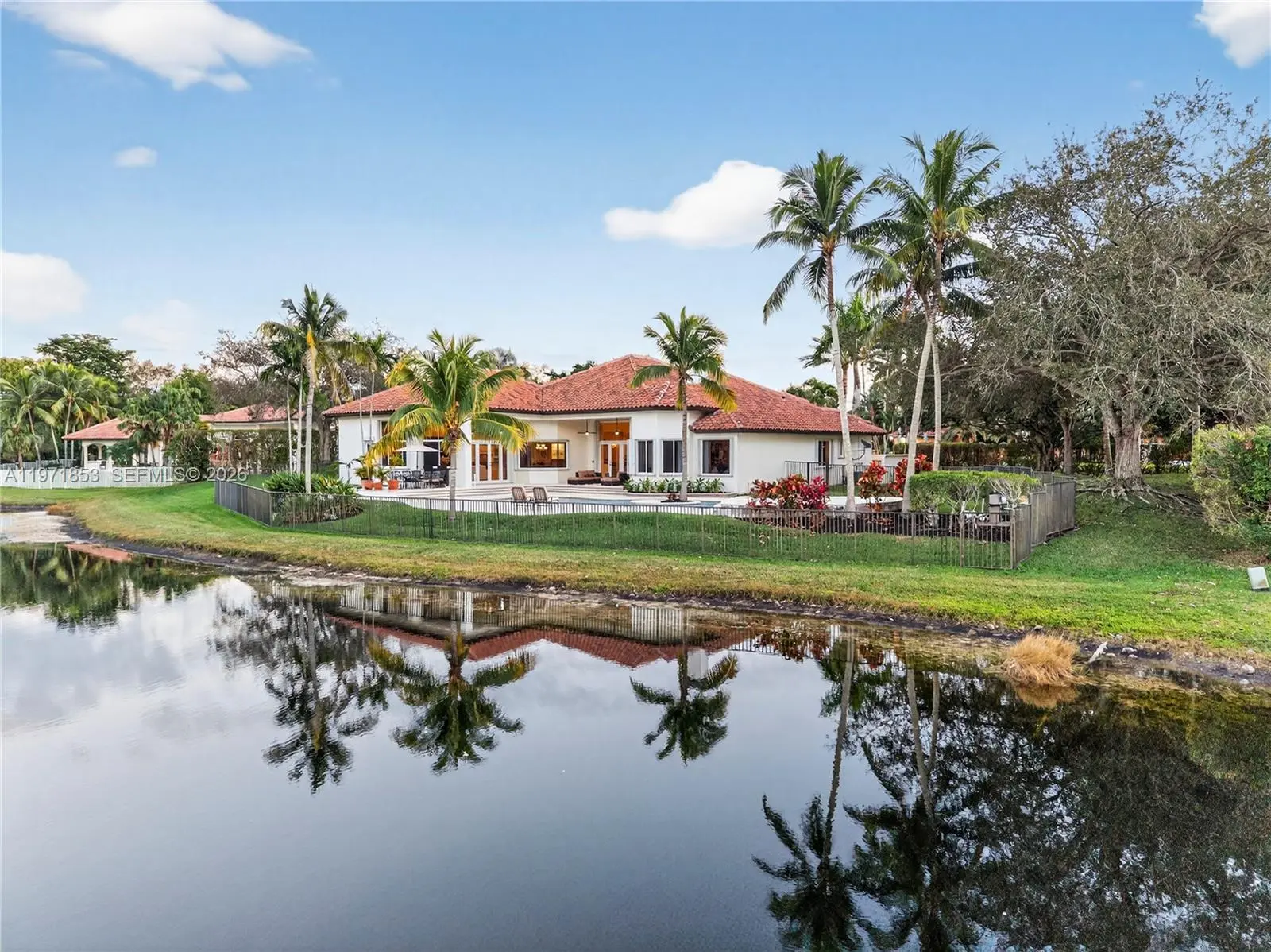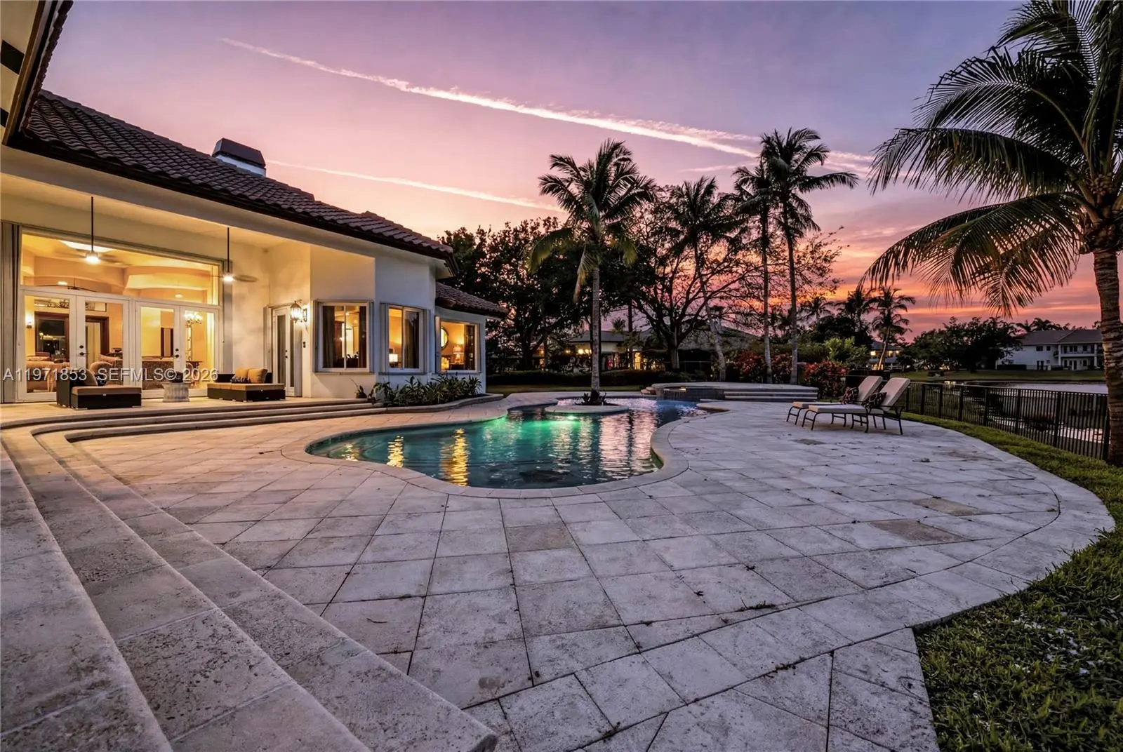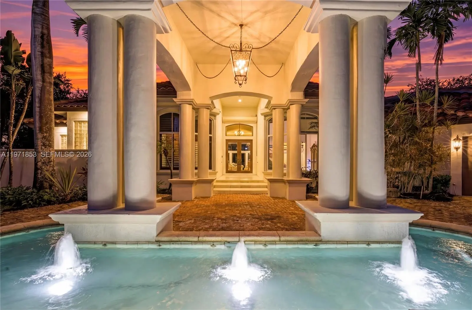 Experience refined living in Westons most prestigious guard gated community, Windmill Ranch Estates. From the moment you arrive, a grand fountain entrance sets the tone for the elegance that awaits you inside.A stately Porte Cochere provides both architectural distinction and convenient covered access, creating a dramatic first impression. Step through the large entrance doors to discover expansive living spaces designed for both luxurious entertaining and comfortable everyday living. Each of the 5 spacious bedrooms offer privacy and comfort, with beautiful appointed en suite bathrooms. There is also an additional library/ office with cherry wood floors and high ceilings.The primary suite serves as a private retreat, designed for relaxation and tranquility. The home features 2 fireplaces, adding warmth and ambience to formal and informal gathering areas alike.Soaring ceilings, abundant natural light, and refined finishes elevate every room. At the heart of the home is the gourmet kitchen which is a chefs dream appointed with high end appliances, custom cabinetry, generous counter space, and an ideal layout for hosting dinners and celebrations. outdoors your private oasis awaits. Enjoy year round Florida living with a resort style pool and spa, surrounded by lush landscaping and ample patio space for entertaining or unwinding in complete serenity. Once you experience your first sunset , you will be hooked.