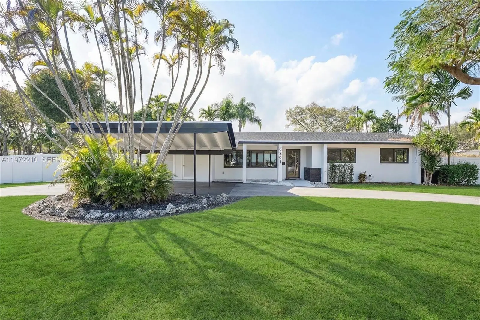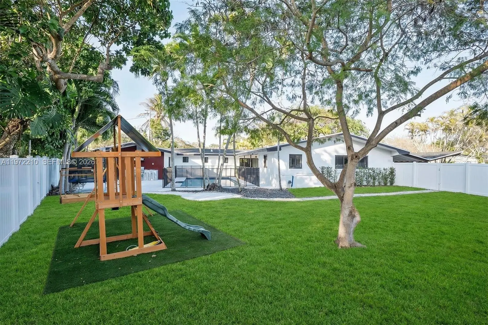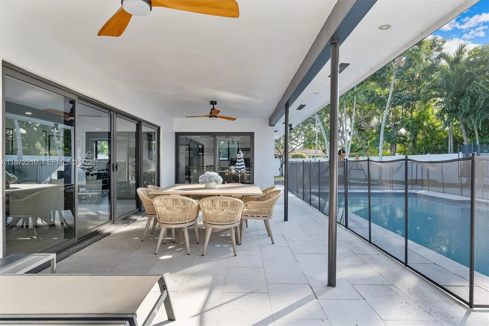 Located in Mangowood, this beautifully renovated single-story residence offers 2,525 square feet with 5 bedrooms and 3 full bathrooms. Updates include a new roof (2023), remodeled kitchen and baths, new flooring, impact windows, two new A/C systems (2024), smart thermostats (2025), and an on-demand water heater and electrical panel (2026), providing peace of mind for many years to come. Designed for seamless indoor-outdoor living, the home wraps around the pool, creating a serene, private oasis. Expansive sliding glass doors and windows fill the space with natural light. Multiple outdoor living areas include a covered terrace, dedicated BBQ space, and generous yard areas on both sides of the 16,334 sqft corner lot. The flexible layout supports multigenerational living or evolving needs. Generous closets and ample parking add everyday ease, all just moments from top schools, shopping, and fitness. Mortgage savings may be available for buyers of this listing.
