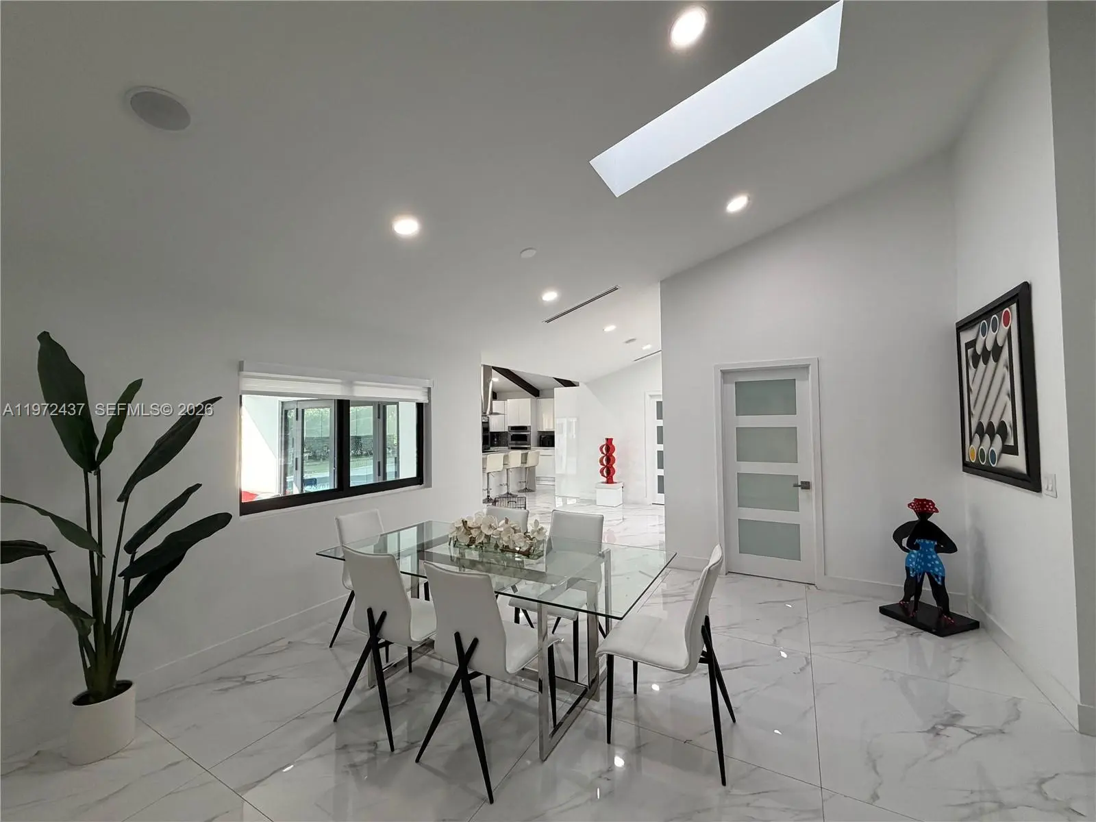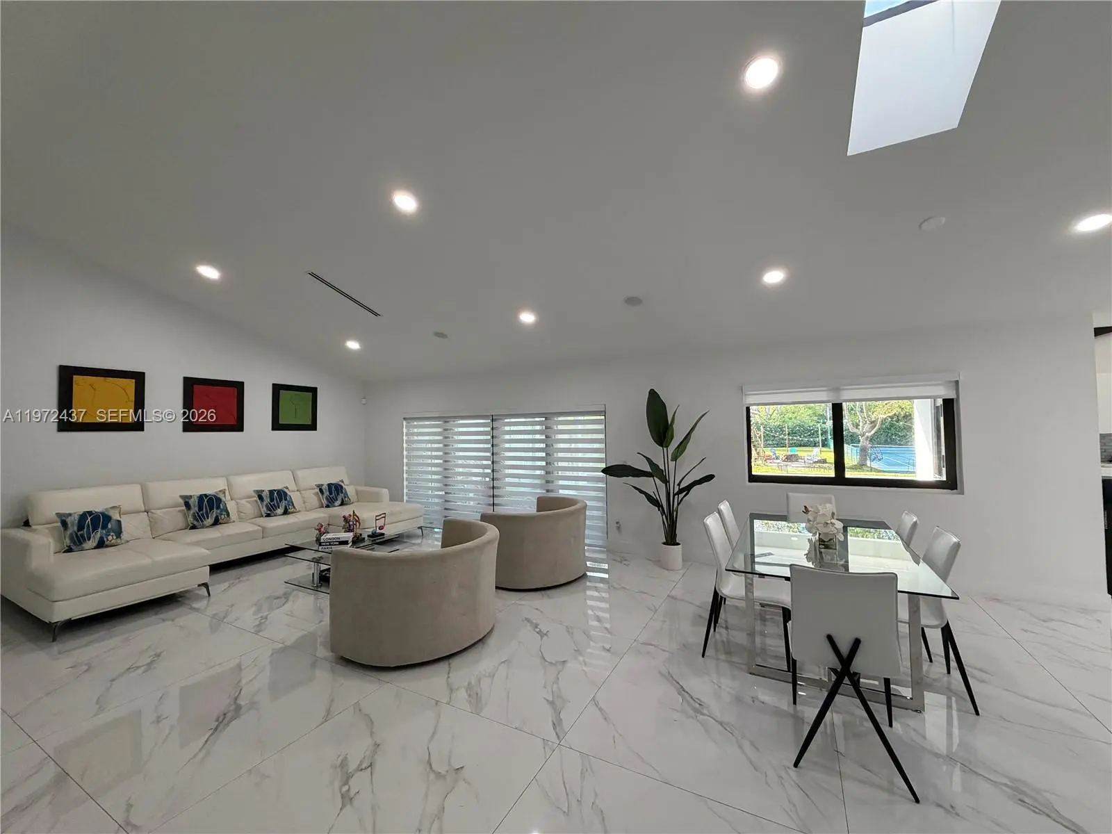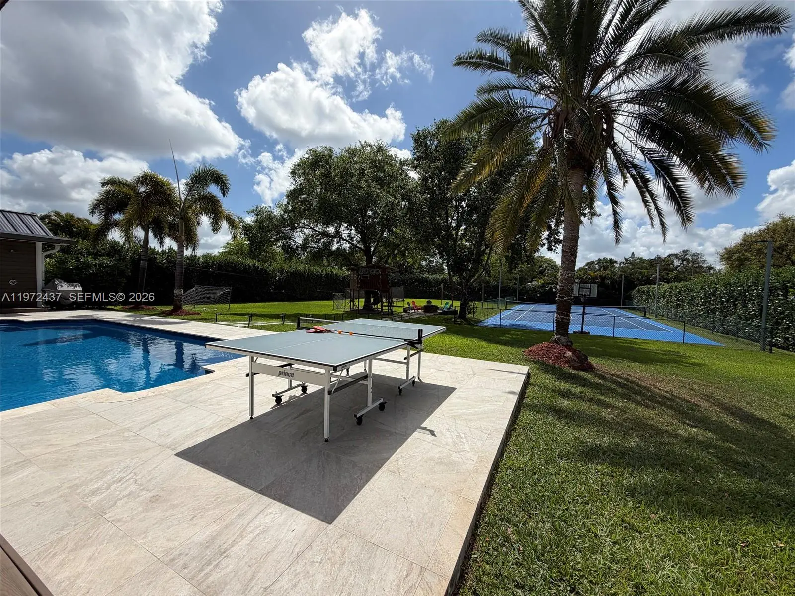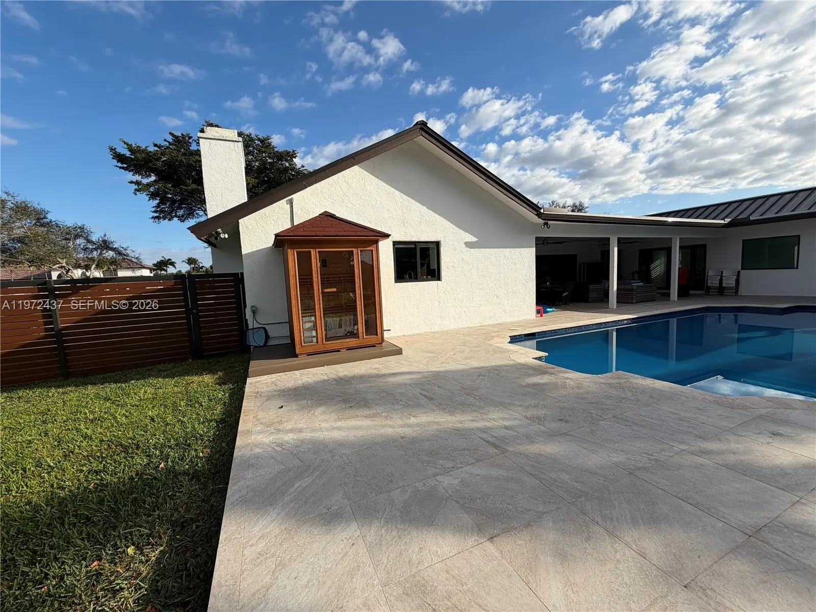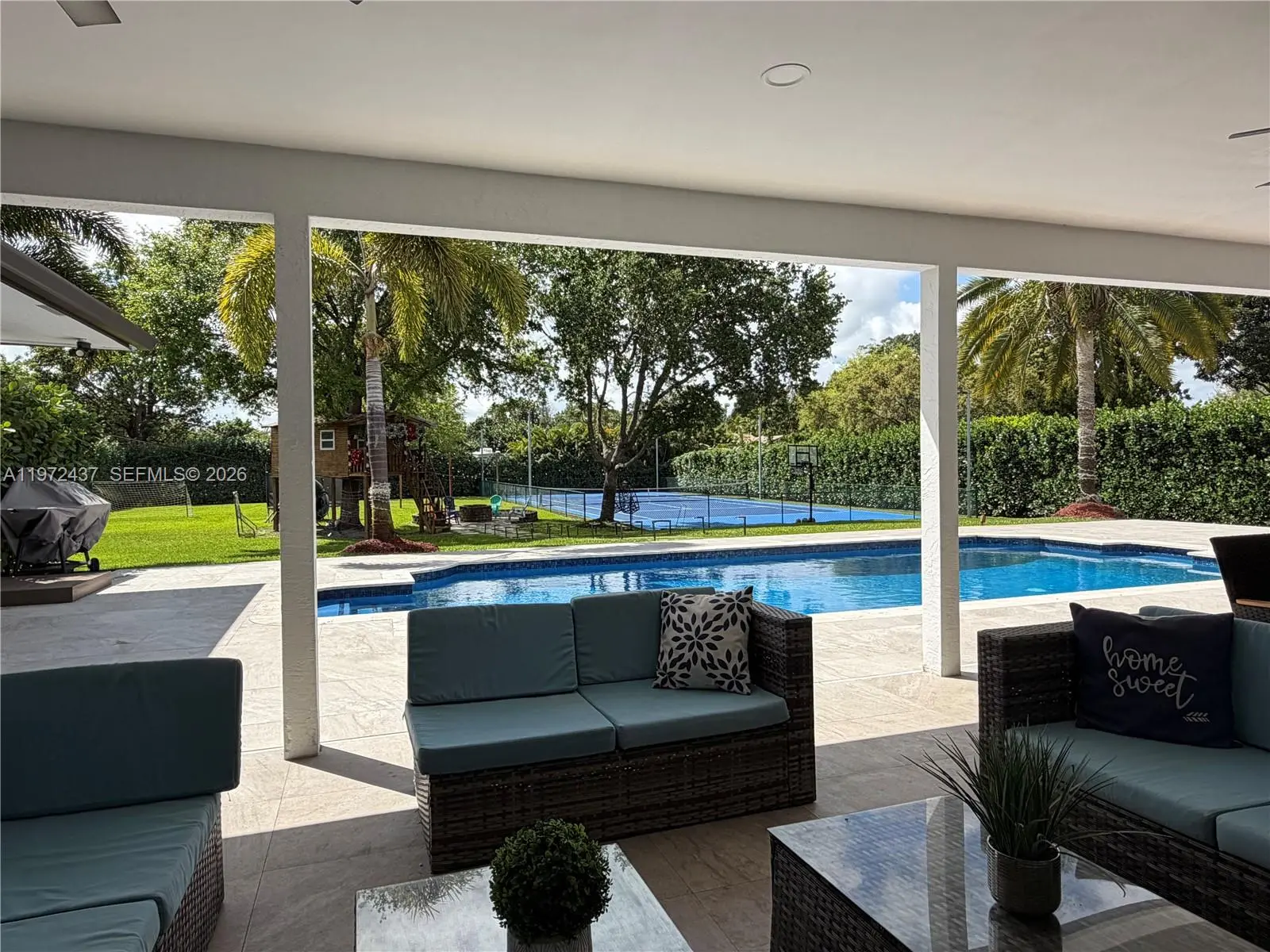 Welcome to one of the most comprehensively renovated luxury residence and resort-level amenities rarely found in this market. Recently completed and meticulously upgraded with timeless finishes and long-term value enhancements. Every detail was curated to create a clean, expansive and sophisticated living environment that meets the expectations of high-end buyers. This private acre home fully renovated to deliver a true luxury, move-in-ready experience. Every detail of this residence was thoughtfully transformed approximately one year ago, blending timeless elegance with modern sophistication. Calacatta flooring, a stunning designer kitchen with an oversized island, and spa-inspired bathrooms featuring Calacatta vanities and frameless glass. Motorized blinds, whole-house audio, impact windows, and new A/C ductwork enhance both comfort and convenience. Outdoors, the property lives like a private resort. Enjoy a beautiful pool with new equipment, sauna, outdoor shower, tree house, and a remodeled terrace ideal for entertaining. The professionally tennis court also adaptable for basketball, soccer and multi-sport use, makes this home truly exceptional. Resort-style landscaping with Mature privacy hedges surrounds the fully fenced acre, creating a serene and exclusive setting. Lifetime metal roof, new flat roof, and premium upgrades throughout, this is your opportunity to own one of the most comprehensively renovated homes in the area. Luxury. Privacy. Lifestyle. All on one acre.
