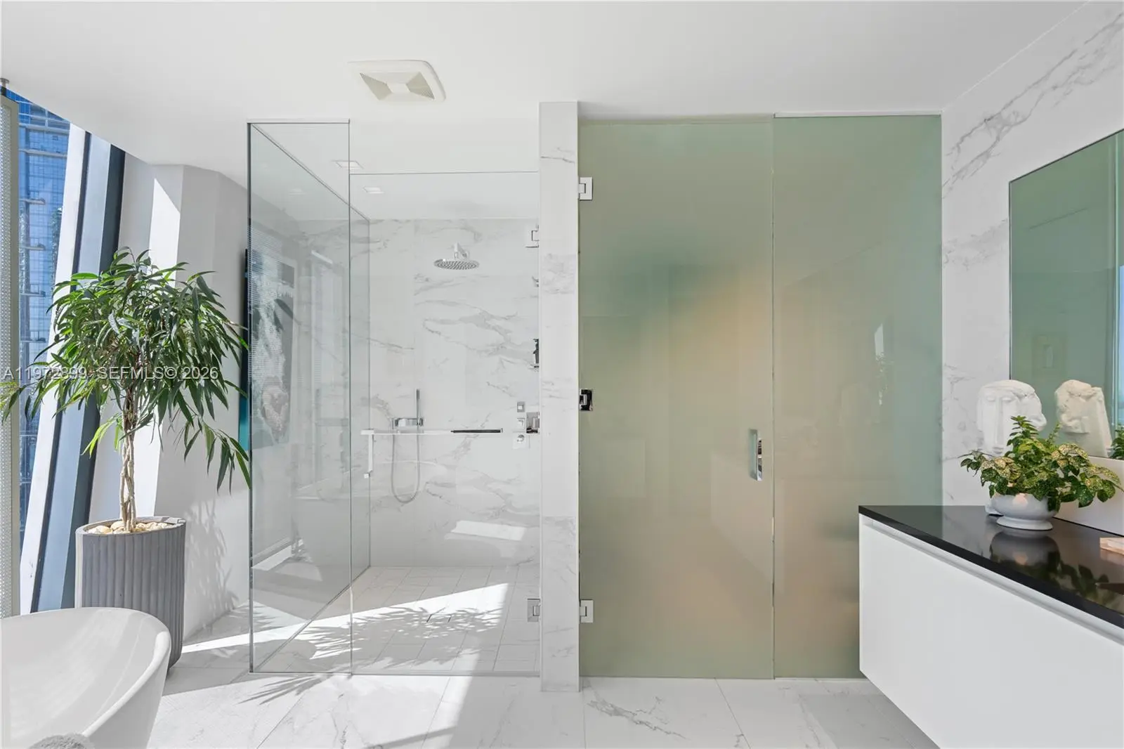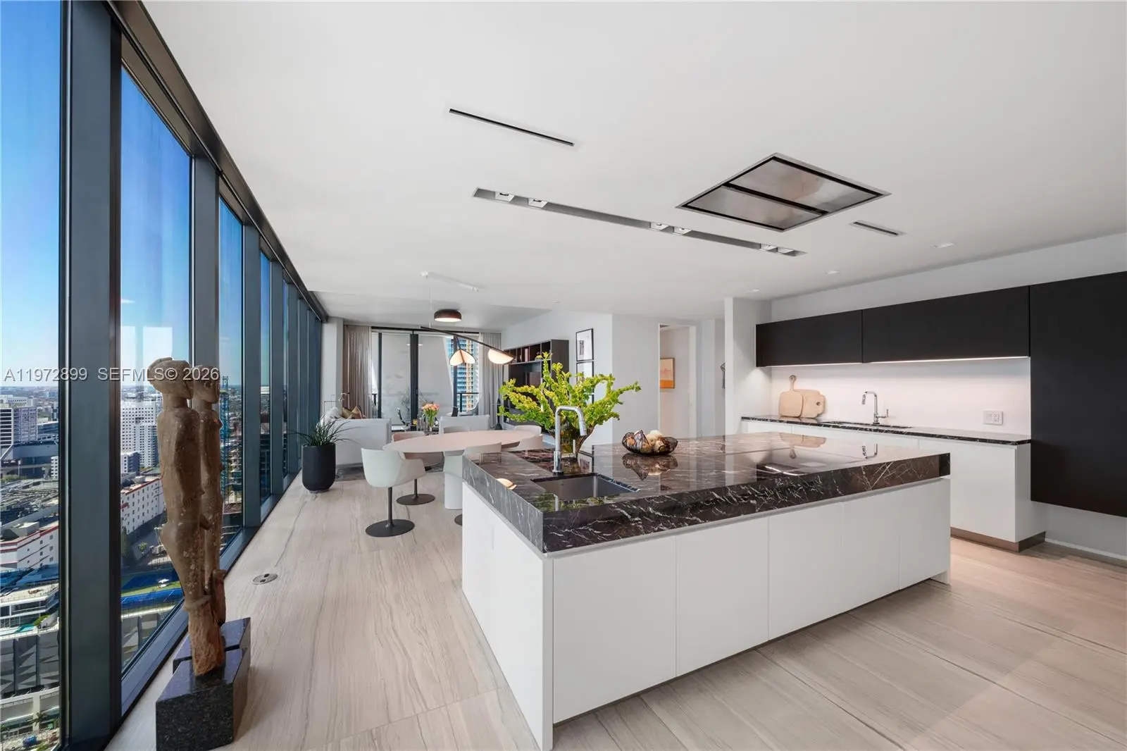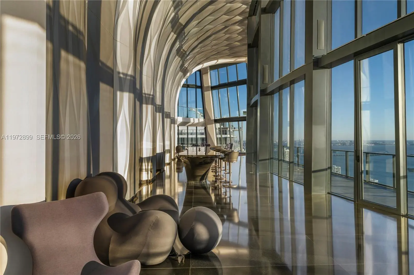 Perched on a high floor at One Thousand Museum, this meticulously appointed 4-bedroom, 5.5-bathroom residence commands sweeping panoramas of Biscayne Bay and the city from sunrise to sunset. Spanning 4,600 square feet of interior living with 780 square feet of private terrace space, this is Miami luxury at its most elevated. Step through a monumental glass entry door into a foyer finished in rich oak millwork and handcrafted Venetian stucco walls. The main living area is anchored by iconic Fendi sofas and a Baxter dining table surrounded by custom millwork, while a dedicated wet bar with Sub-Zero wine refrigerator makes entertaining effortless. The custom Italian Poliform kitchen stuns with dramatic onyx marble countertops and a full suite of Gaggenau and Sub-Zero appliances. The primary suite offers a serene marble morning bar and a bespoke Molteni closet system. The Carrara marble bath features a rainfall shower, spa-caliber soaking tub, and Studio RODA privacy screen. Guest rooms are beautifully appointed with Molteni cabinetry and custom built-in bookcases. Dornbracht and Duravit fixtures throughout, with Crestron automated shading, Sonos audio, and Ornare laundry cabinetry completing this extraordinary turnkey residence. Offered fully furnished.