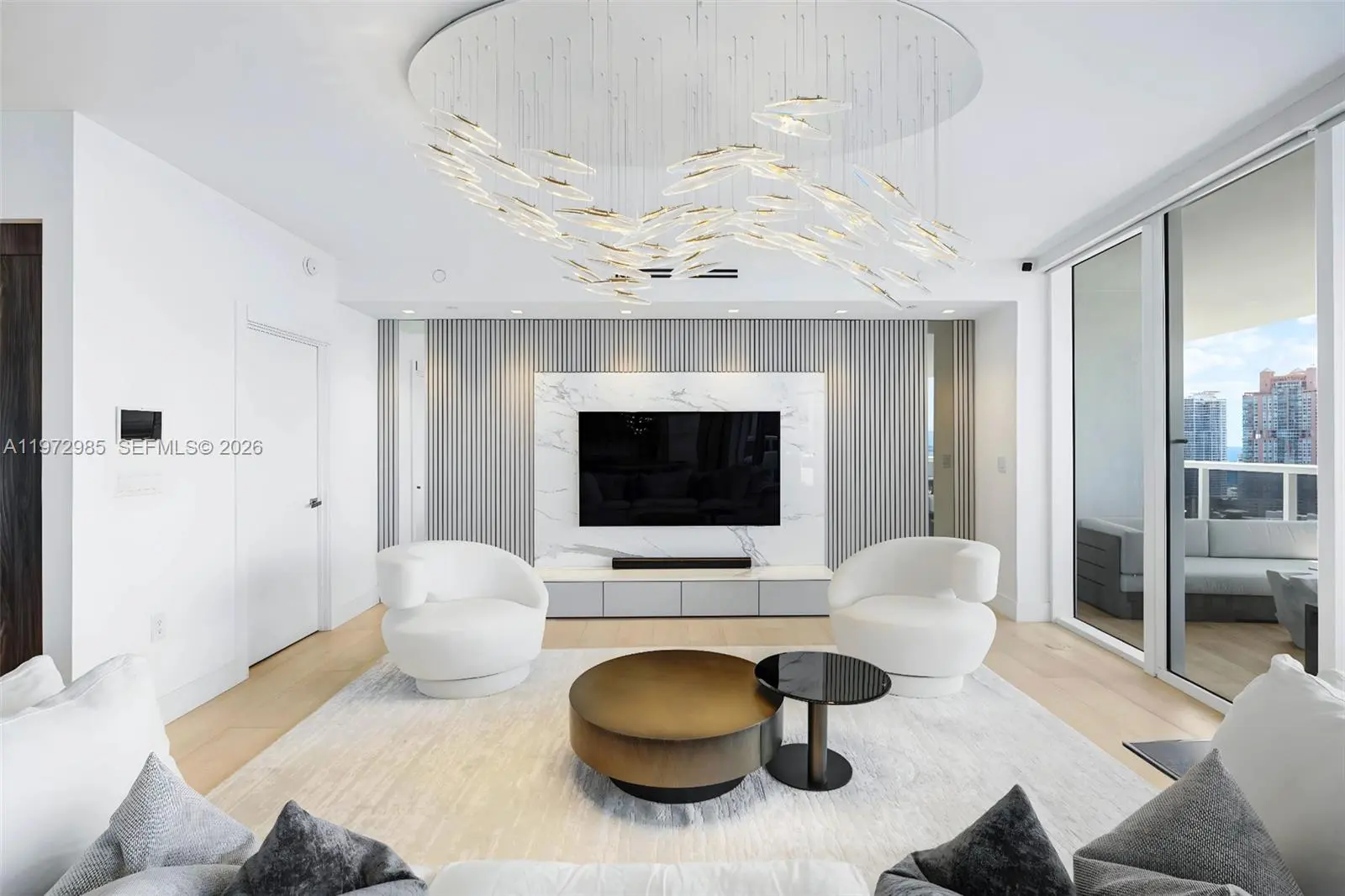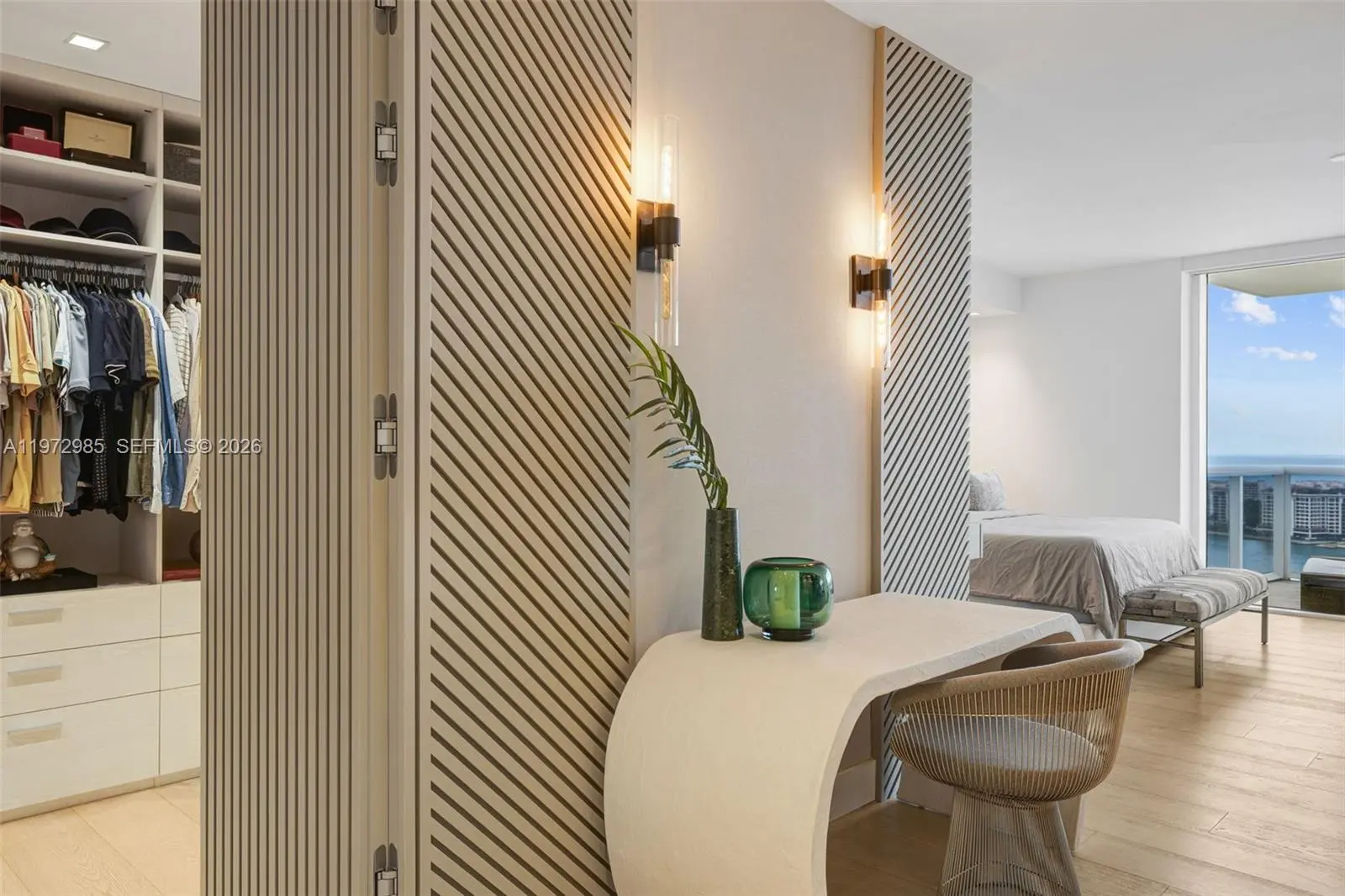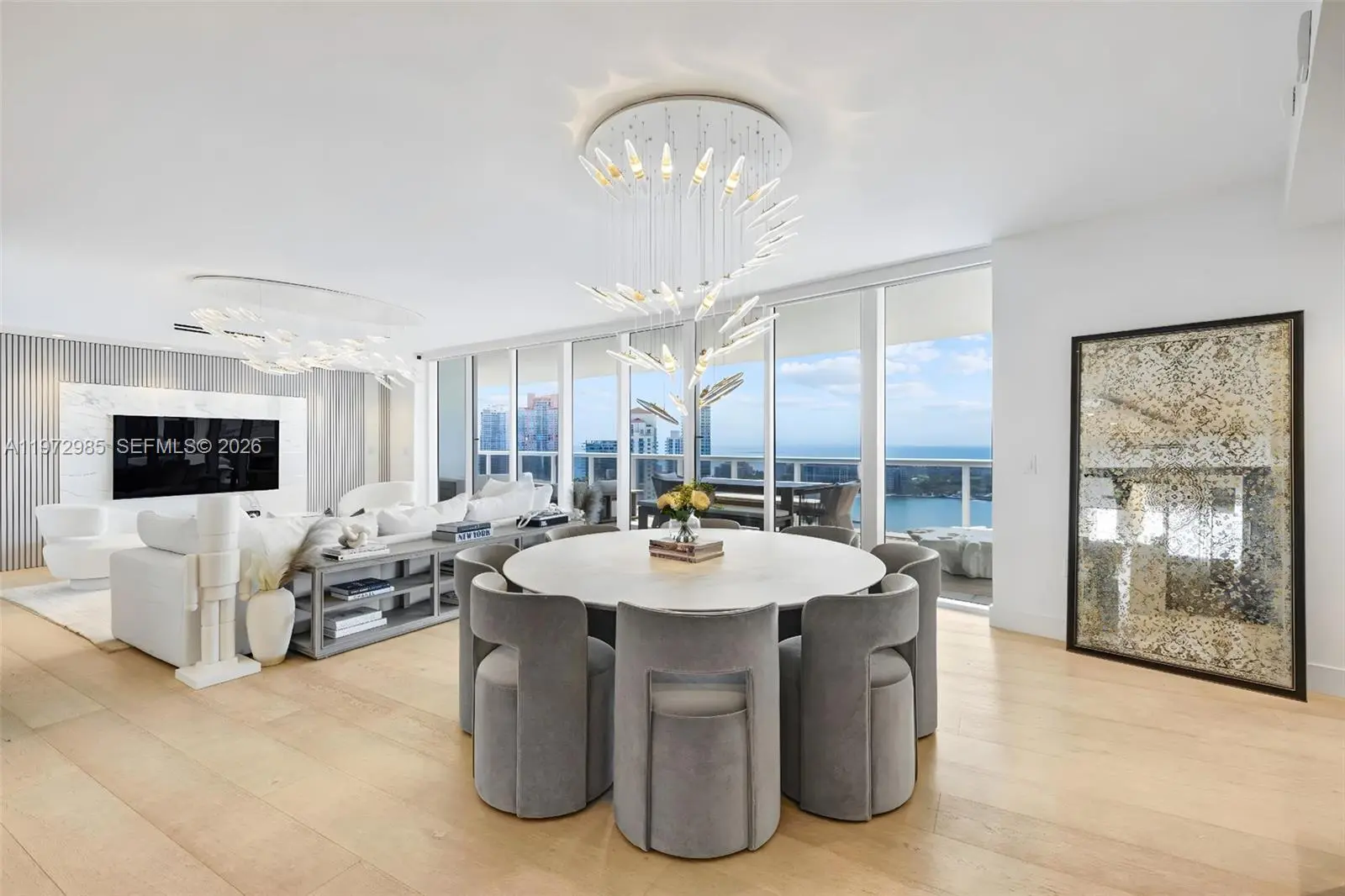 Welcome to this beautifully renovated residence at Murano Grande, perfectly situated in Miami Beach’s highly sought-after South of Fifth neighborhood. This stunning 2-bedroom, 2.5-bath home has been completely redesigned with no expense spared and impeccable attention to detail throughout. The residence features custom millwork in the living room and throughout the bedrooms. The kitchen is equipped with premium Miele appliances and a full wine refrigerator, complemented by custom cabinetry and high-end finishes. Designer chandeliers add an elegant touch, while spacious walk-in closets are fully built out for optimal storage and organization. The home is outfitted with automatic blinds and shades, integrated lighting, a built-in sound system, and a security system, all seamlessly controlled through Control4 smart home technology. Floor-to-ceiling windows showcase beautiful water views from every room and fill the residence with an abundance of natural light. Step out onto the expansive private balcony, perfect for relaxing or enjoying breathtaking sunset views over the water. Offered fully furnished for a truly turnkey luxury living experience.