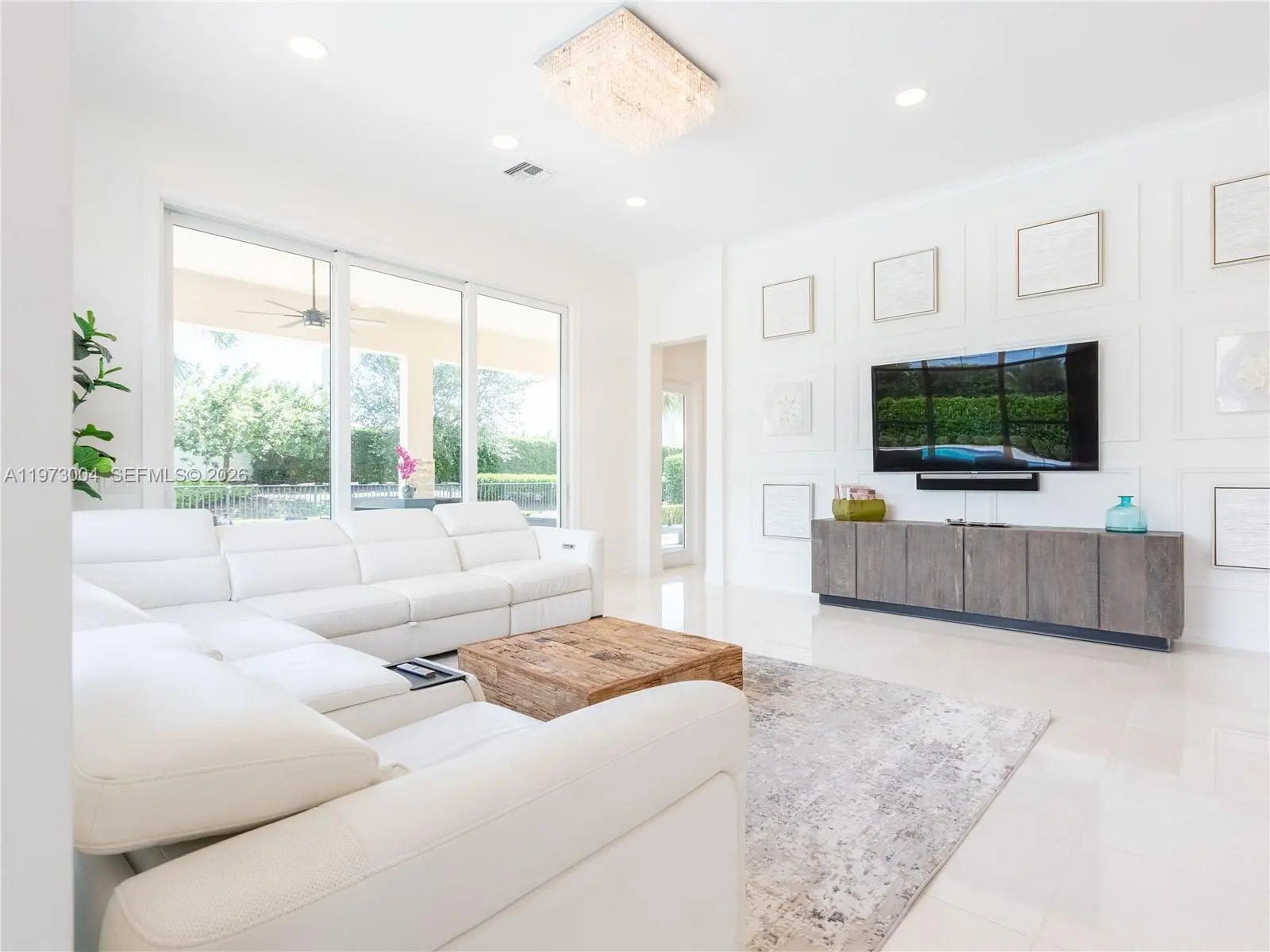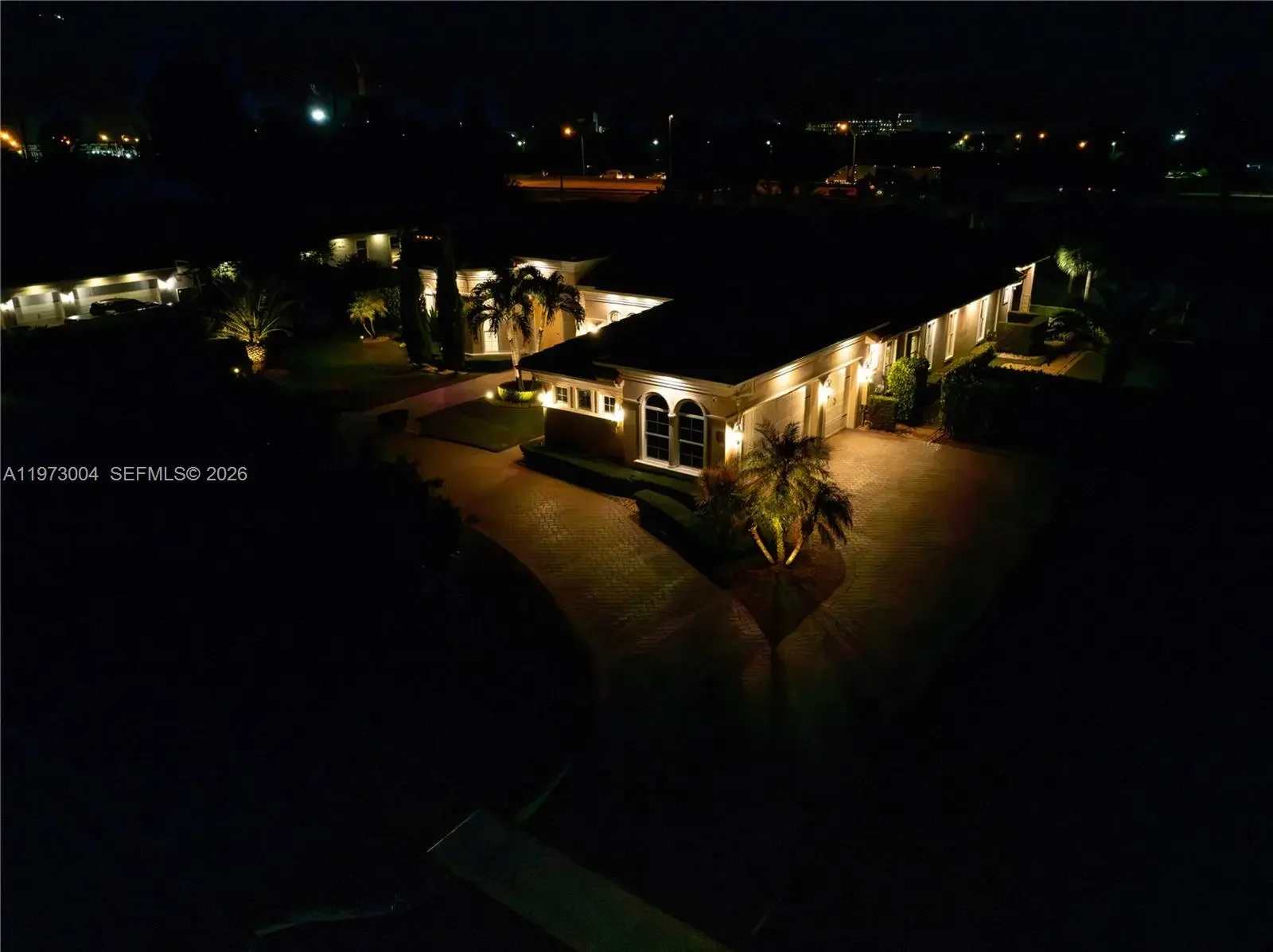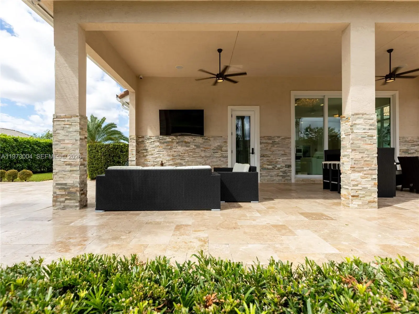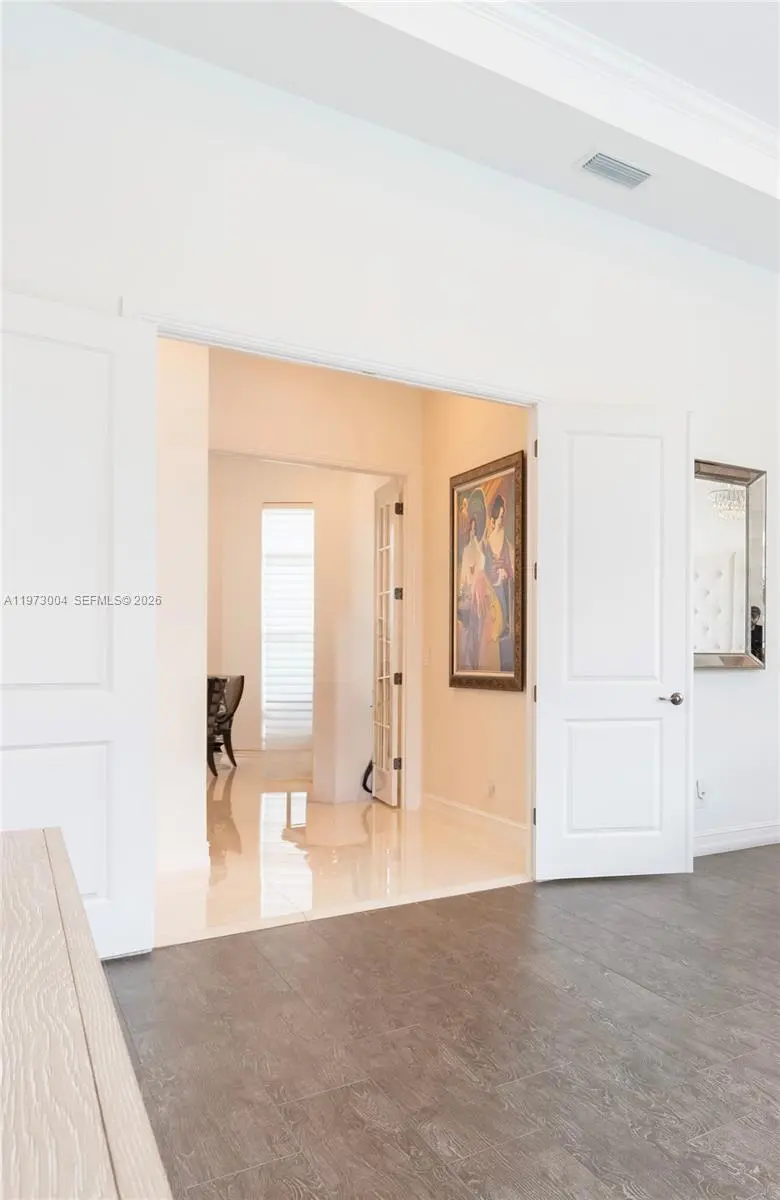 Located in the prestigious gated community of Sterling Ranch, this custom single-story estate offers refined design and effortless indoor-outdoor living with a direct view of the Hardrock Guitar Hotel. A grand circular paver driveway and manicured landscaping create striking curb appeal and plenty of parking. Inside, 12-foot soaring ceilings, polished stone floors, and expansive windows fill the home with natural light. The open-concept layout features a seamless flow into the chef’s kitchen oversized quartz islands, custom cabinetry, stainless steel appliances, double ovens, wine refrigeration. The primary suite overlooks the pool and features a spa-inspired bath with dual floating vanities, freestanding soaking tub, and oversized glass shower. Secondary bedrooms are generously sized while each additional bedroom includes its own ensuite bath for exceptional comfort and privacy. Step outside to a resort-style backyard with freeform pool, integrated spa, expansive travertine decking, and covered lanai. Lush hedging provides privacy while maintaining an open feel. Additional upgrades include a whole-home water filtration and softener system, central vacuum, tankless water heater, impact windows and doors, a circular paver driveway, and a three-car garage for extensive parking. Ideally located minutes from the Turnpike, I-95, I-75, Fort Lauderdale Airport, this home delivers luxury, convenience, and lifestyle in one package. HOA includes all landscaping, trimming and mowing.